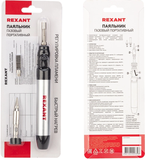 Температура пламени: +800гр; Рабочая температура жала: +500гр; Заправляемая емкость: 15мл. В комплект поставки входит две сменные насадки, поэтому прибор можно использовать не только как паяльник, но и как горелку.
