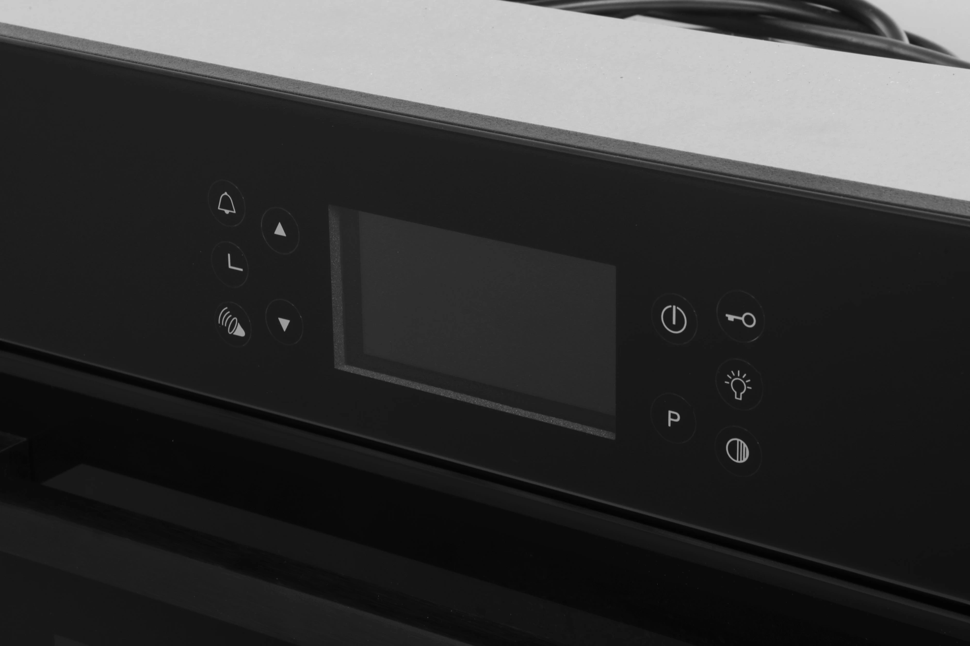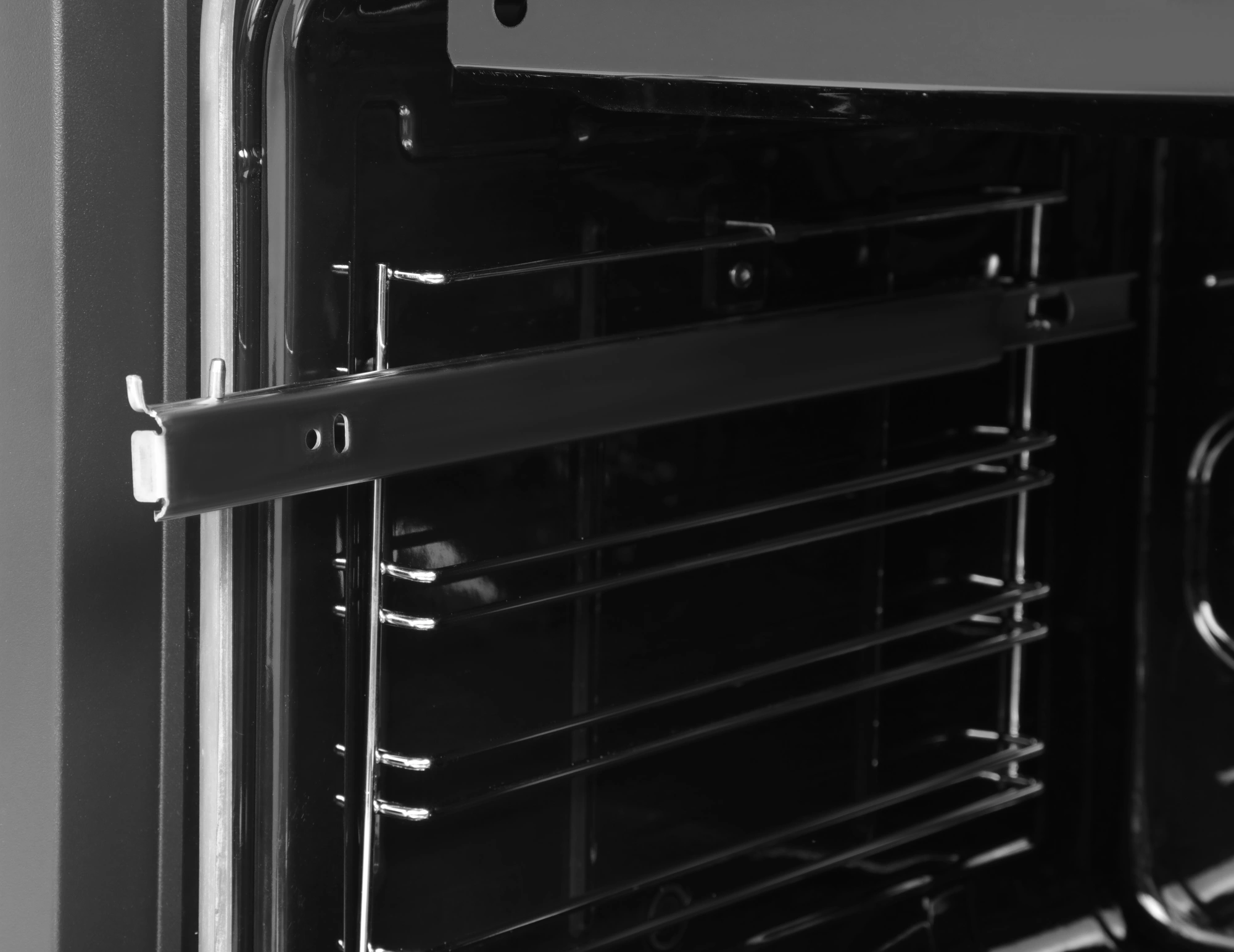 вентилятор охлаждения, дисплей, полностью стеклянная внутренняя поверхность дверцы духовки, телескопические направляющие, электронный программатор