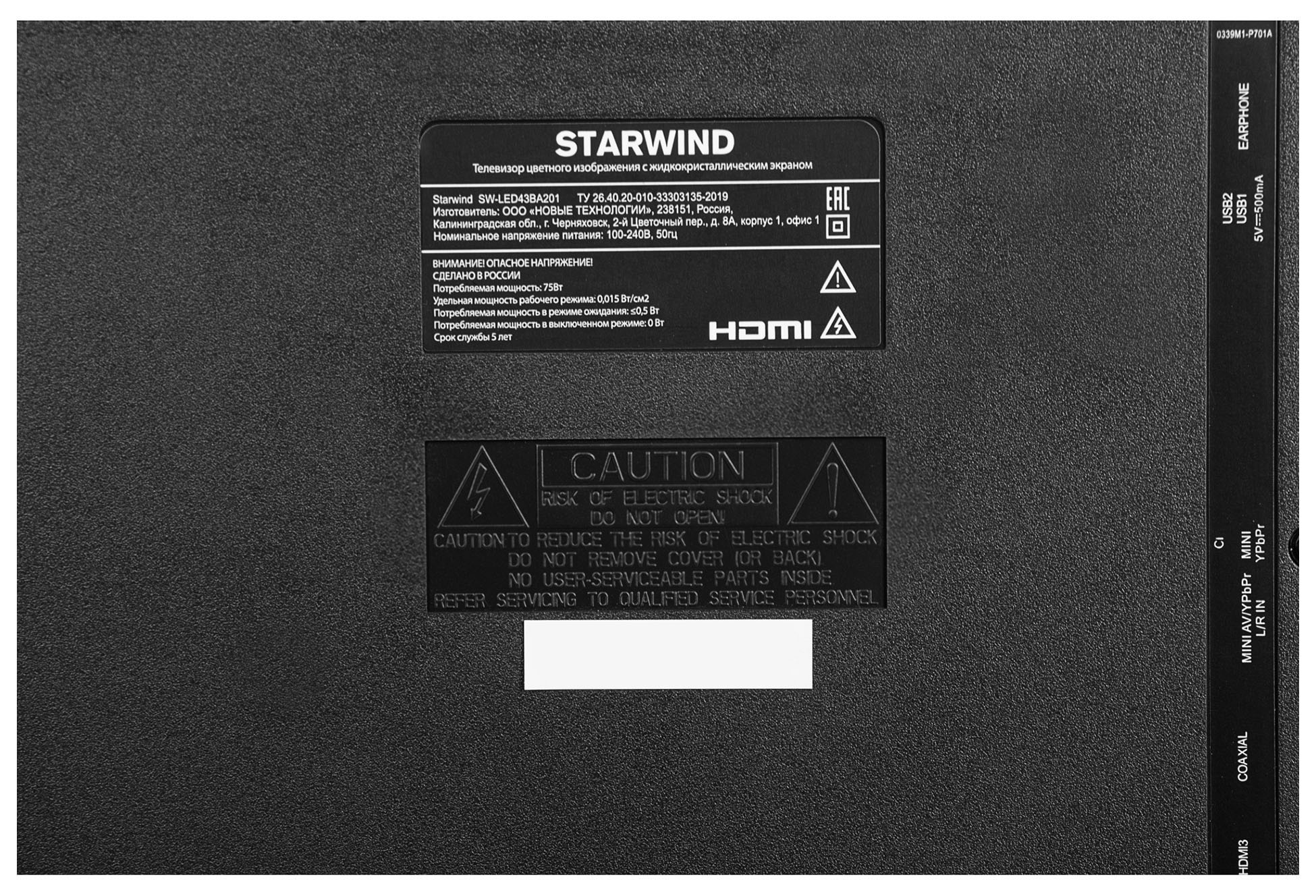 Относительно энергопотребление телевизор LED STARWIND 43" SW-LED43BA201 в рабочем режиме потребляет 75 Вт, в то же время в режиме ожидания, то есть выключенном, всего 0,5 Вт. Для подключения предусмотрено несколько разъёмов и портов среди которых: один антенный вход, разъем Scart, разъем d-sub, компонентный разъем и один композитный для видео, по одному разъему для stereo audio и для наушников, а также 2 USB разъема и три разъема HDMI, и по одному разъему Cl+ и S/PDIF.