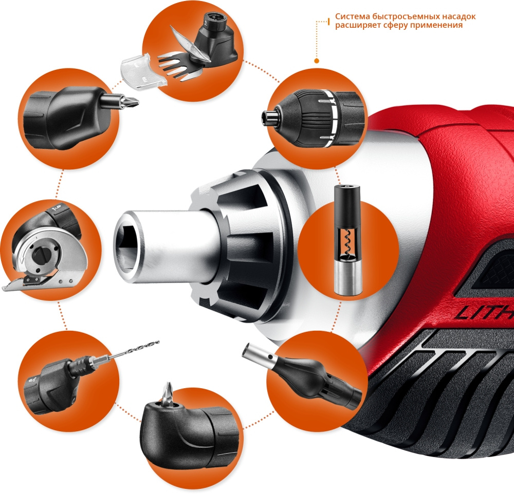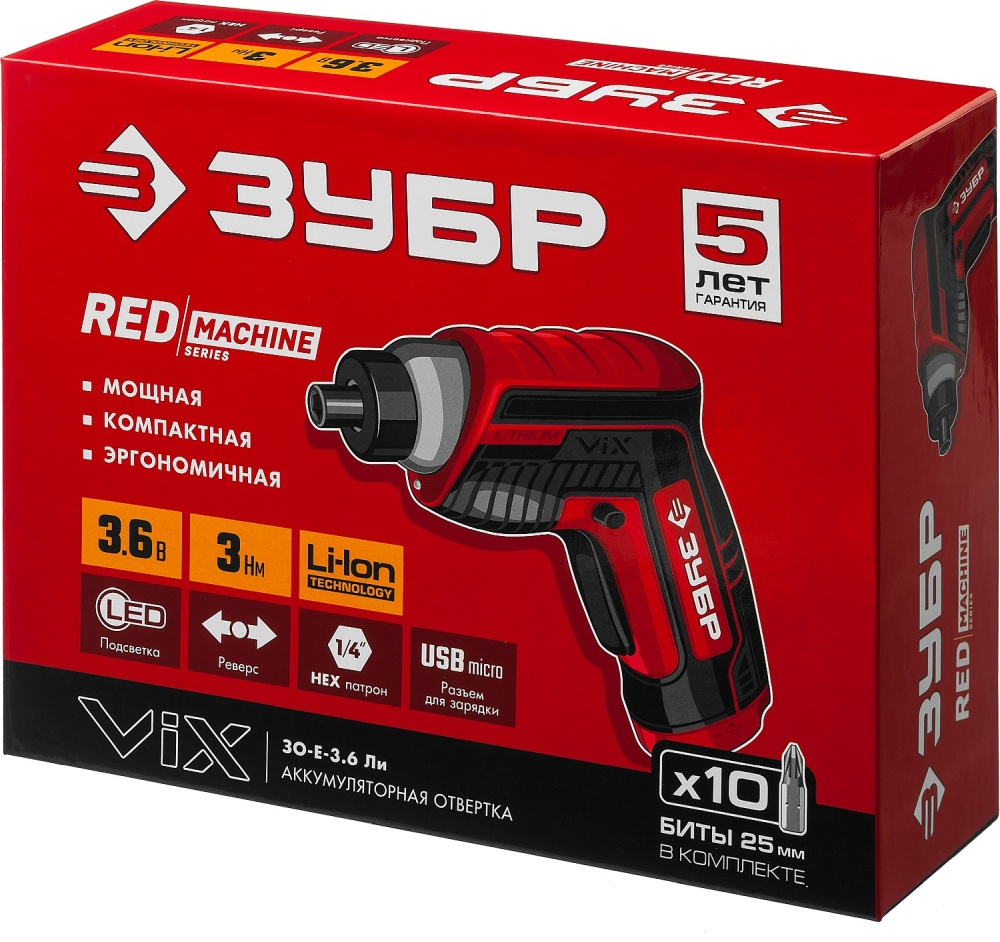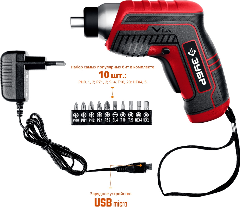Отвертка; Зарядное устройство; Биты 25 мм (10 PH0, PH1, PH2, PZ1, PZ2, S4, T10, T20, HEX4, HEX5)