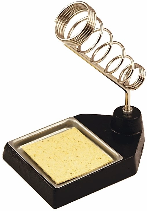 Выполнена из витой хромированной конусообразной пружины и металлической платформы с ложементом под губку для очистки жала паяльника от остатков припоя. Губка для очистки жала паяльника в комплекте.
