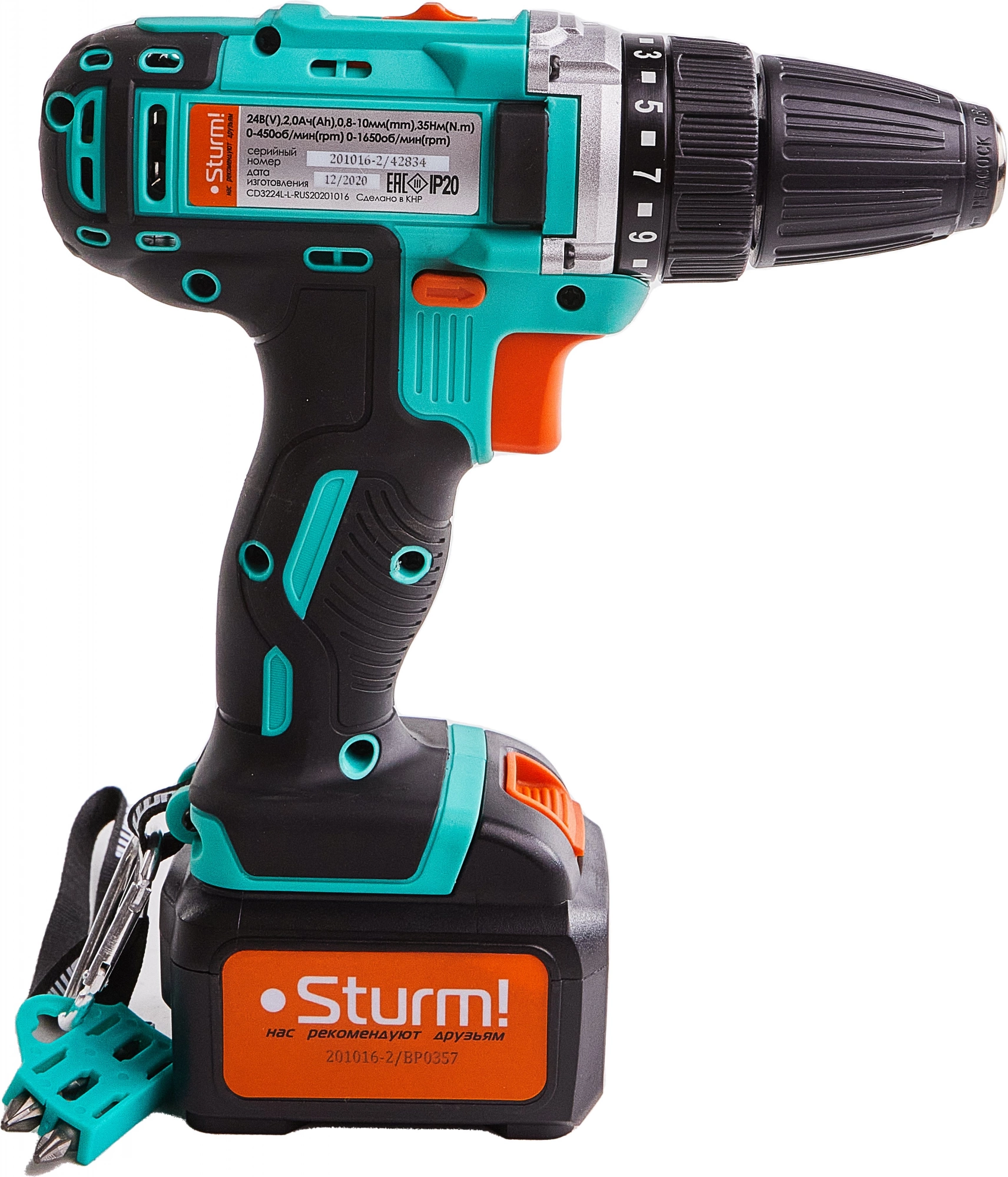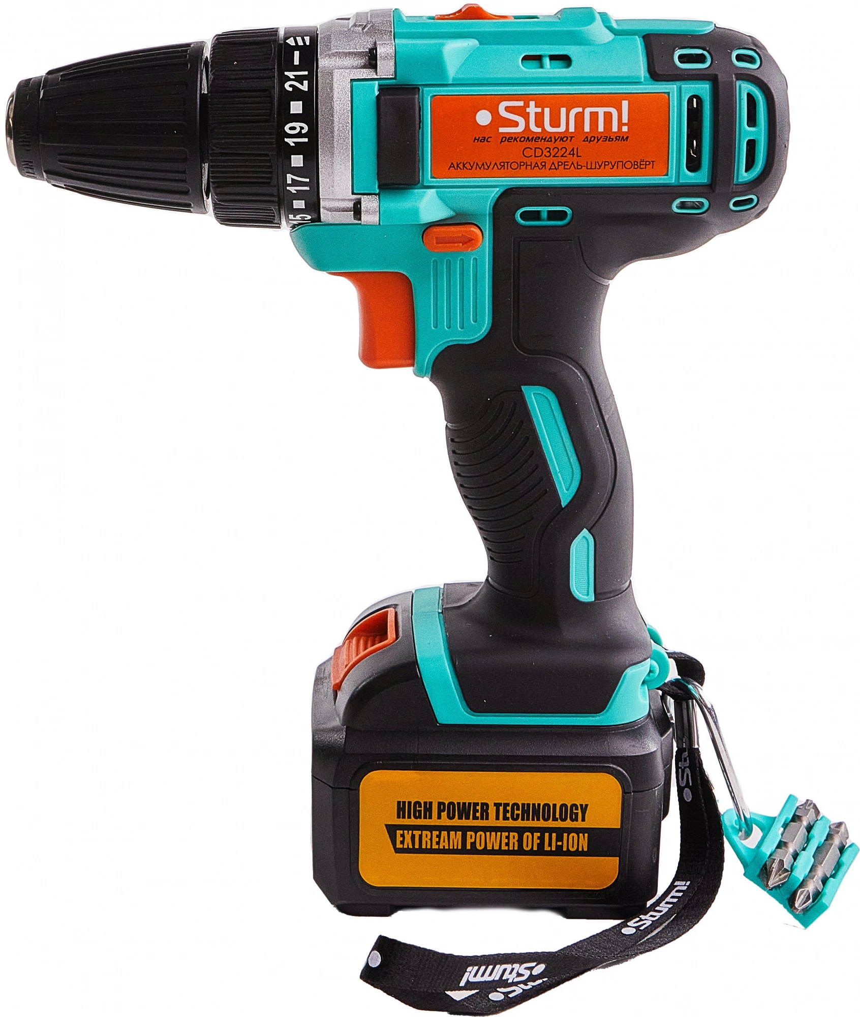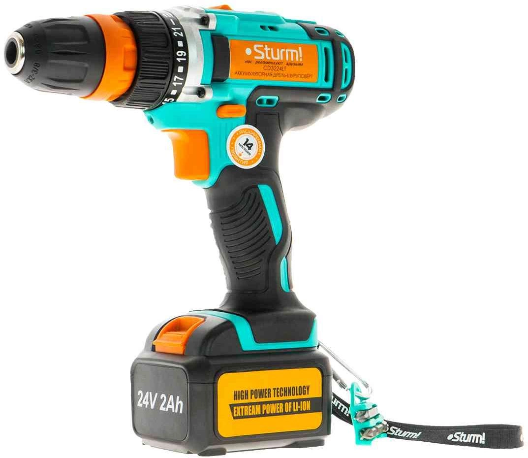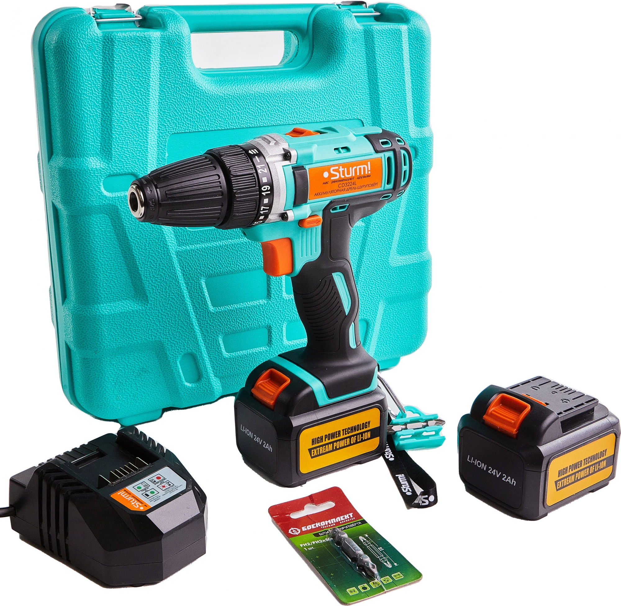 Дрель-шуруповерт аккумуляторная, аккумуляторная батарея (2 шт.), зарядное устройство, двусторонняя бита (2 шт.), инструкция по эксплуатации, инструкция по безопасности, пластиковый кейс.