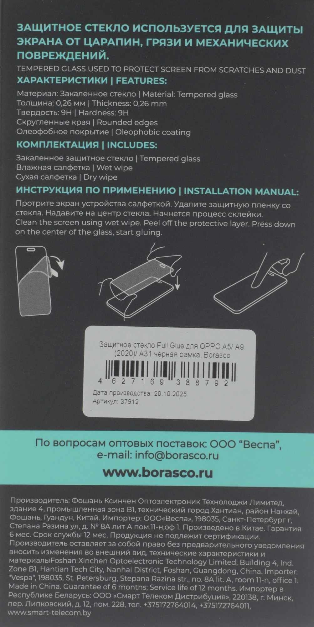 Закалённое стекло Borasco для OPPO A5/ A9 2020 предназначено для защиты экрана при падении, от царапин и потёртостей, олеофобное покрытие стекла передаёт приятные тактильные ощущения.