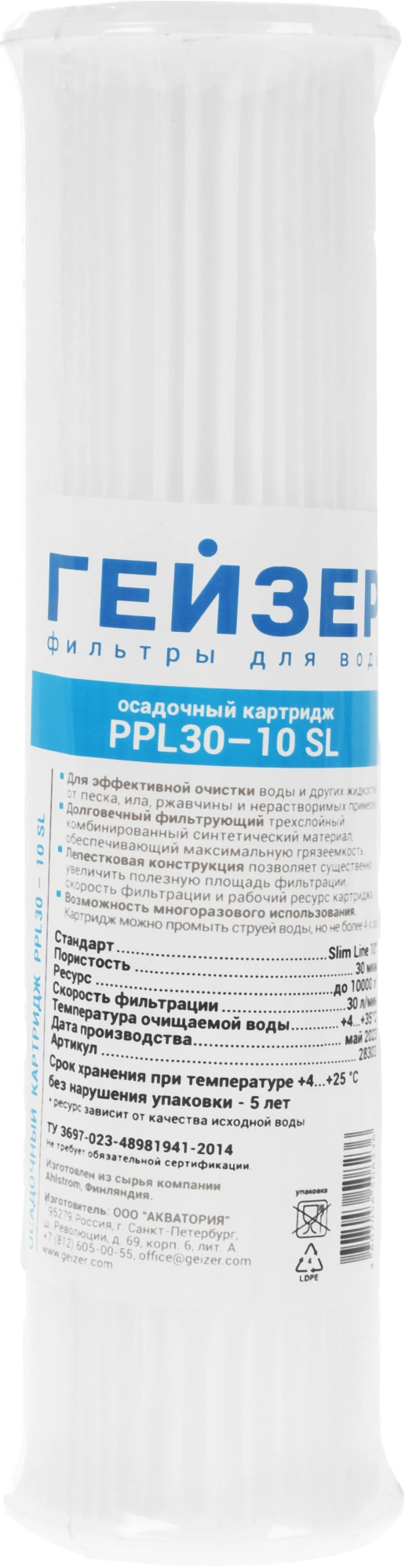 Картридж PPL30-10SL для холодной воды предназначен для эффективной очистки воды от песка, ила, ржавчины и других нерастворимых примесей. Способен улавливать мельчайшие частицы. Лепестковая конструкция позволяет существенно увеличить полезную площадь фильтрации, скорость фильтрации и рабочий ресурс.