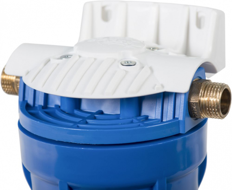 Корпус изготовлен из прочного прозрачного полипропилена. Крышка корпуса – из синего полипропилена с металлическими ниппелями, скоба - пластмассовая. Накидная гайка на корпусе значительно облегчает установку и замену картриджа.