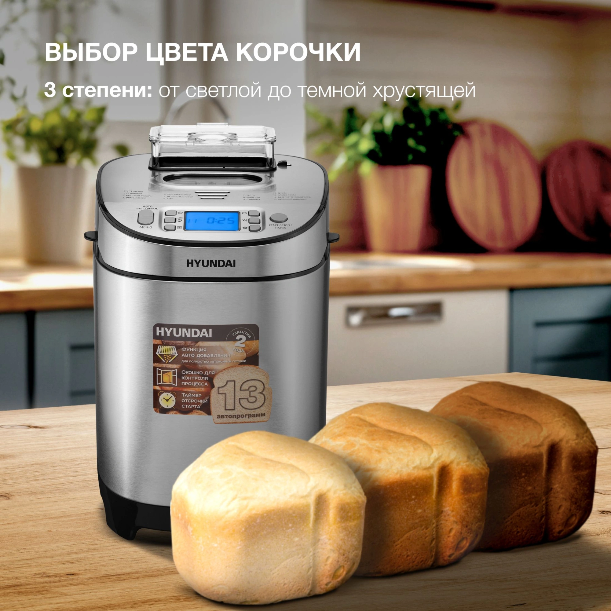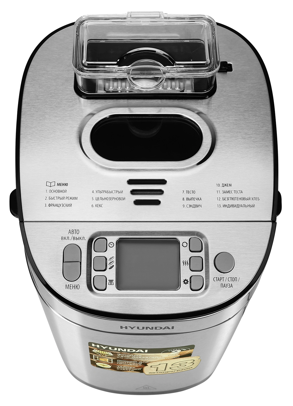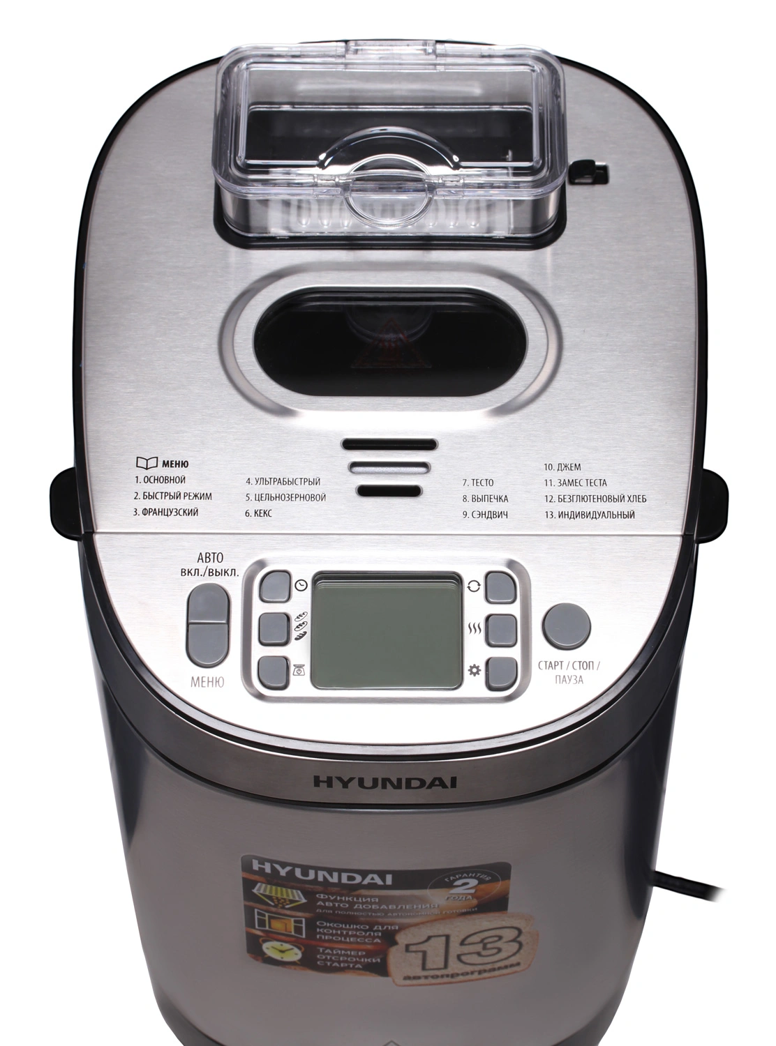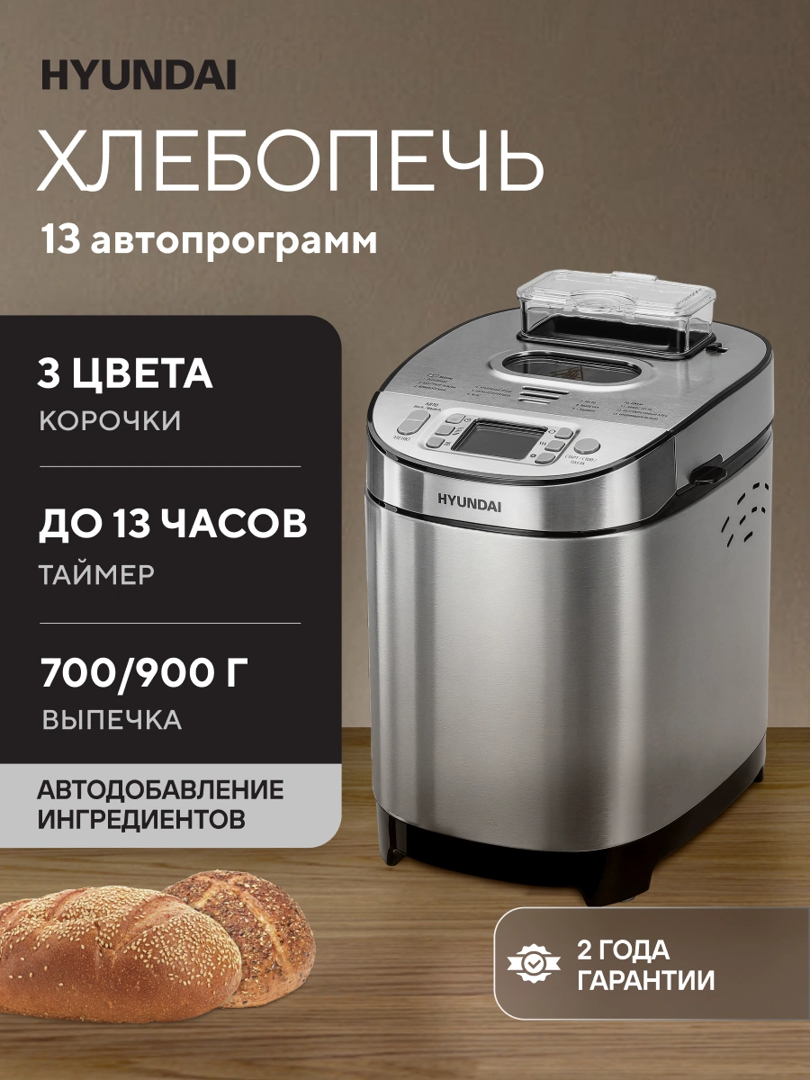 Хлебопечка Hyundai HYBM-M0313G отличается универсальностью, эргономичностью эксплуатации. Модель обладает привлекательным вешним видом, привлекает к себе внимание многофункциональностью. Мощность оборудования составляет 600 Ватт. Этого вполне достаточно, чтобы быстро приготавливать разнообразную выпечку. Бытовая техника имеет антипригарное покрытие, поэтому чистить ее с помощью специальных средств не придется. Максимальный вес приготовленной выпечки будет составлять 900 грамм. У кухонного оборудования предусмотрена регулировка веса создаваемой продукции, что крайне удобно. Сверху устройства предусмотрена герметичная крышка, есть дисплей, на котором отображаются все данные о его работе.