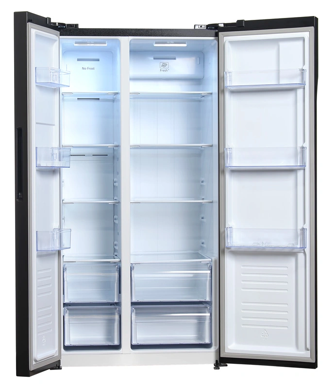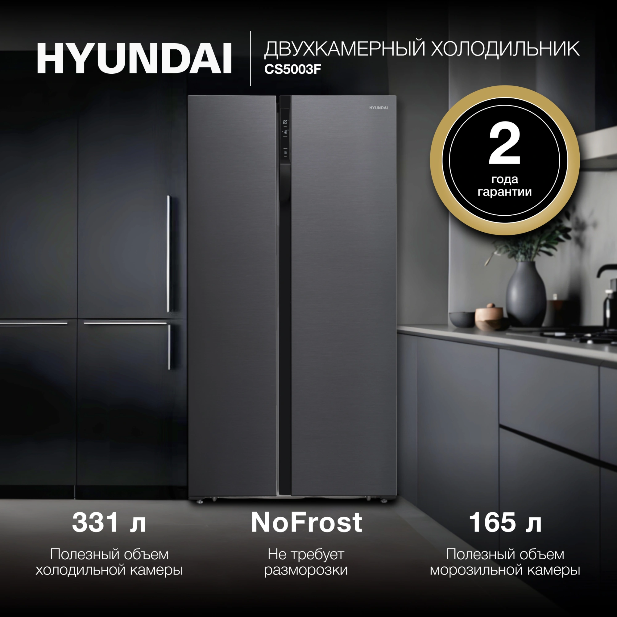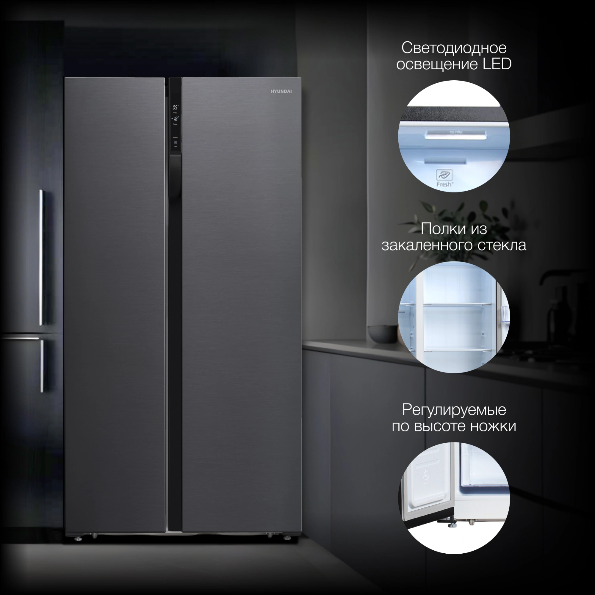 Для тех, кто хочет придать своей кухне современный стиль и иметь под рукой много места для хранения продуктов и напитков рекомендуем обратить внимание на 2-х дверный холодильник HYUNDAI CS5003F (тип Side by Side).