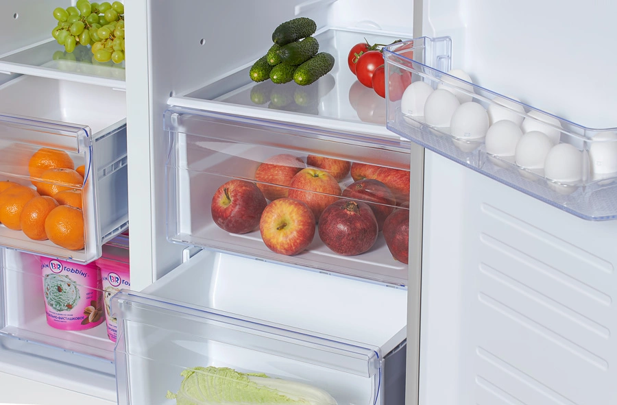 Выдвижные ящики, установленные в холодильной и морозильной камерах холодильника HYUNDAI CS5003F обеспечивают удобное хранение и быстрый доступ к хранящимся там продуктам.