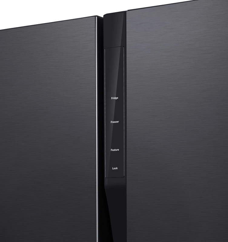 Скрытые ручки для открывания и внешний дисплей с панелью управления органично вписываются в благородный темный окрас дверей и корпуса холодильника.