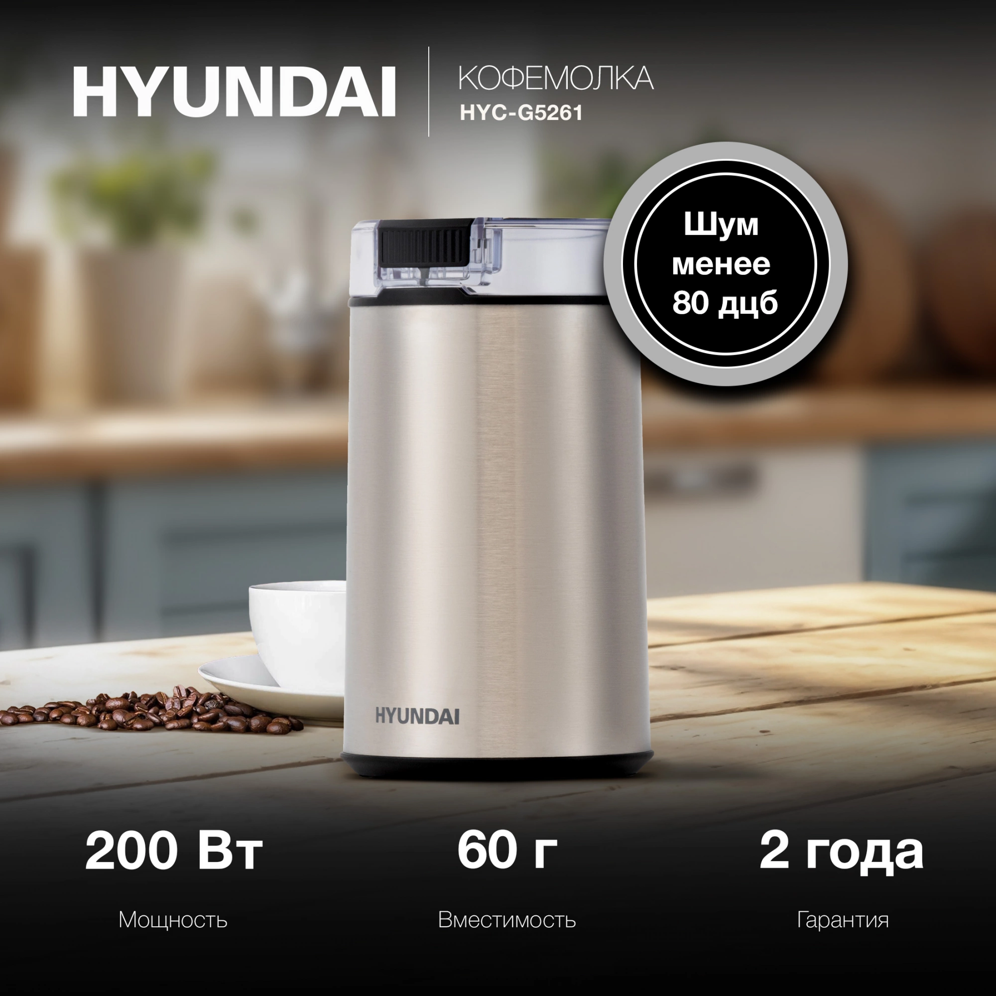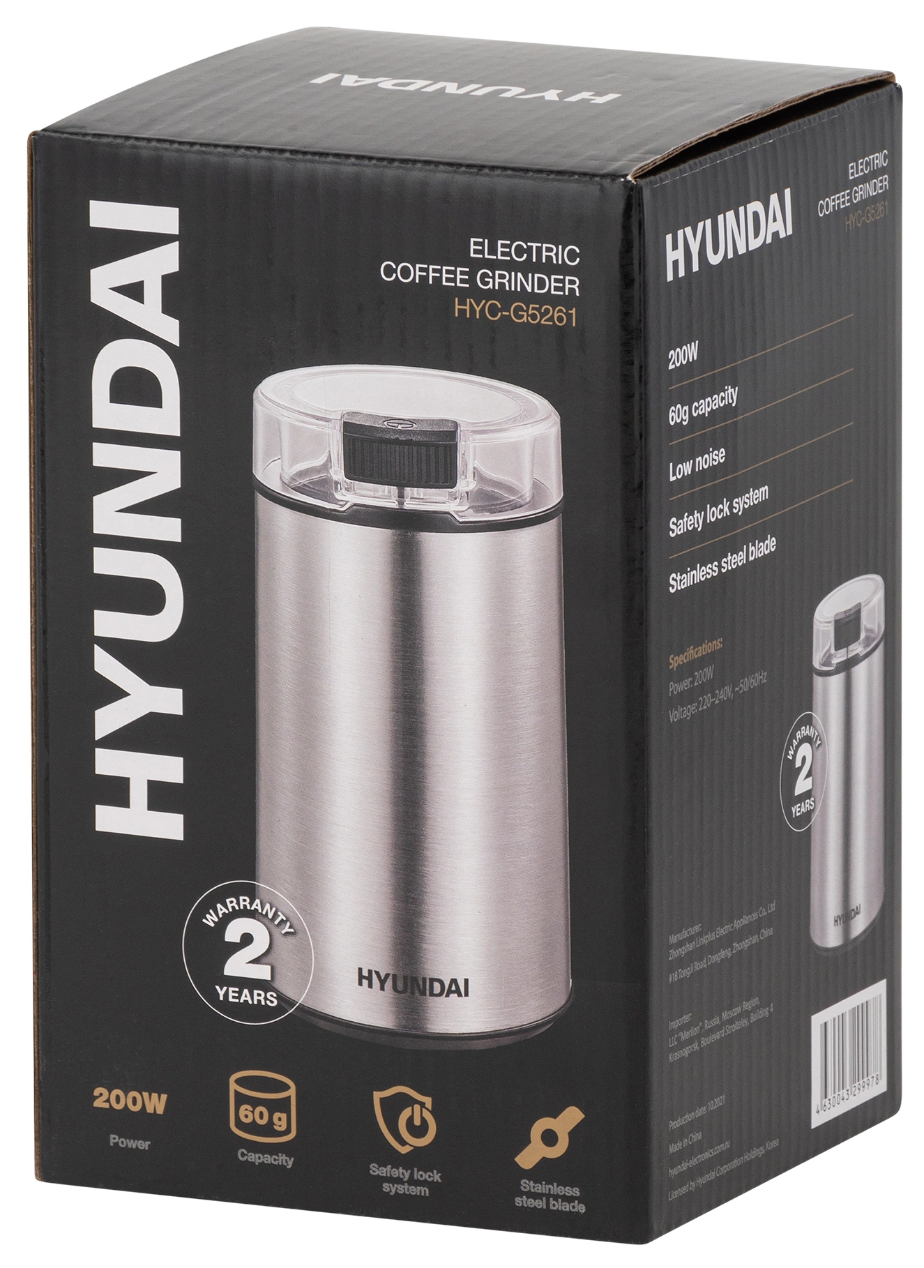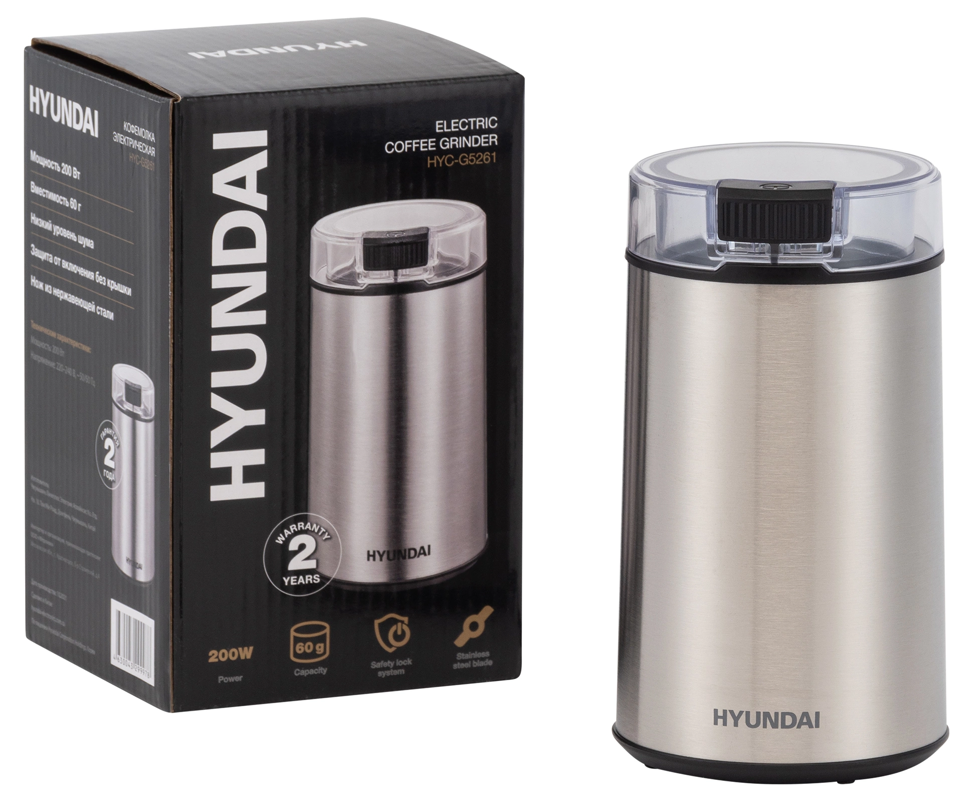 Кофемолка Hyundai HYC-G5261 отличается компактными размерами и не занимает много места при хранении. Рекомендуется использовать её для помола кофейных зерен, но можно задействовать также для переработки сахара, орехов и специй. Корпус выполнен из металла серебристого цвета. Крышка изготовлена из прозрачного ударопрочного пластика, устойчивого к механическим воздействиям. Через нее можно отслеживать степень помола продуктов. Кнопка запуска расположена на крышке, и прибор не включится, если ее как следует не закрутить. Это очень важно для соблюдения техники безопасности. Внутри устройства находится чаша из нержавеющей стали. Это значительно облегчает уход. Ротационные ножи выполнены из того же материала, они хорошо заточены и отлично справляются со своей задачей. За считанные секунды можно получить практически порошок. Кабель питания достаточно длинный, что значительно облегчает подключение. Стильная и нужная вещь станет настоящей помощницей на любой кухне.