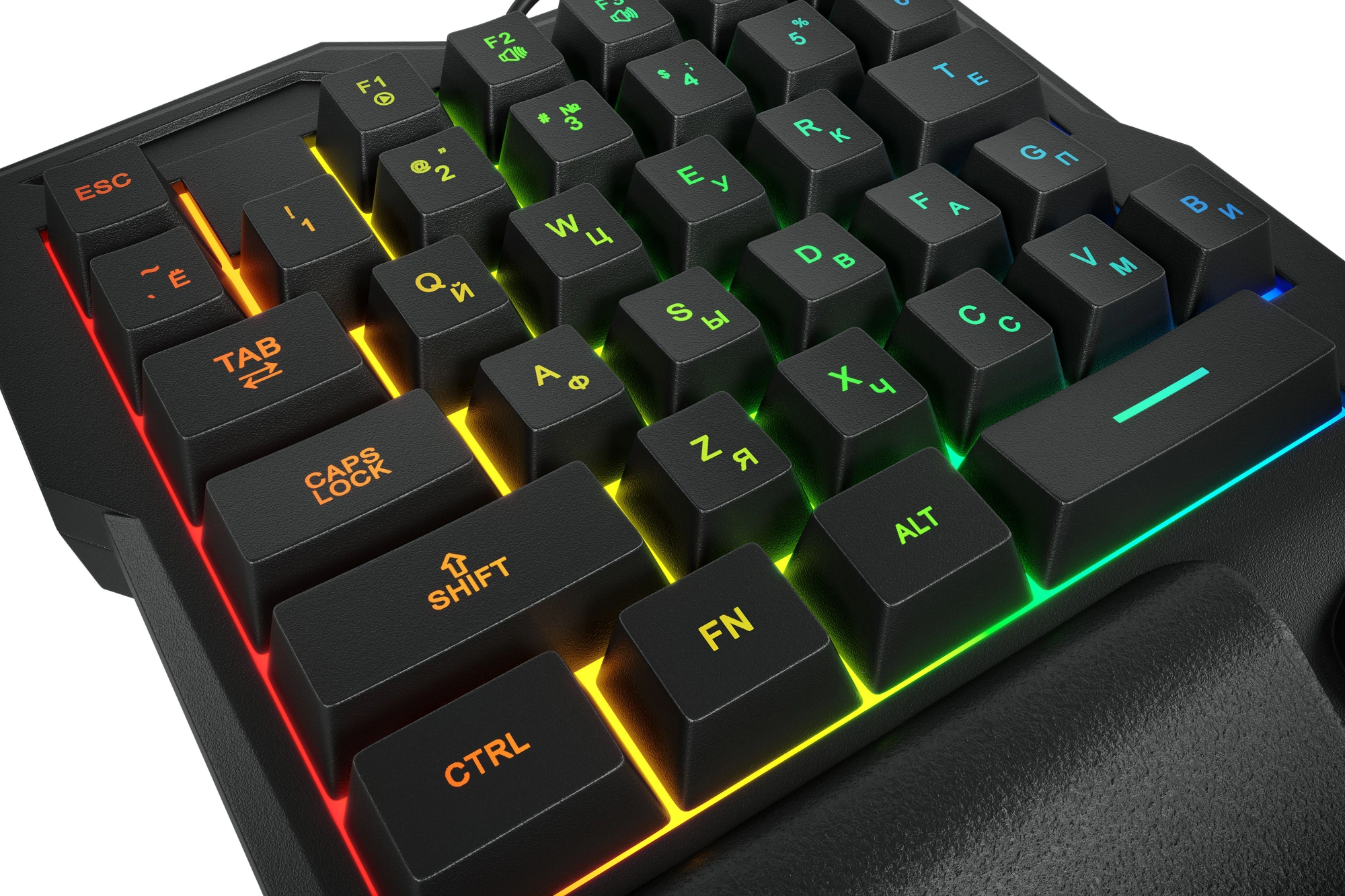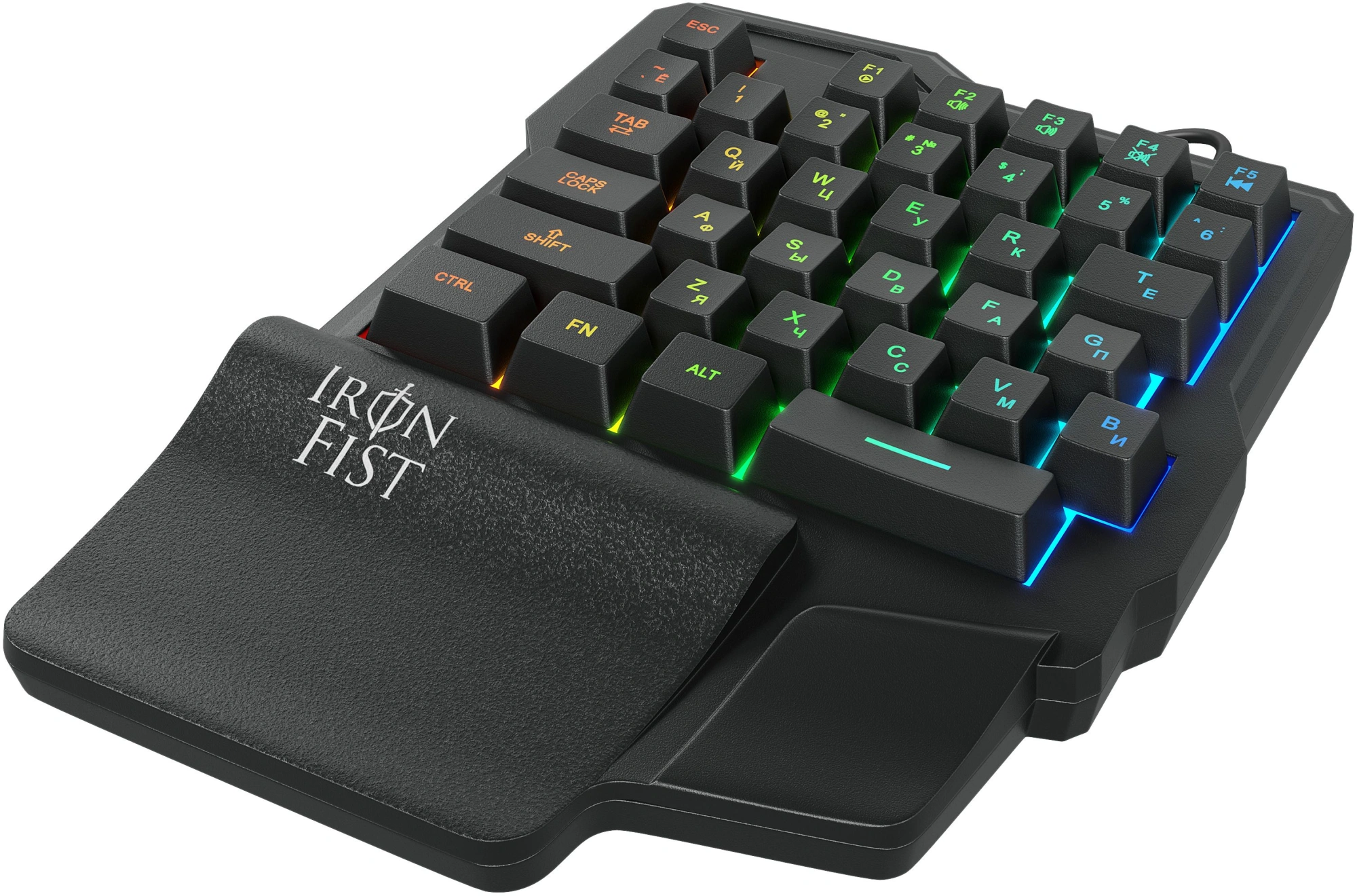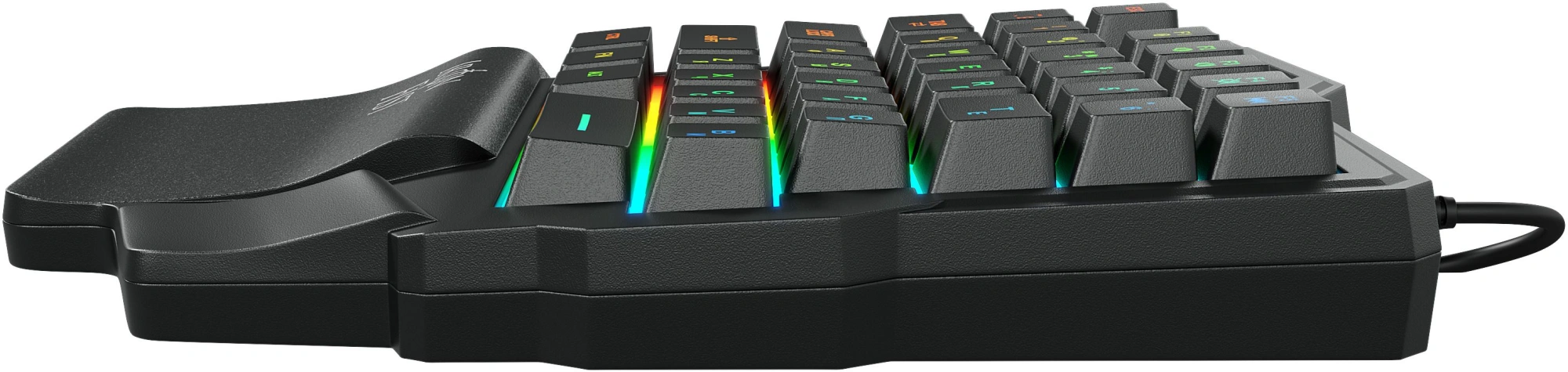 Есть 5 мультимедийных клавиш Fn+F1-F5 для быстрого доступа к различным действиям, например, управлению громкостью и плеером или переключению музыкальных треков. Предусмотрена яркая многоцветная статическая подсветка. С ней использовать кейпад комфортно даже в темное время суток.