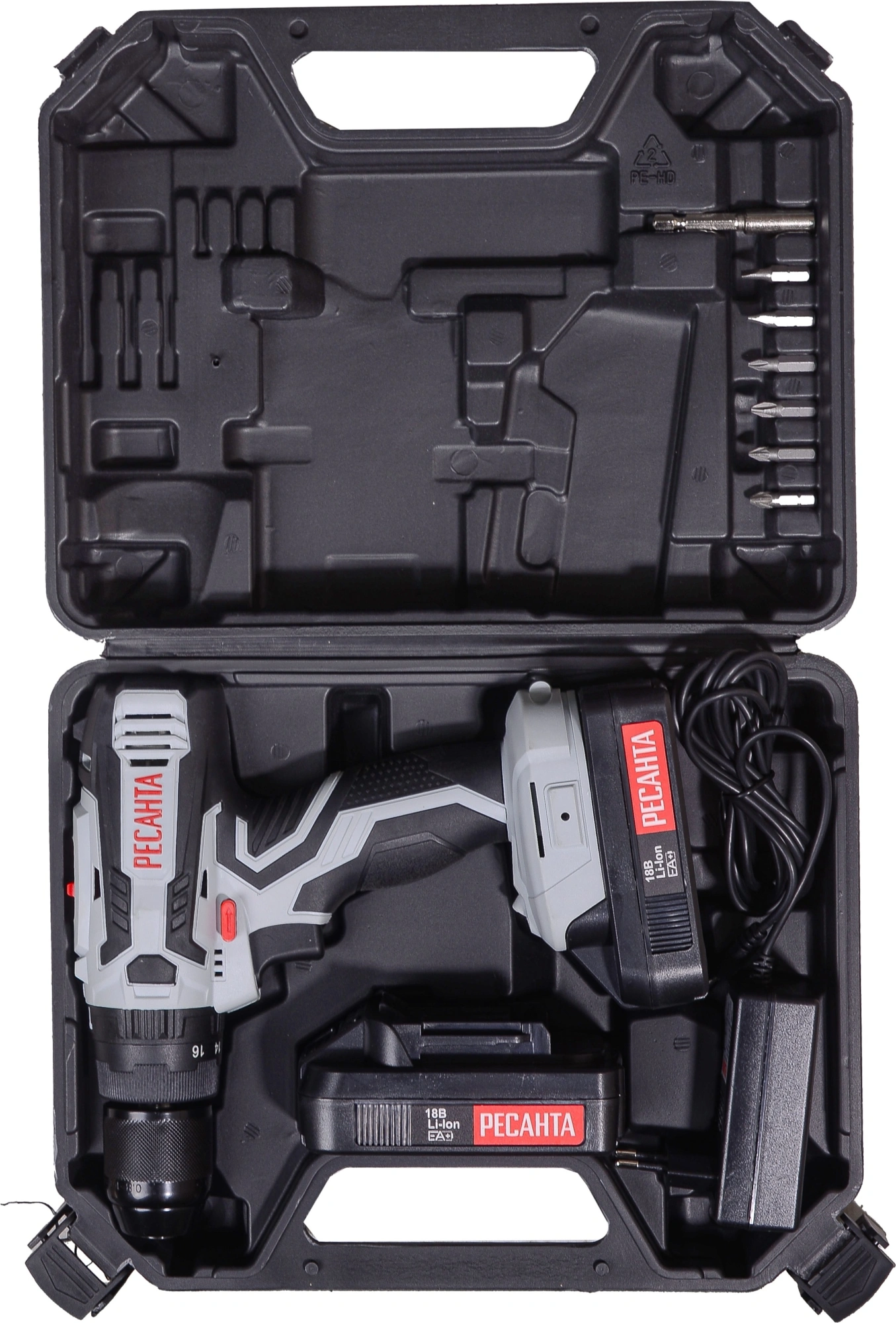 Дрель-шуруповерт; аккумулятор - 2шт.; Бита-6шт; Адаптер-удлинитель для бит; Адаптер питания; Кейс