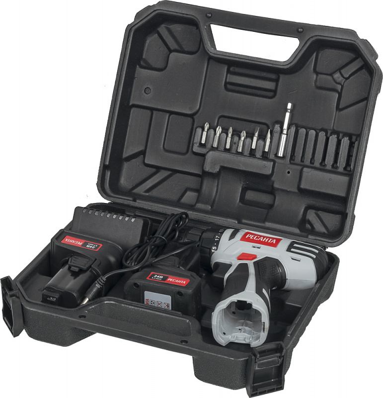Дрель-шуруповерт; аккумулятор - 2 шт.; бита - 6 шт.; адаптер-удлинитель для бит; адаптер питания; кейс.
