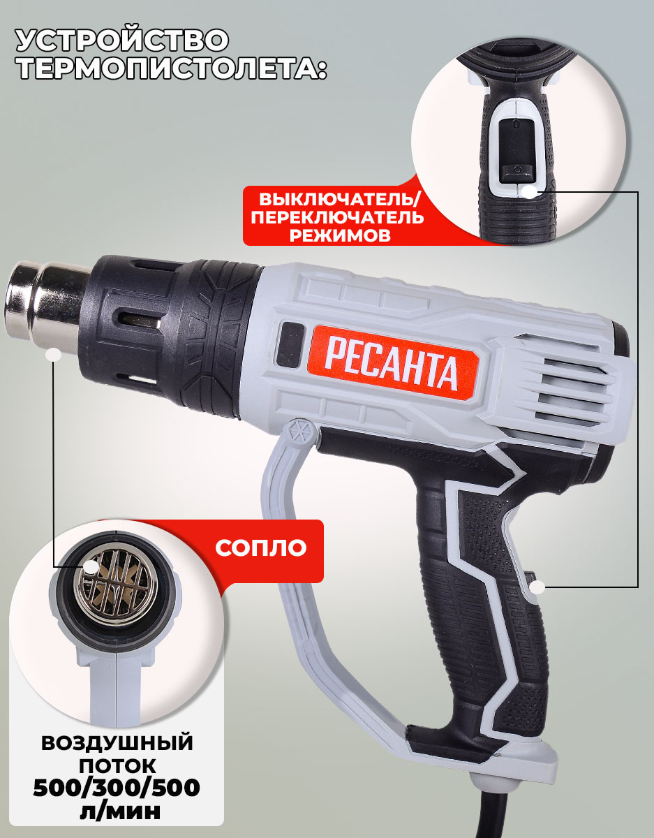 Регулировка скорости воздушного потока, защита от перегрева. Гарантийный срок составляет 24 мес. со дня продажи. Расширенная гарантия 60 мес. предоставляется только при условии, если владелец зарегистрирует инструмент в течении 1 мес. с момента покупки на сайте компании Ресанта www.resanta.ru