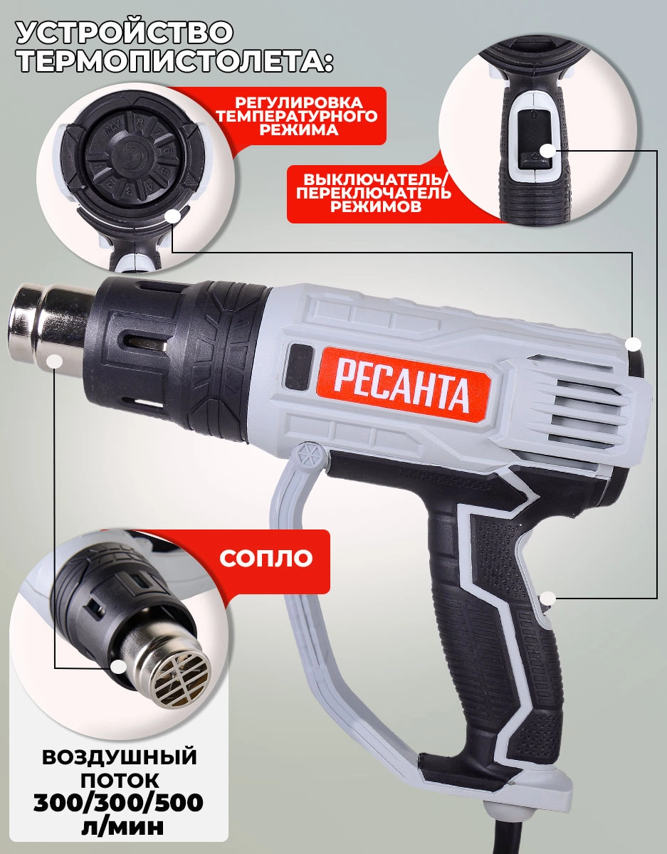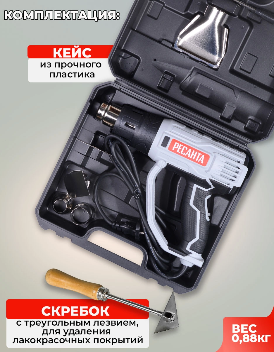 Регулировка скорости воздушного потока, защита от перегрева. Гарантийный срок составляет 24 мес. со дня продажи. Расширенная гарантия 60 мес. предоставляется только при условии, если владелец зарегистрирует инструмент в течении 1 мес. с момента покупки на сайте компании Ресанта www.resanta.ru