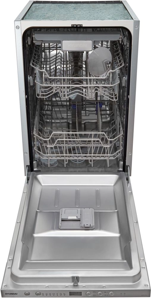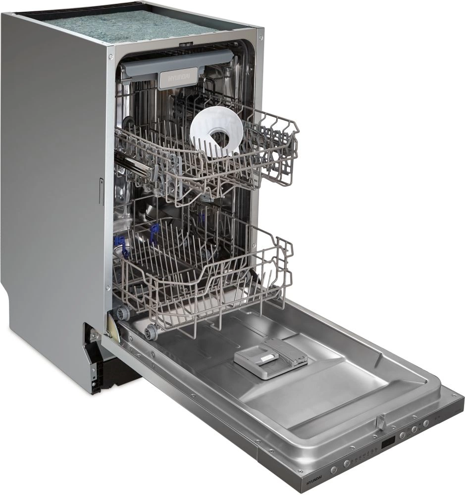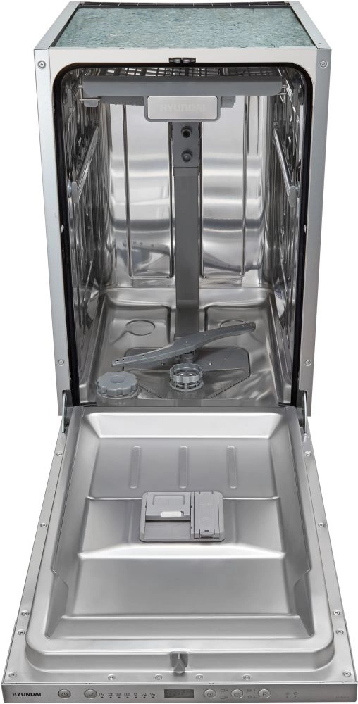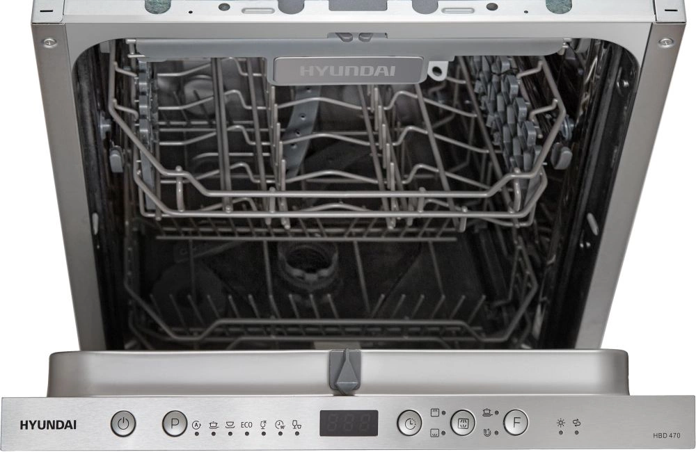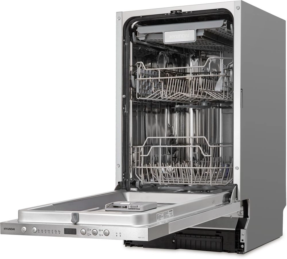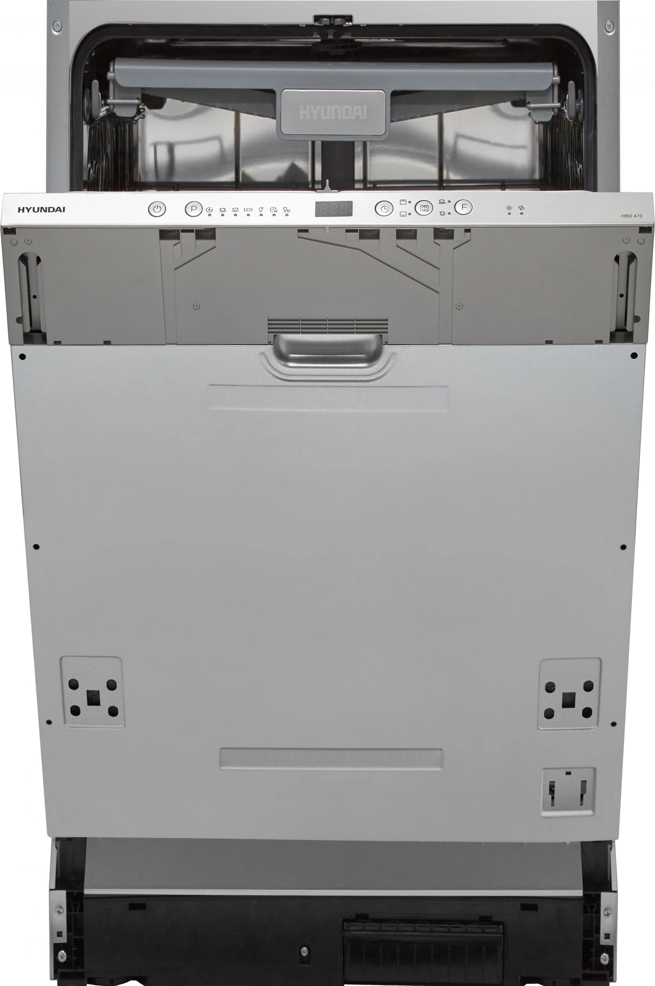 Встраиваемая посудомоечная машина HYUNDAI HBD 470 называется узкой, т.к. ее ширина всего 45 см. Несмотря на свои небольшие размеры, эта посудомоечная машина вмещает до 10 комплектов посуды.7 встроенных программ в модели HBD 470 позволяют подобрать оптимальный вариант мытья посуды. Если посуда очень грязная – подойдет программа интенсивной мойки или экстра-сильная мойка. Если вы сразу запускаете режим мытья посуды после того, как поели, – воспользуйтесь программой ECO, которая считается самой эффективной по соотношению расхода воды и электроэнергии.