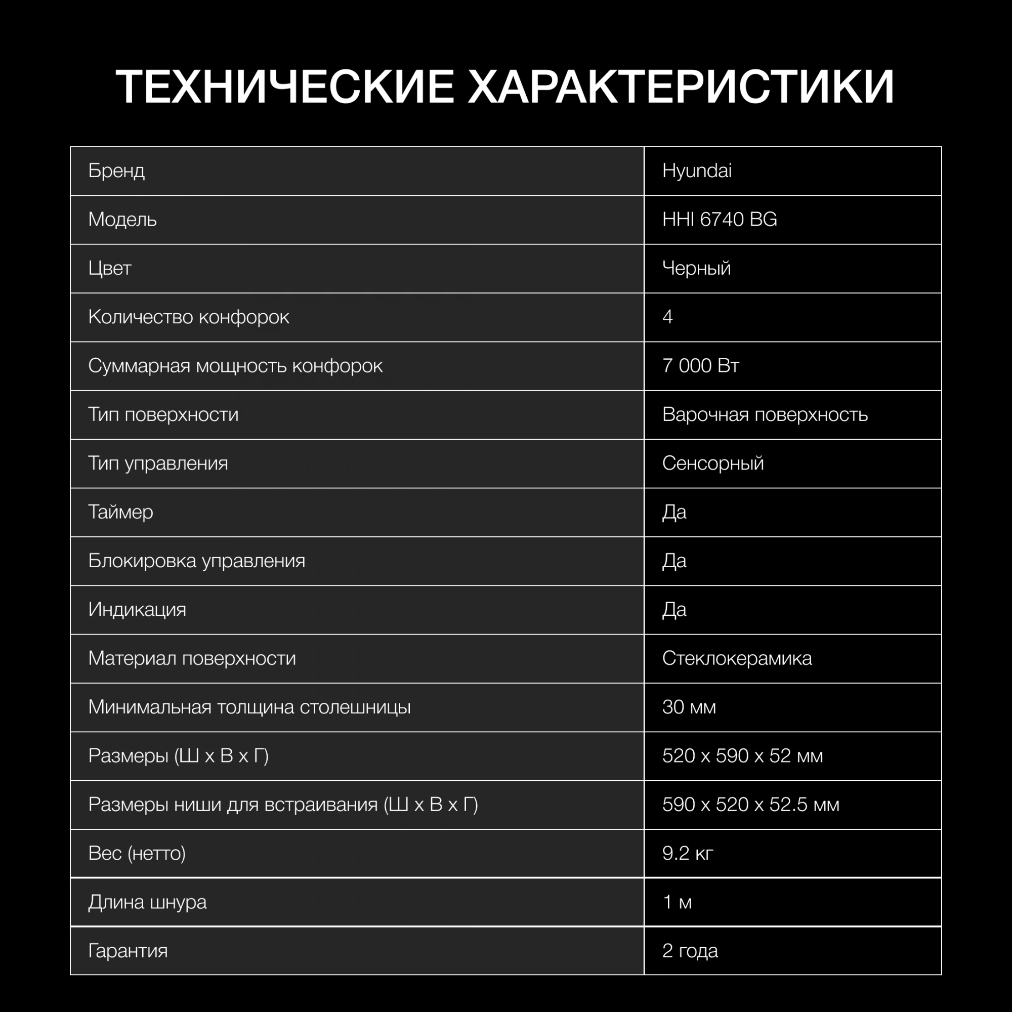 Стильная 4-х конфорочная индукционная варочная поверхность HYUNDAI HHI 6740 BG с независимым сенсорным управлением будет органично смотреться и в классическом кухонном гарнитуре, и на современной кухне.