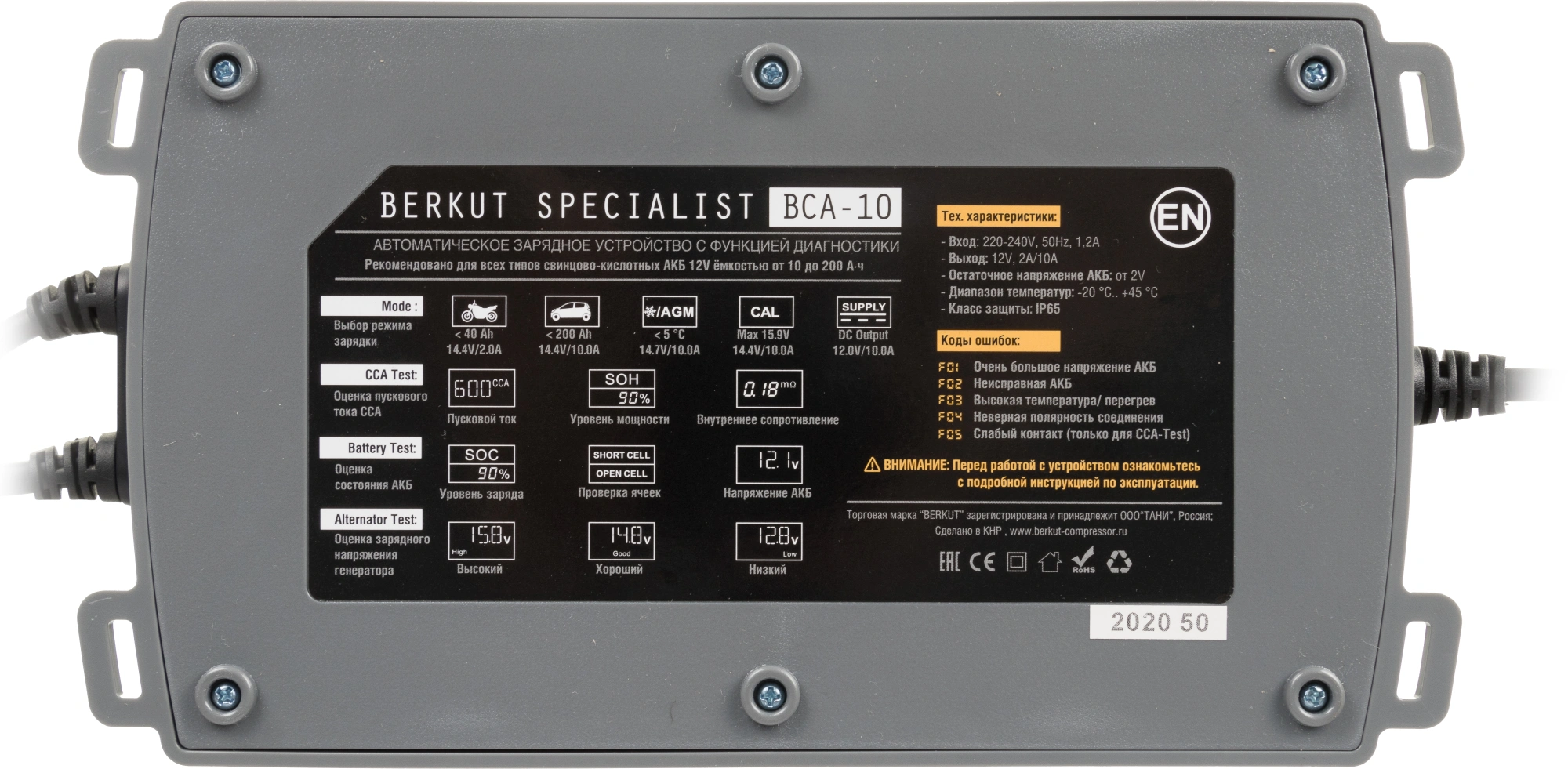 Режимы зарядки: режим "МОТО" - 14,4 V/2А; режим "АВТО" - 14,4 V/10А; режим "Зимний" или AGM -14,7 V/10А; режим Ca (Кальций) - 14,4-15,9 V/10А; режим "Источник питания" - 12V/10А