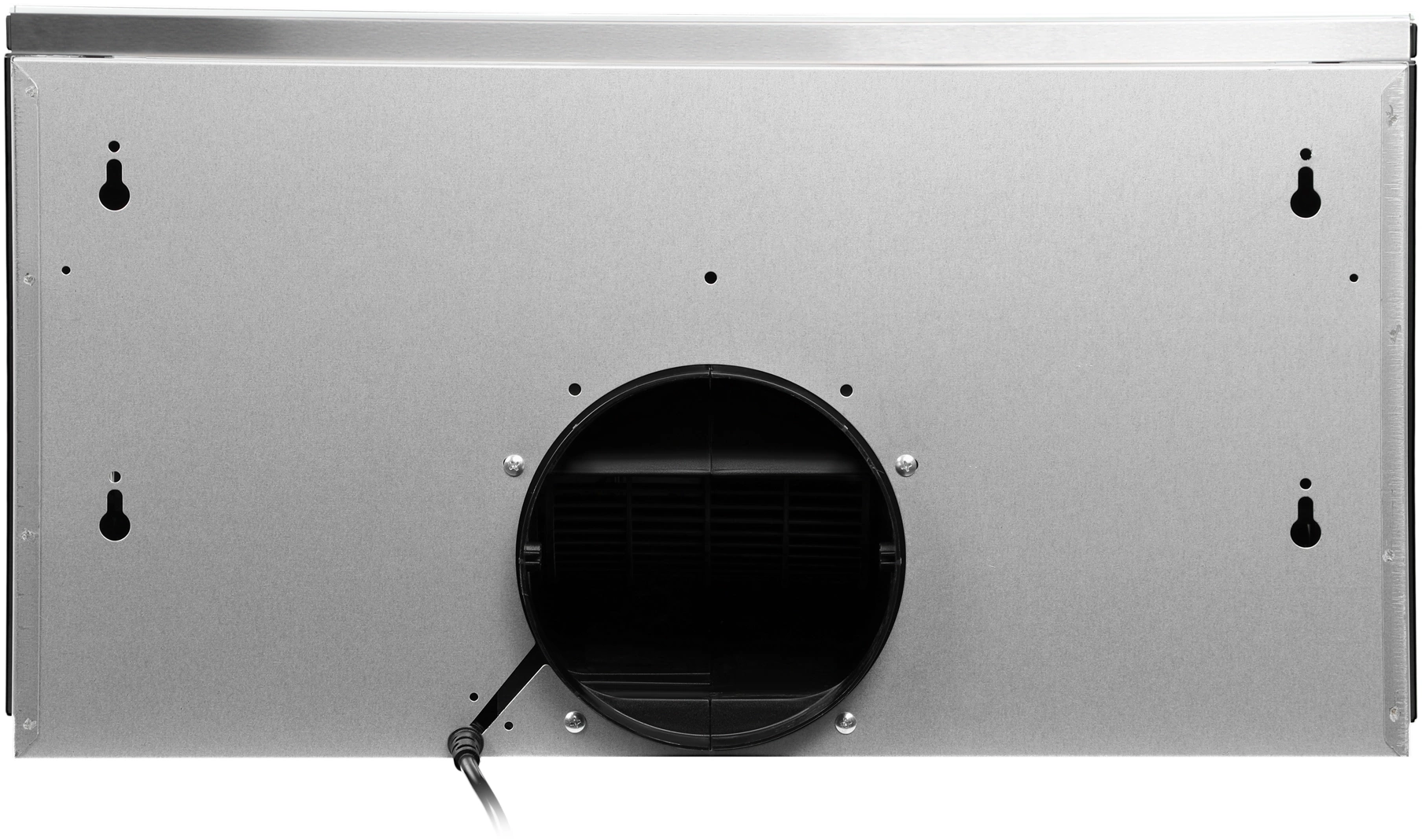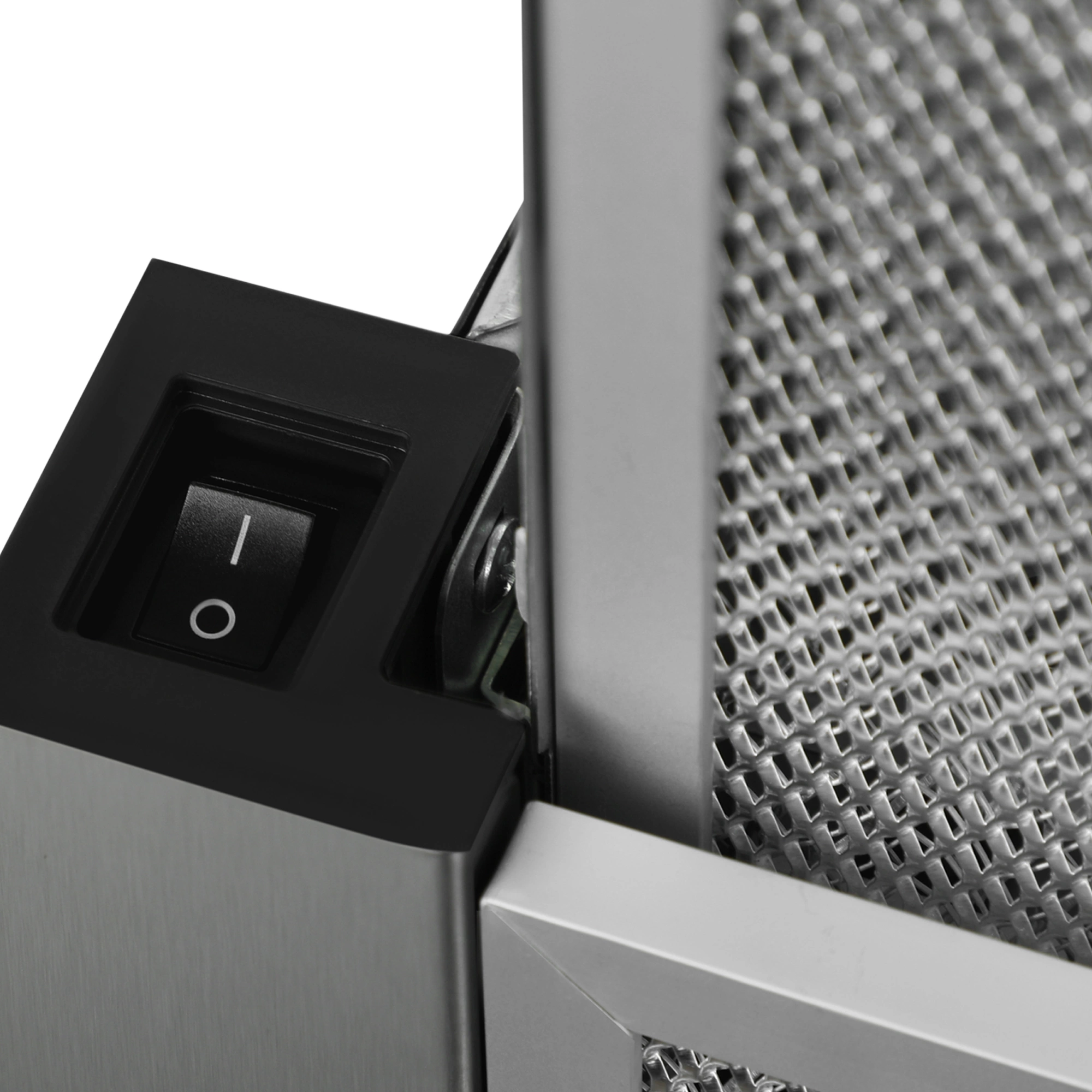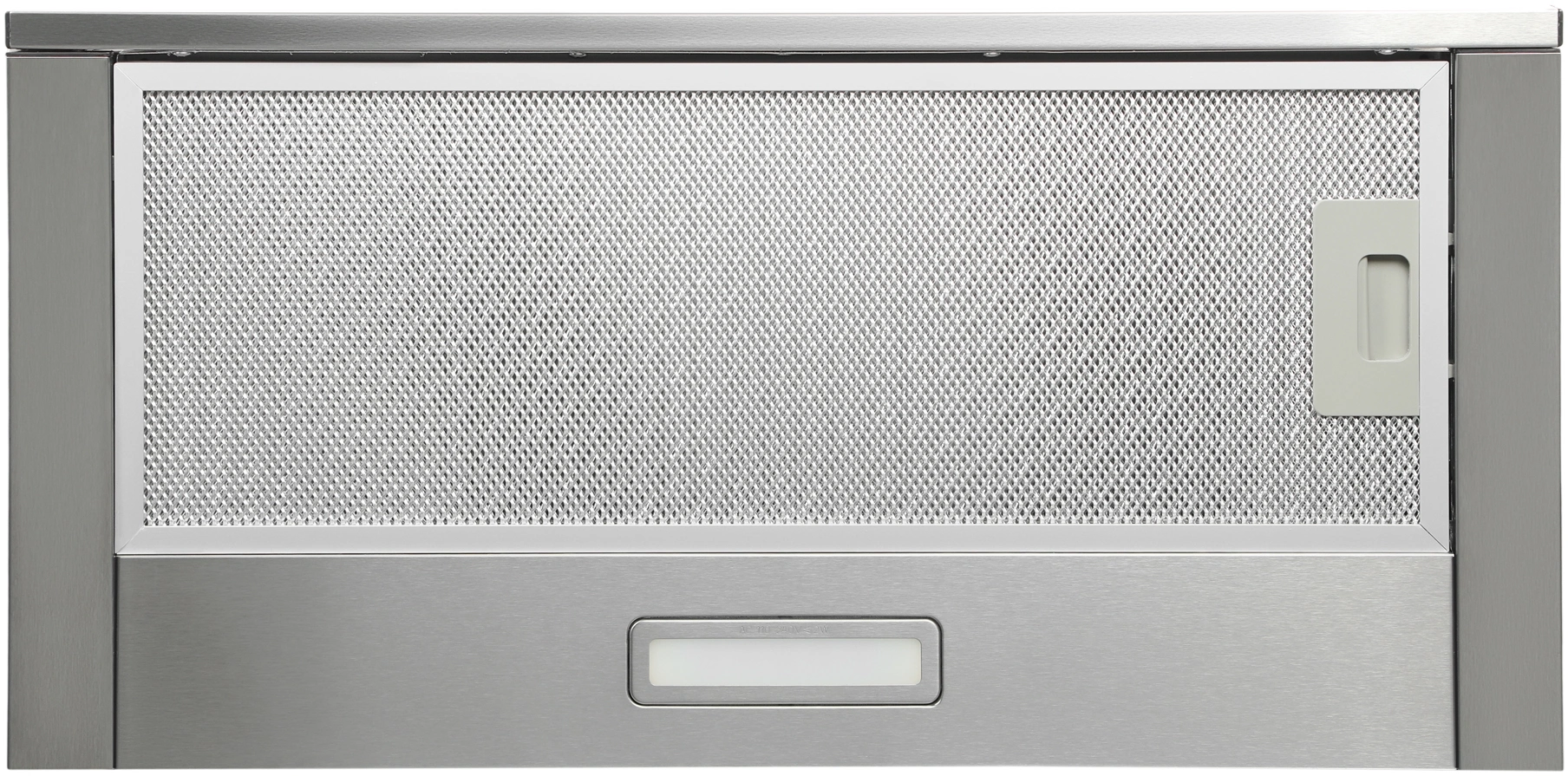 Минималистичный дизайн. Корпус вытяжки встраивается в навесной шкаф шириной 60 см. Глазу видна только лицевая панель цвета «нержавеющая сталь». Она выглядит компактно и элегантно. Выдвигайте лицевую панель вперед, чтобы включать вытяжку в заранее установленном режиме. Это позволит управлять прибором легче и быстрее.