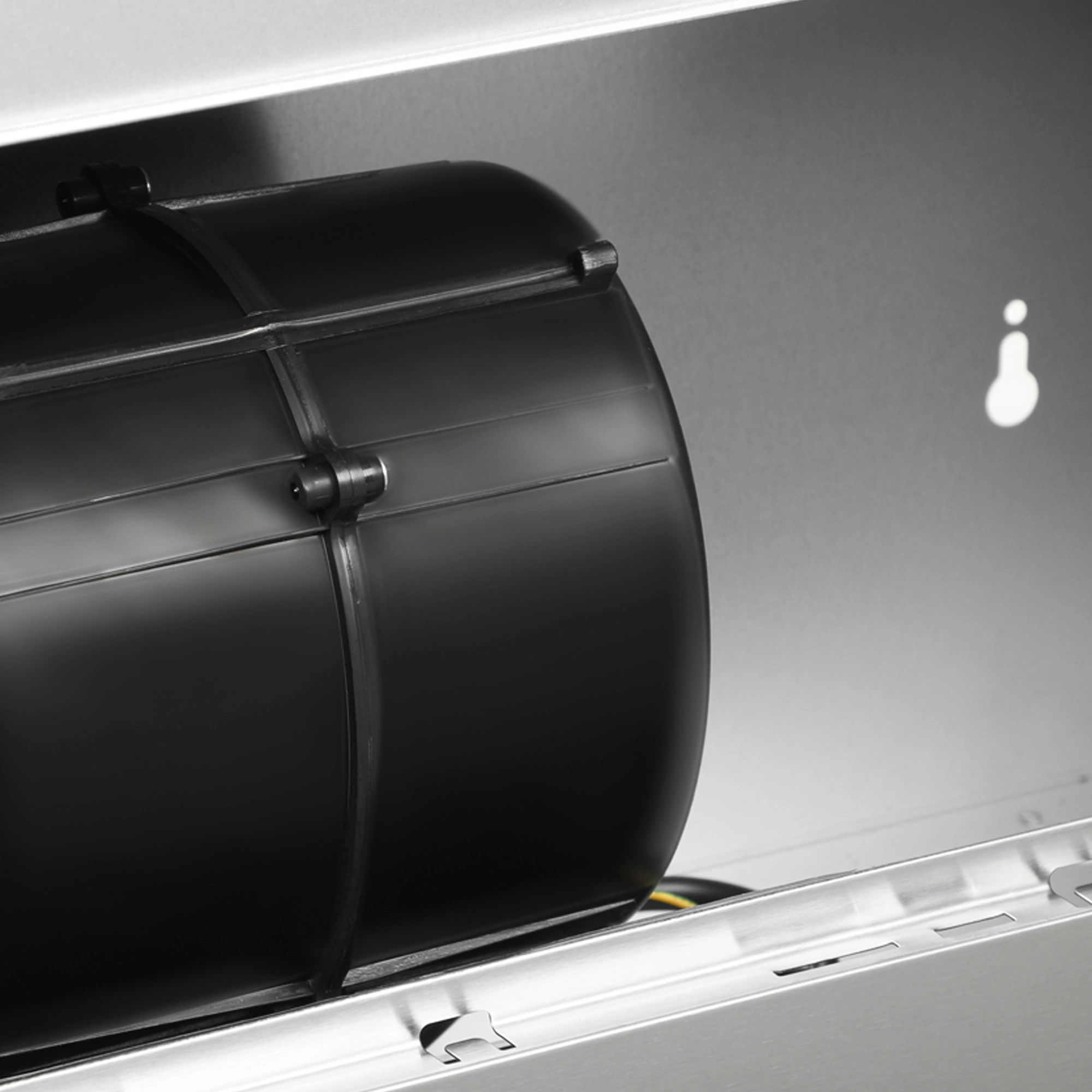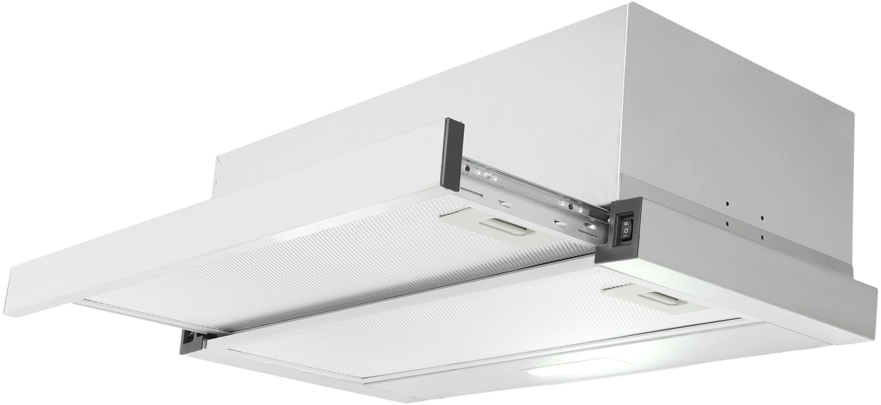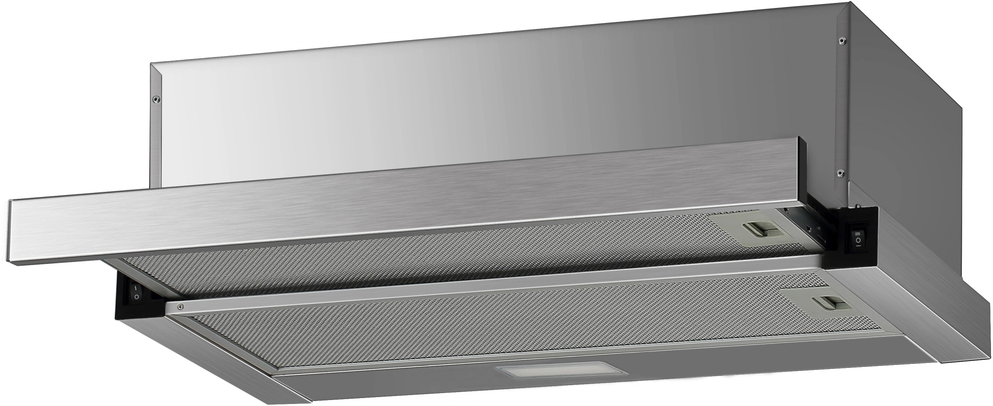 Минималистичный дизайн. Корпус вытяжки встраивается в навесной шкаф шириной 60 см. Глазу видна только лицевая панель цвета «нержавеющая сталь». Она выглядит компактно и элегантно. Выдвигайте лицевую панель вперед, чтобы включать вытяжку в заранее установленном режиме. Это позволит управлять прибором легче и быстрее.