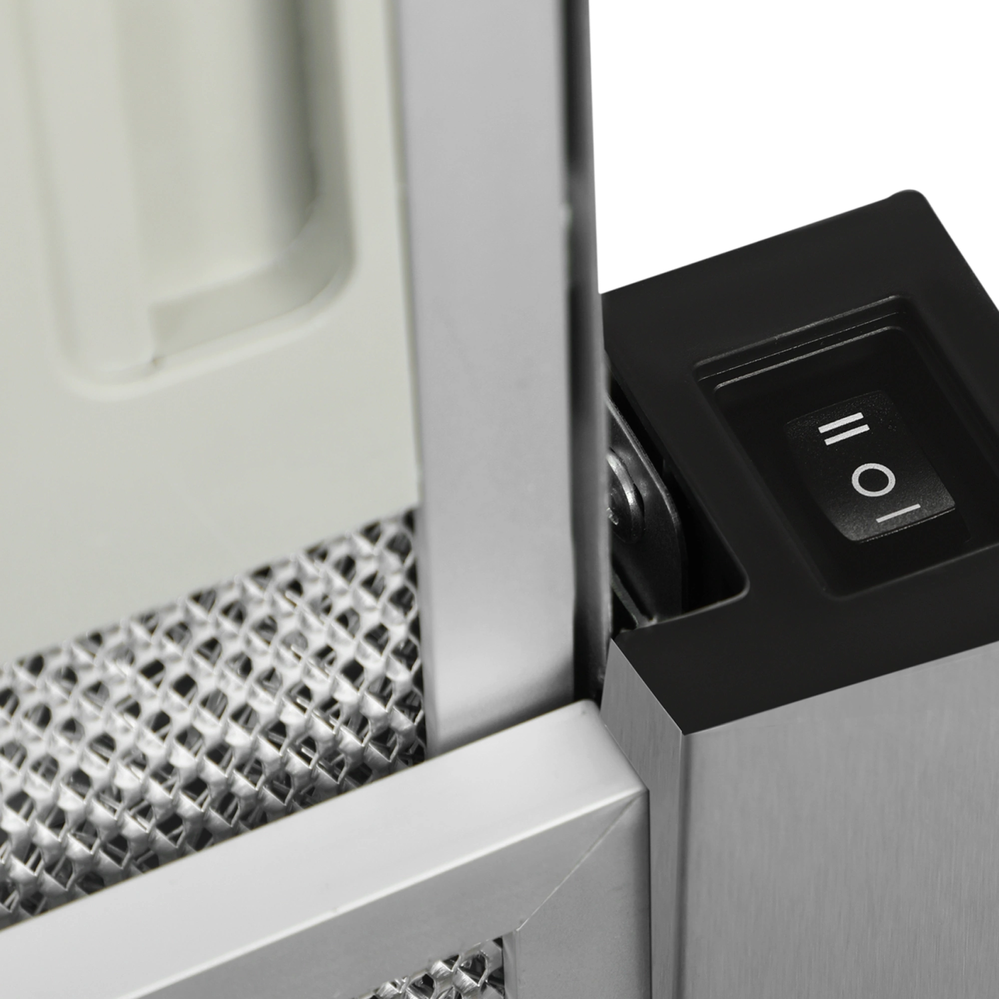 Производительность. Модель подойдет для просторной кухни: производительность устройства составляет 350 м3/час. Вытяжка уберет нежелательные запахи пищи, дыма, гари и очистит воздух. Устанавливайте одну из двух скоростей работы вентилятора с помощью кулисного переключателя.