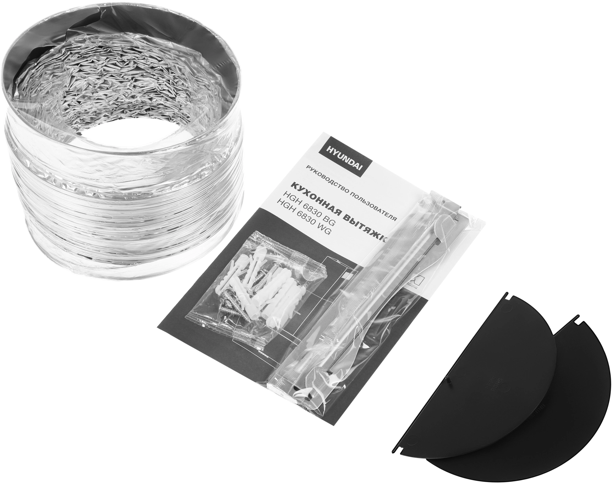 Продуманная комплектация. В комплекте с Hyundai HGH 6830 BG идут моющийся алюминиевый жироулавливающий фильтр, два декоративных кожуха по 40 см и гофра диаметром 150 мм. Это позволит без дополнительных трат проложить воздуховод до вентиляционного канала, чтобы поглощенный воздух отводился за пределы кухни, на улицу. У вытяжки предусмотрен антивозвратный клапан, чтобы чужие запахи не попали к вам в квартиру.