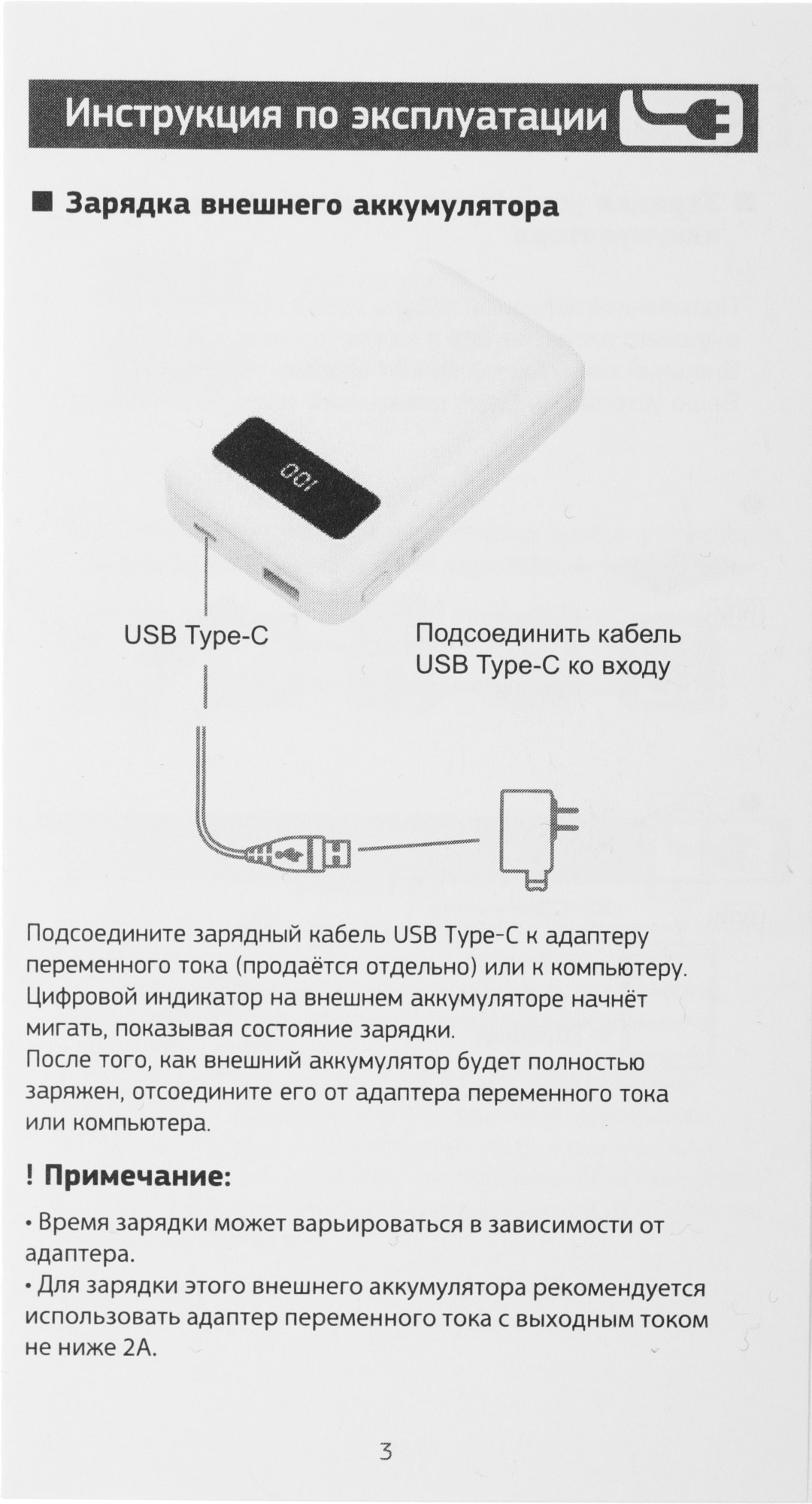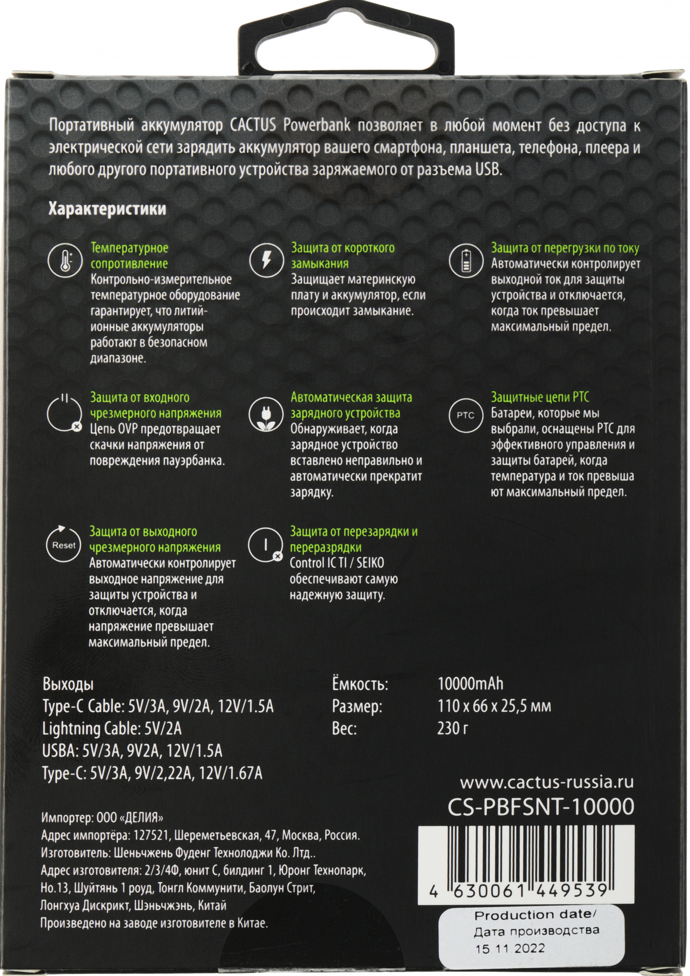 Текстовое описание: Портативный аккумулятор Cactus CS-PBFSNT-10000 имеет классический дизайн и миниатюрную форму, корпус выполнен из пластика. В его основе используется высококачественный Li-pol элемент, ёмкостью 10000 мАч. Такая емкость позволяет несколько раз восполнить заряд смартфона, смарт-часов, МР3-плеера или других устройств. Все разъёмы расположены на верхней грани корпуса аккумулятора. Модель оснащена одним USB-разъёмом с max током 3А. А также имеет встроенный кабель с портами Type-C и Lightning с max током 2.1А. Для восполнения заряда самого аккумулятора в комплекте поставляется кабель USB Type-C или micro-USB для подключения к зарядному блоку через соответствующий разъём. LED-индикатор на корпусе показывает состояние заряда. Устройство обладает электронной системой защиты от перезарядки и коротких замыканий.