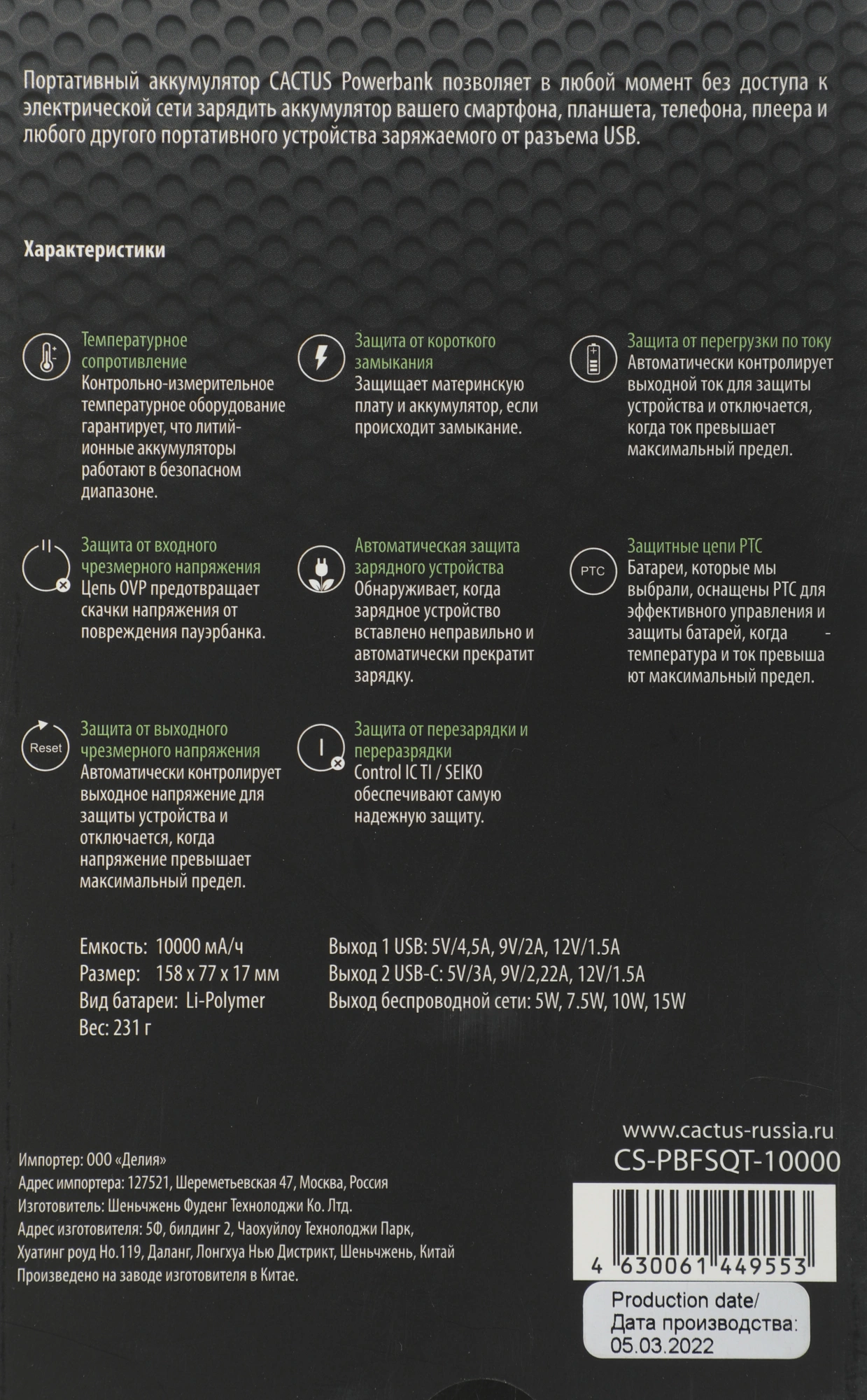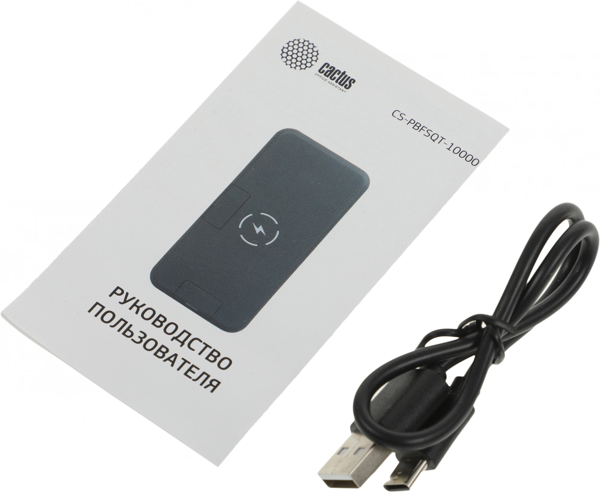 Текстовое описание: Портативный аккумулятор Cactus CS-PBFSQT-10000 имеет строгий классический дизайн, корпус выполнен из пластика. В его основе используется высококачественный Li-pol элемент, ёмкостью 10000 мАч. Такая емкость позволяет несколько раз восполнить заряд смартфона, смарт-часов, МР3-плеера или других устройств. Все разъёмы расположены на верхней грани корпуса аккумулятора.