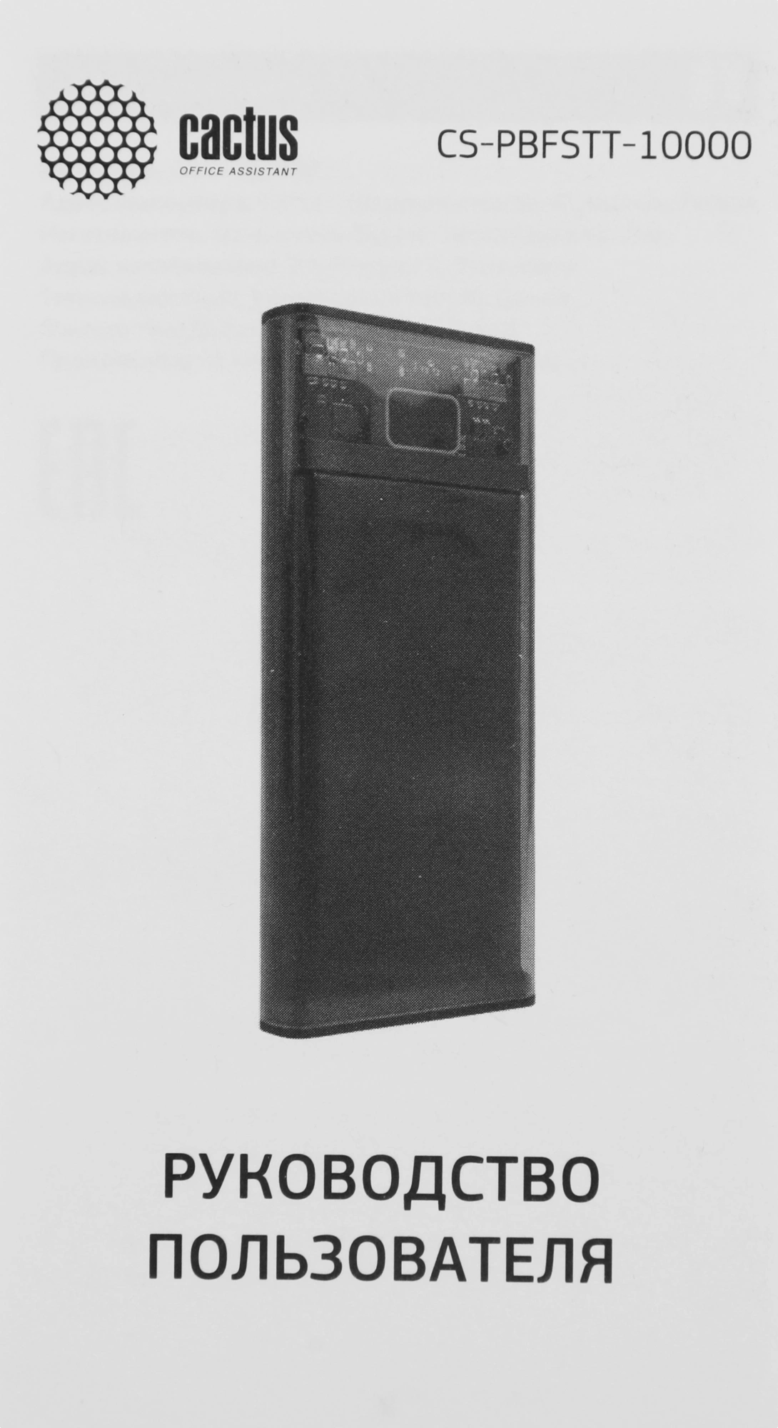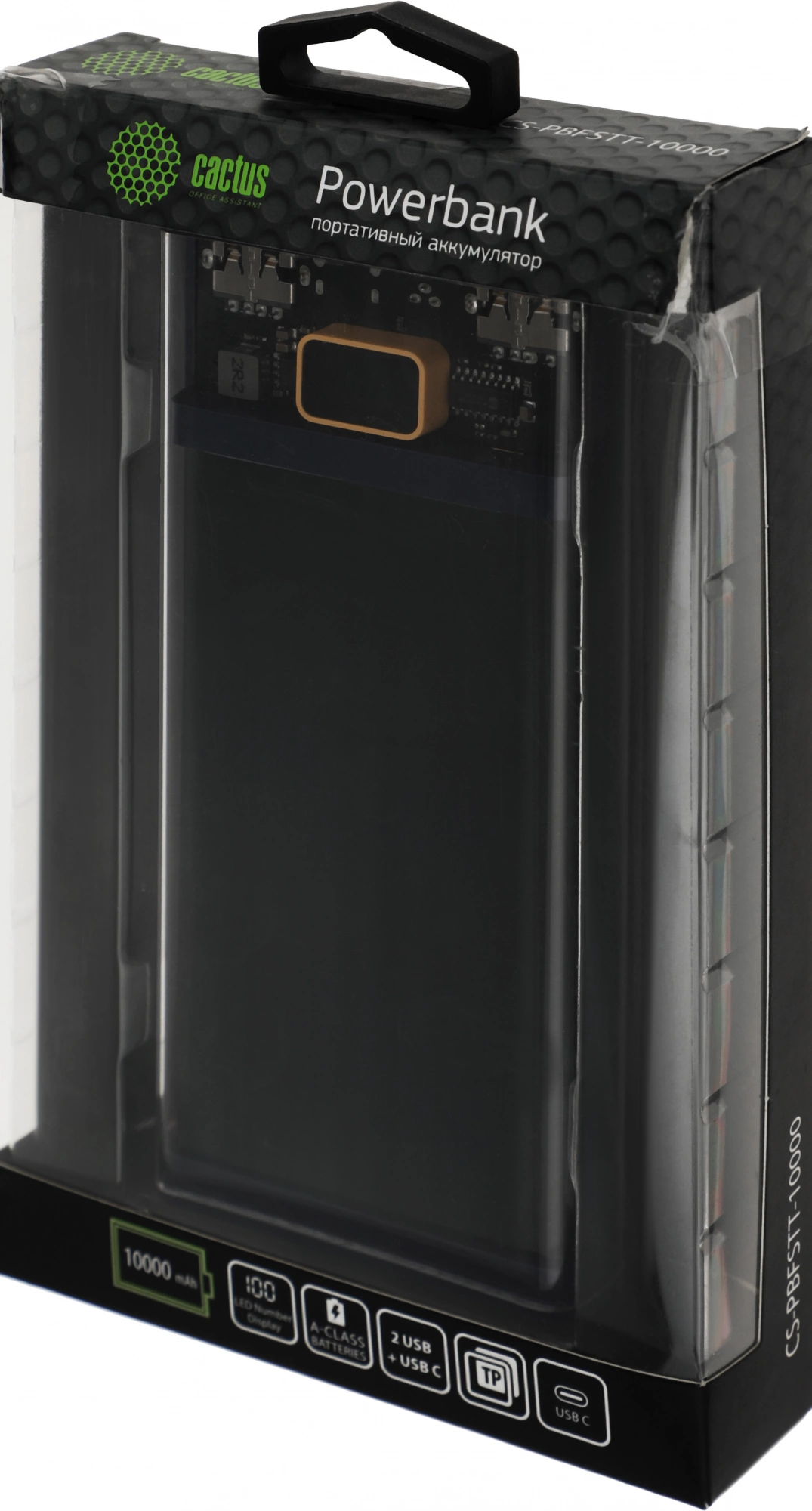 Текстовое описание: Портативный аккумулятор Cactus CS-PBFSTT-10000 имеет необычный прозрачный дизайн, корпус выполнен из пластика. В его основе используется высококачественный Li-pol элемент, ёмкостью 10000 мАч. Такая емкость позволяет несколько раз восполнить заряд смартфона, смарт-часов, МР3-плеера или других устройств. Все разъёмы расположены на верхней грани корпуса аккумулятора.
