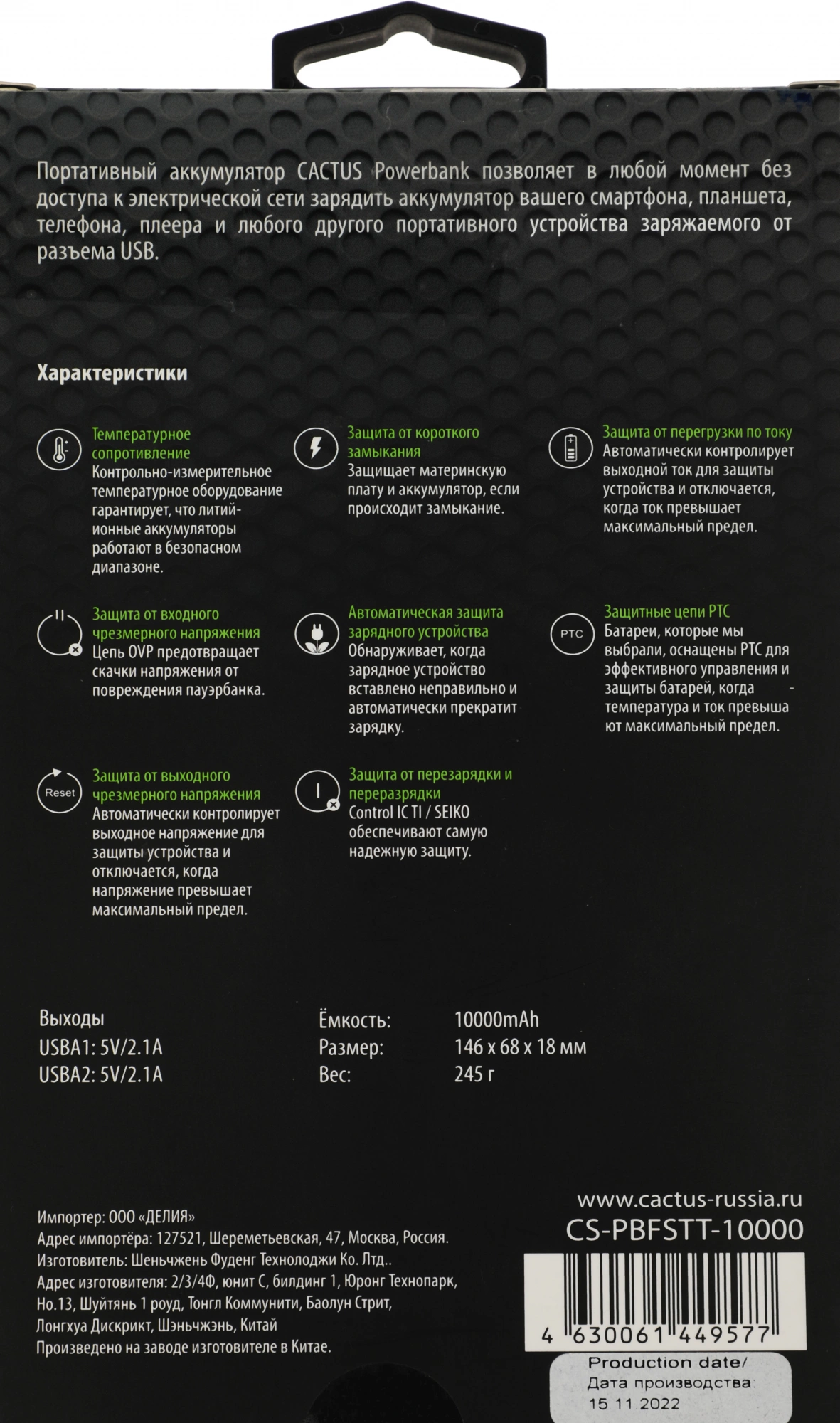 Мобильный аккумулятор Cactus CS-PBFSTT-10000