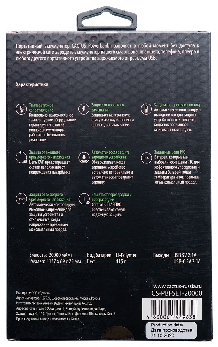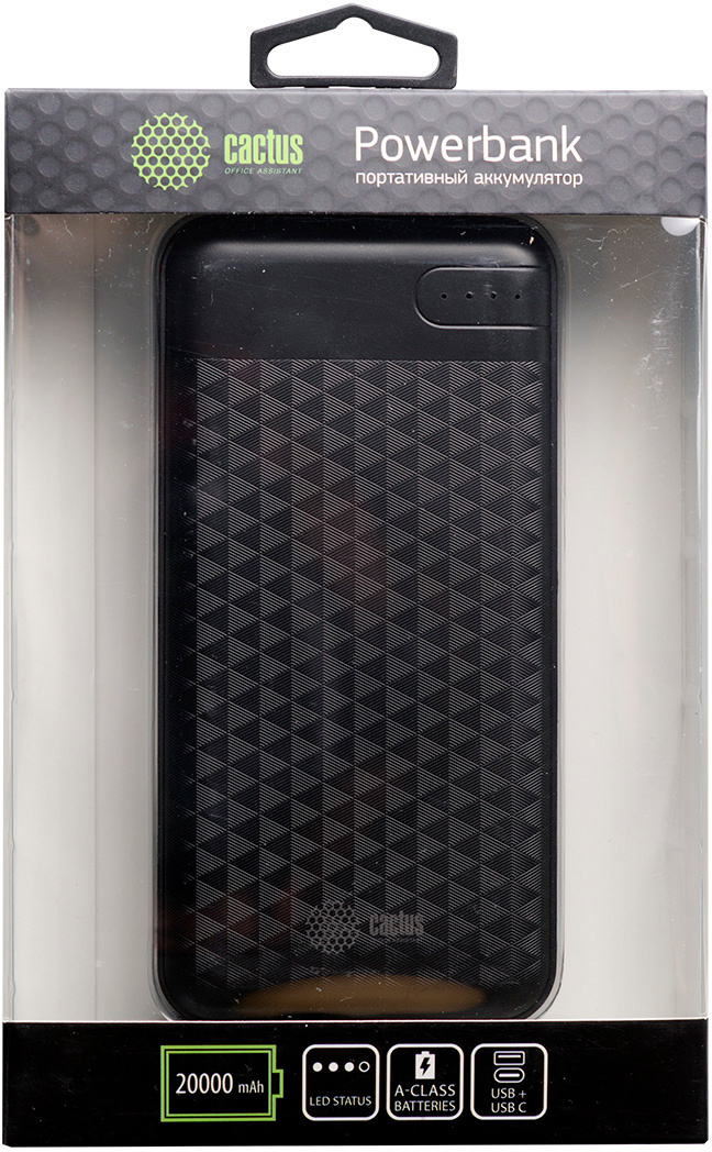 Портативный аккумулятор Cactus CS-PBFSET-20000 имеет классический дизайн, корпус выполнен из пластика. В его основе используется высококачественный Li-pol элемент, ёмкостью 20000 мАч. Такая емкость позволяет неоднократно восполнить заряд смартфона, смарт-часов, МР3-плеера или других устройств.