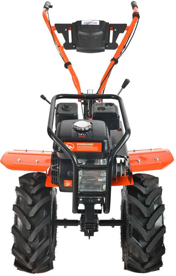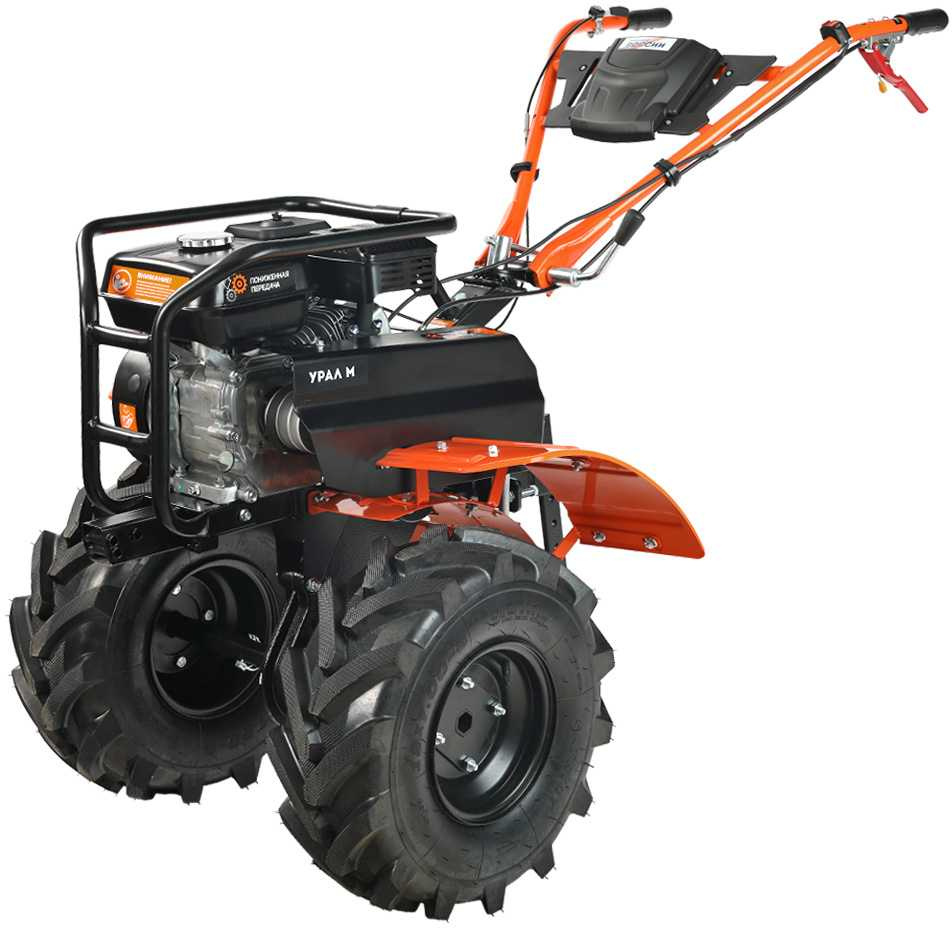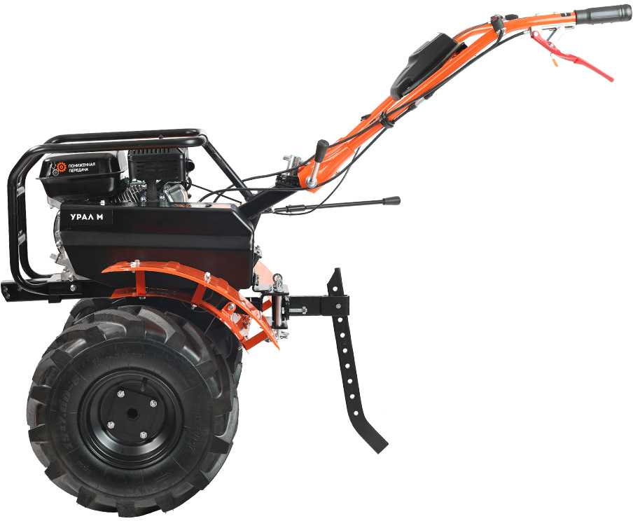 Многофункциональный мотокультиватор укомплектован фрезами и большими пневматическими колесами. Переключение скоростей осуществляется через коробку передач, а включение пониженной или повышенной передачи производится перекидыванием ремня с одной проточки шкива на другую