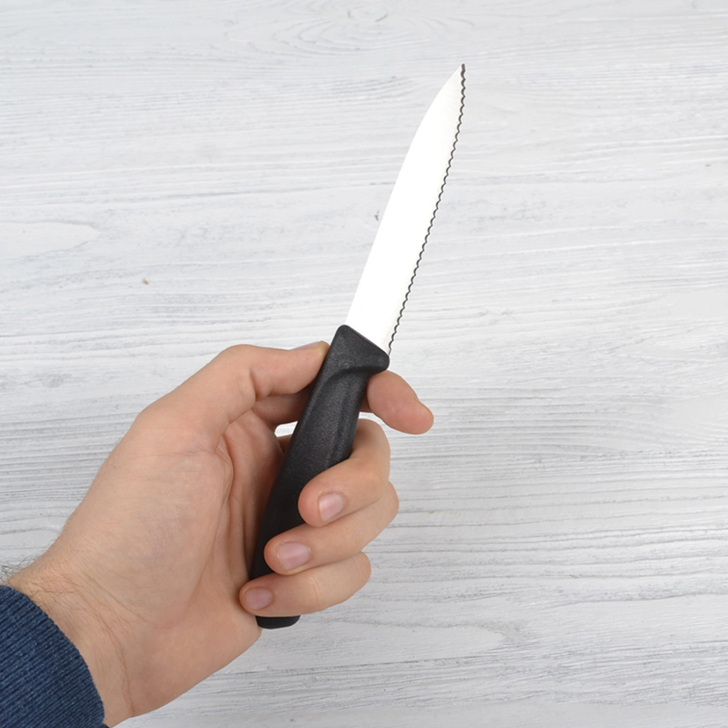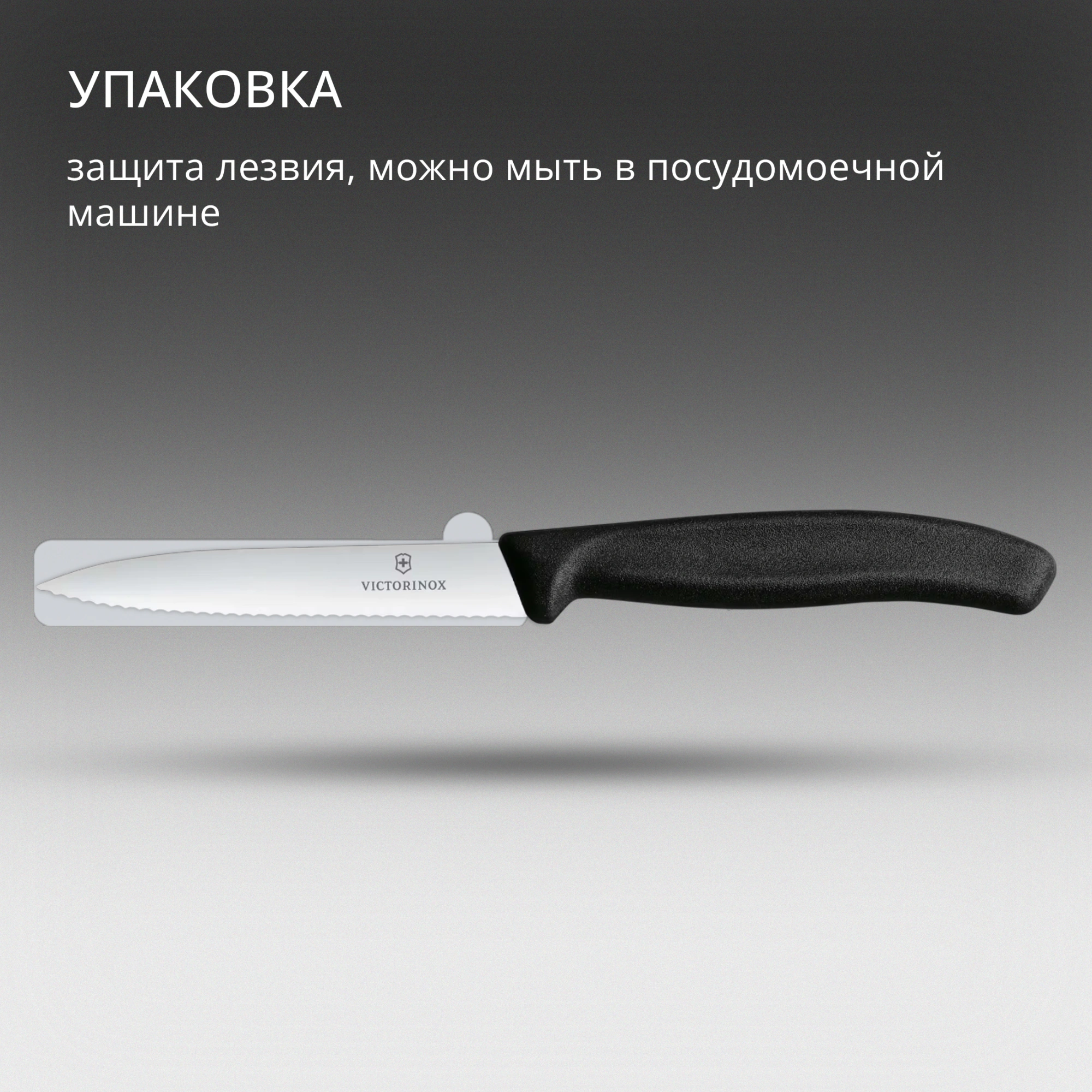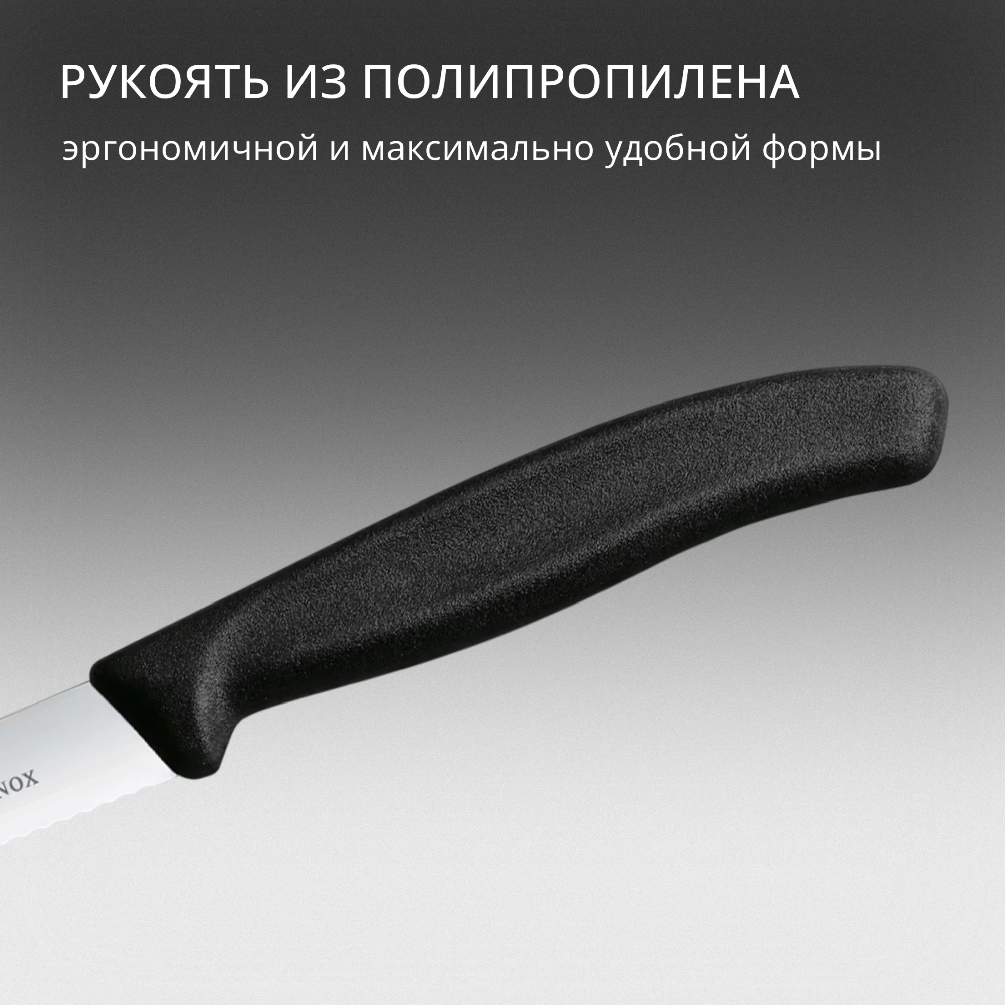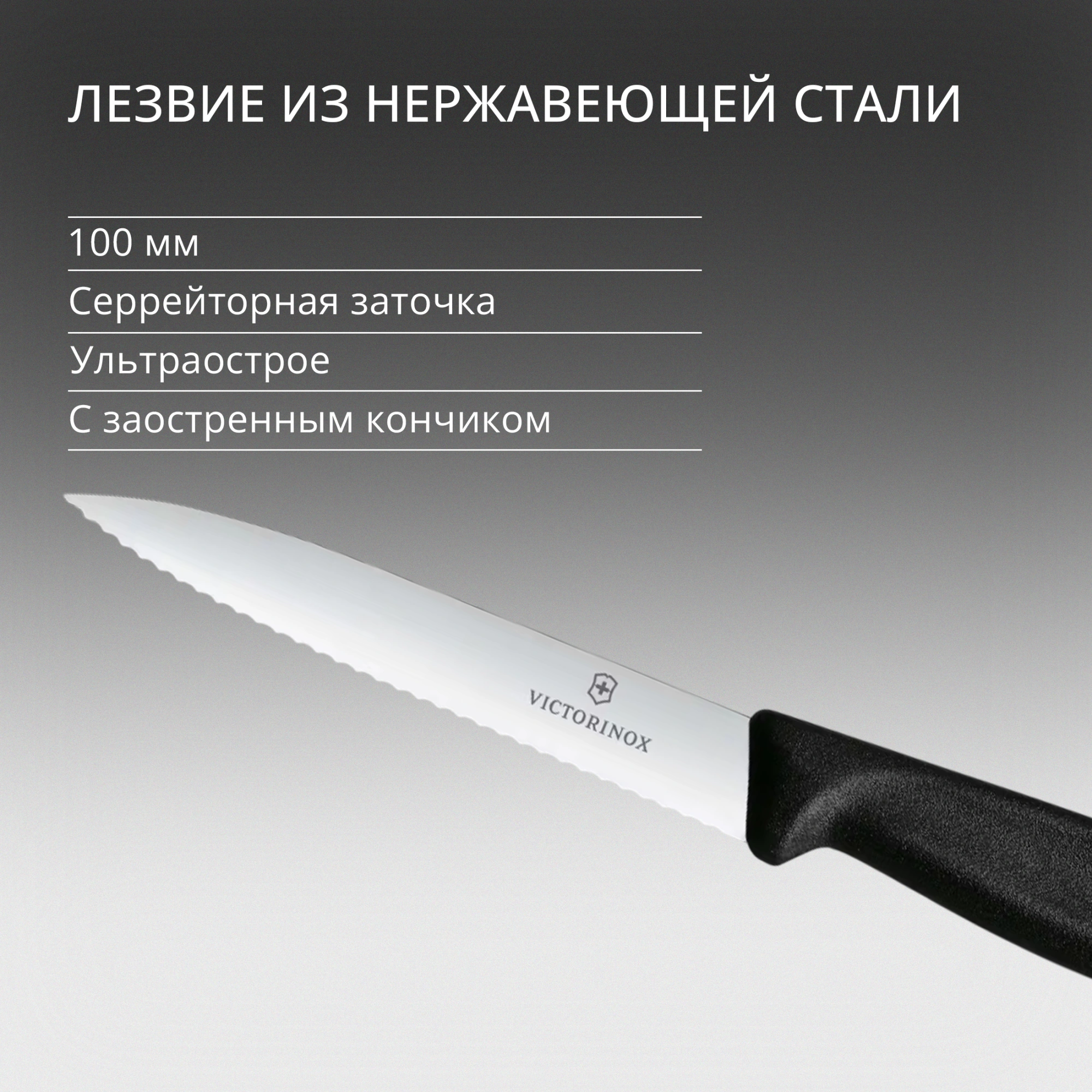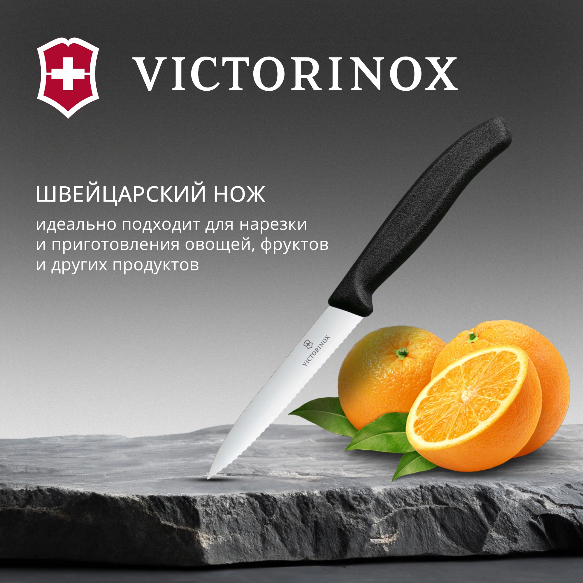Острый и удобный кухонный нож с серрейторной заточкой для измельчения, очистки фруктов и овощей, а также нарезки помидоров и сосисок Victorinox. Рукоять изготовлена из оранжевого матового полипропилена. Клинок выполнен из высококачественной нержавеющей стали