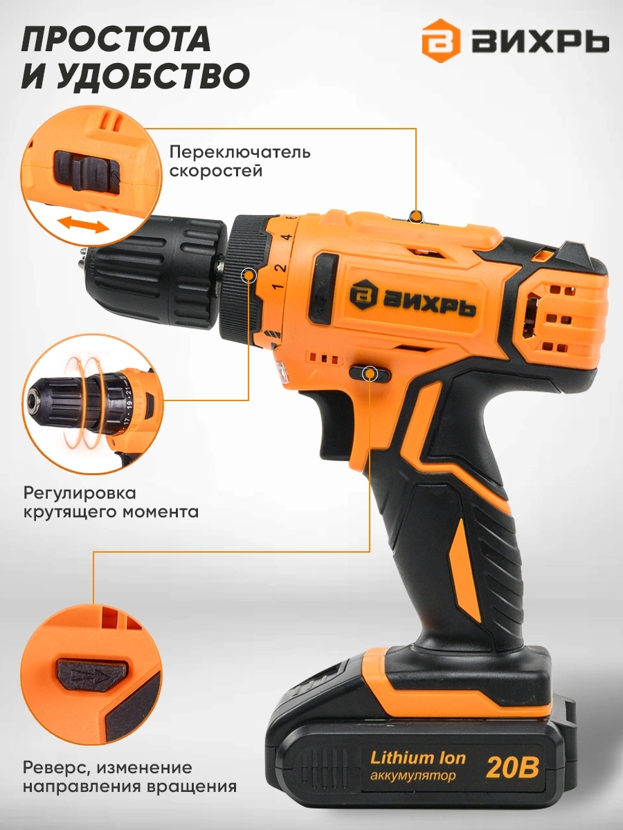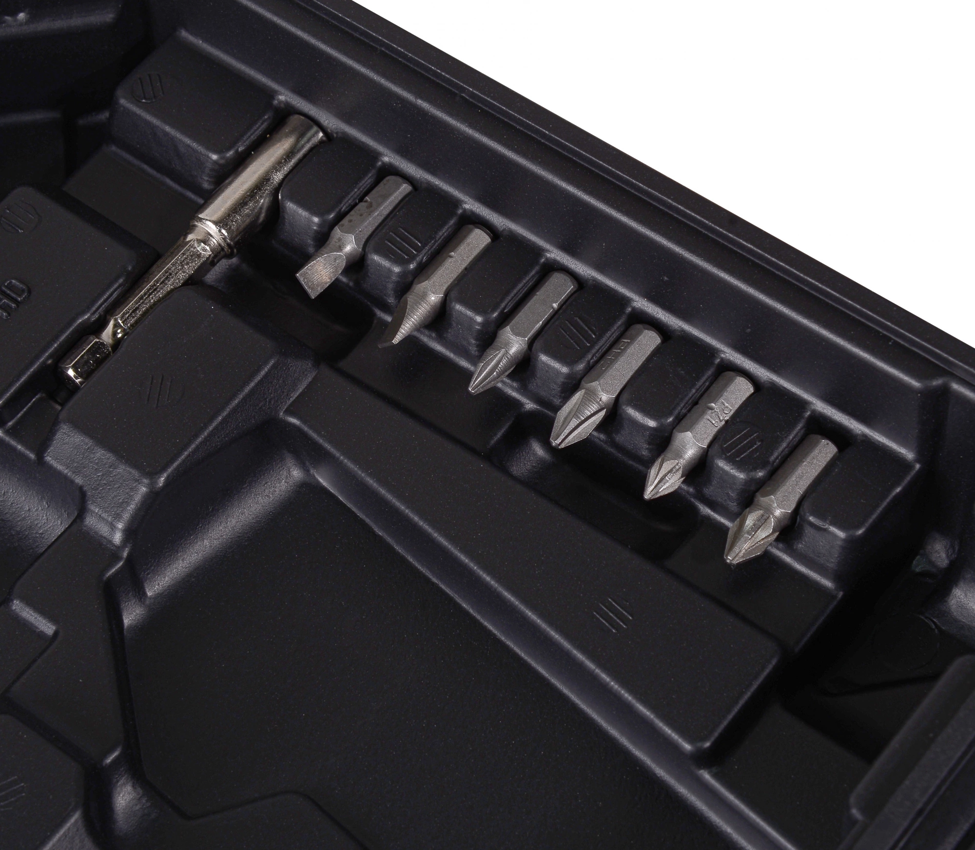 Аккумуляторная дрель-шуруповерт с аккумулятором; дополнительный аккумулятор; бита 6 шт.; адаптер-удлинитель для бит; адаптер питания; паспорт (инструкция), упаковка.