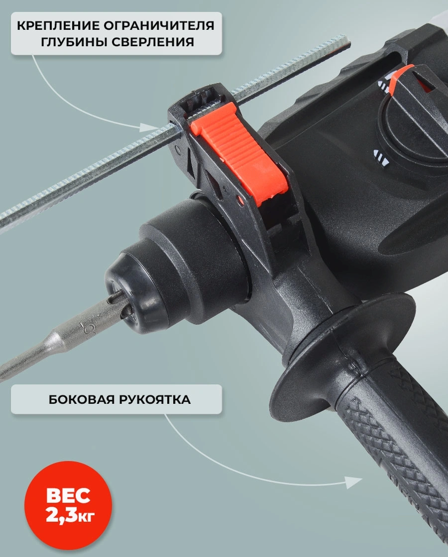 дополнительная рукоятка, ограничитель глубины сверления, предохранительная муфта, реверс