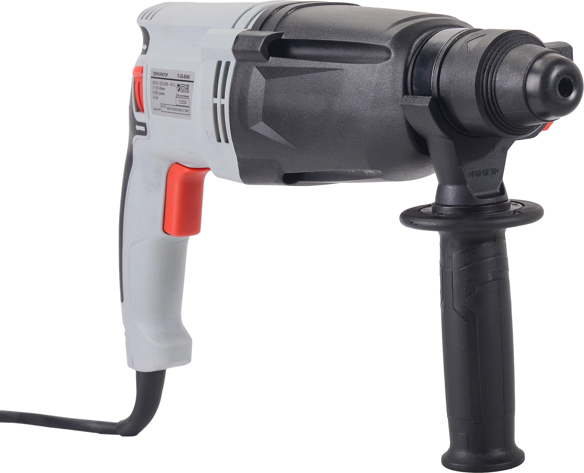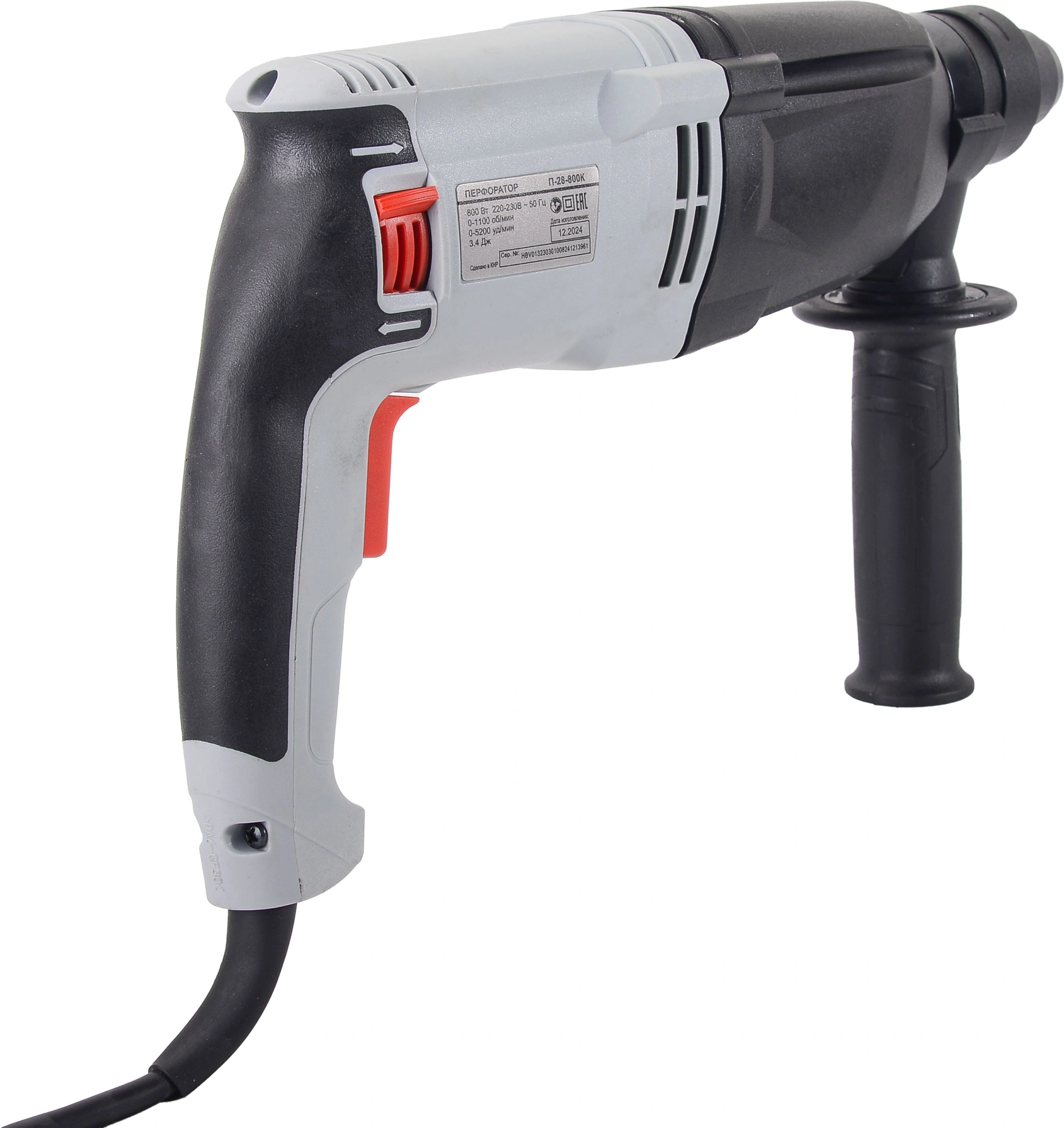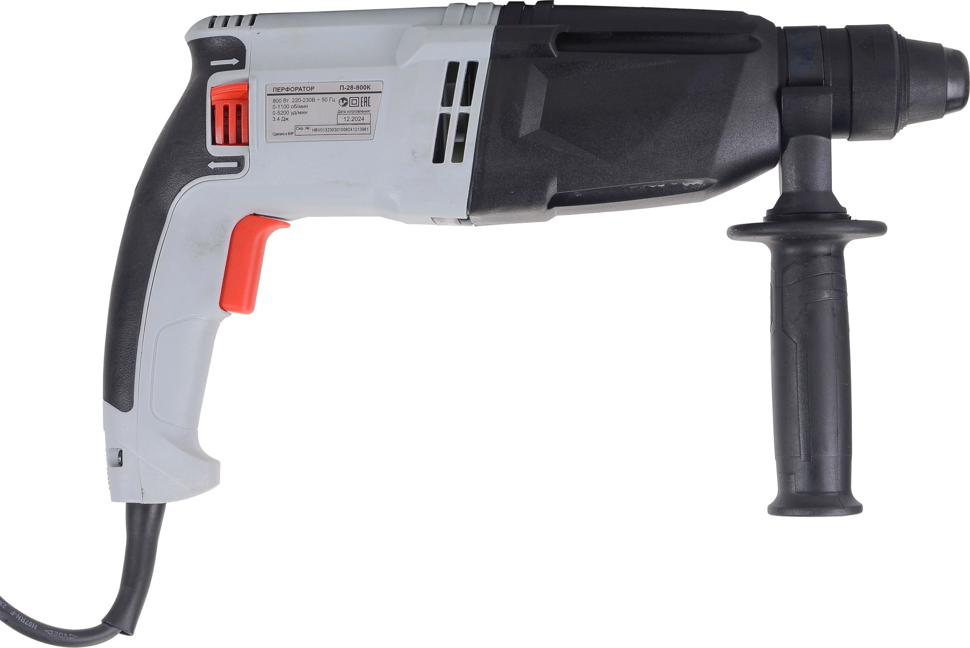 Перфоратор, ограничитель глубины сверления, боковая рукоятка, паспорт (инструкция), упаковка, кейс пластмассовый.