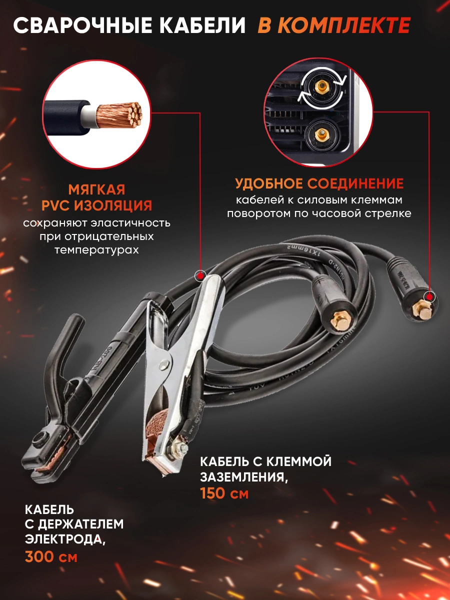Сварочный аппарат, кабель с электрододержателем, кабель с клеммой заземления, паспорт (инструкция), упаковка.