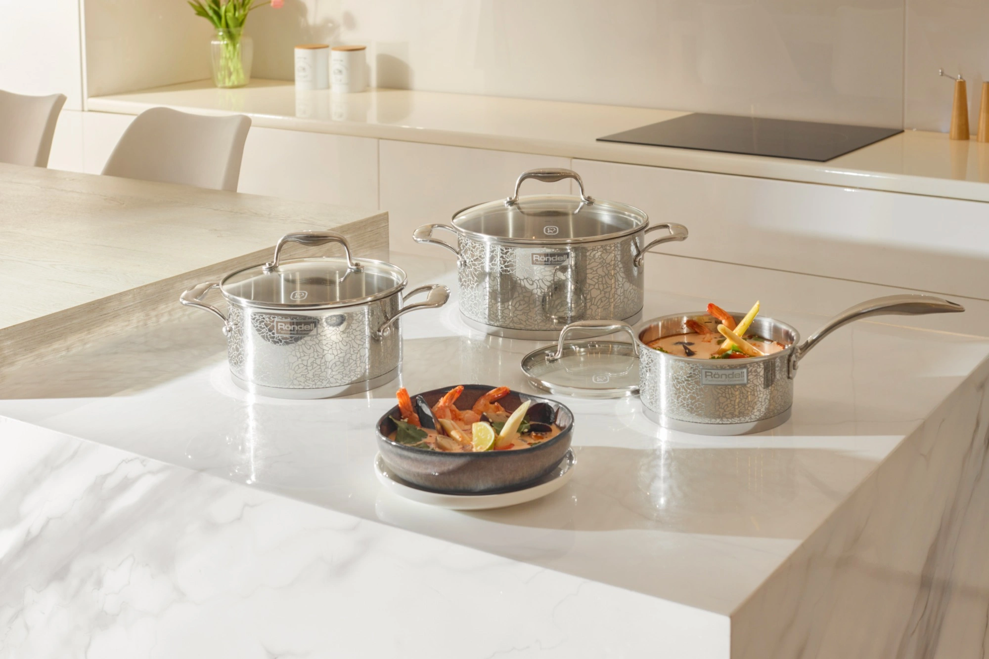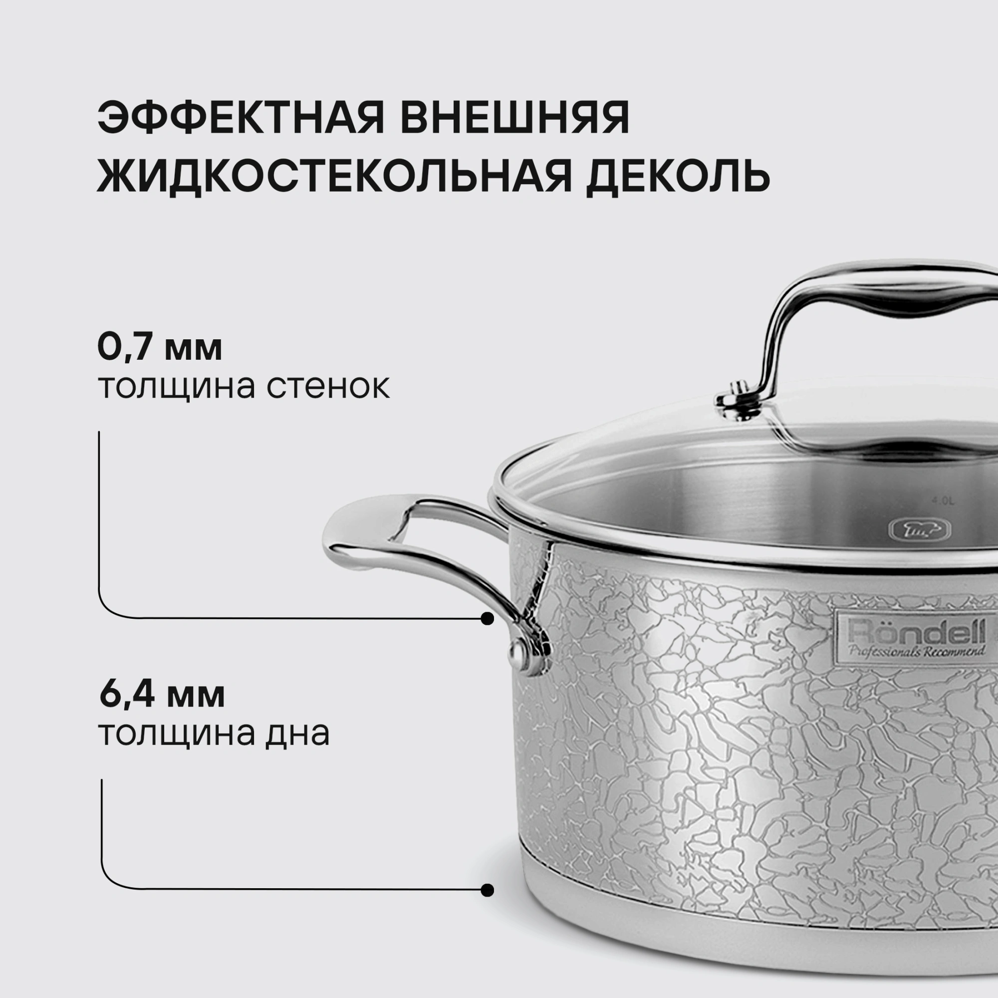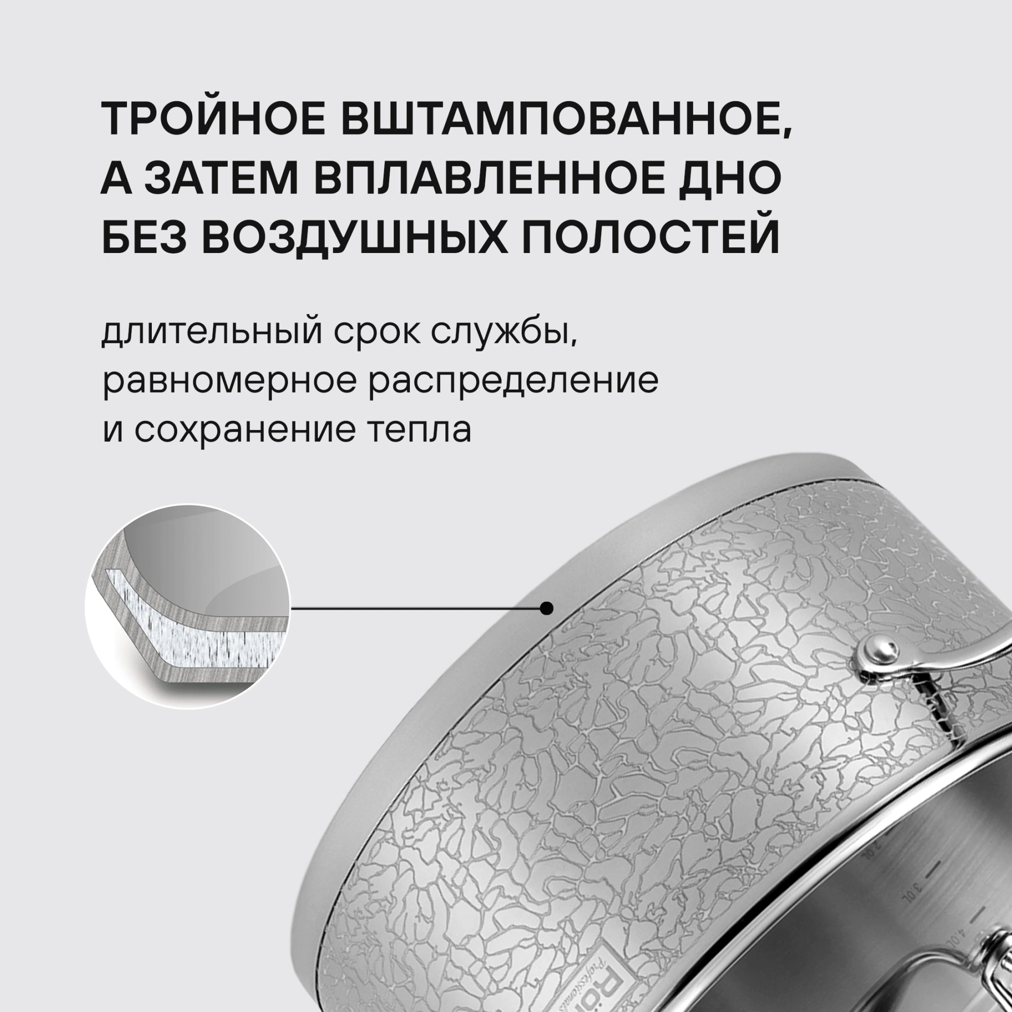 Материал: высококачественная нержавеющая сталь 18/10. Технология: тройное вштампованное, а затем вплавленное дно без воздушных полостей; жидкостекольная внешняя деколь. Внутреннее покрытие: . Толщина стенок: 0,7 мм. Толщина дна: 6,4 мм. Аксессуары: литые, из нержавеющей стали.