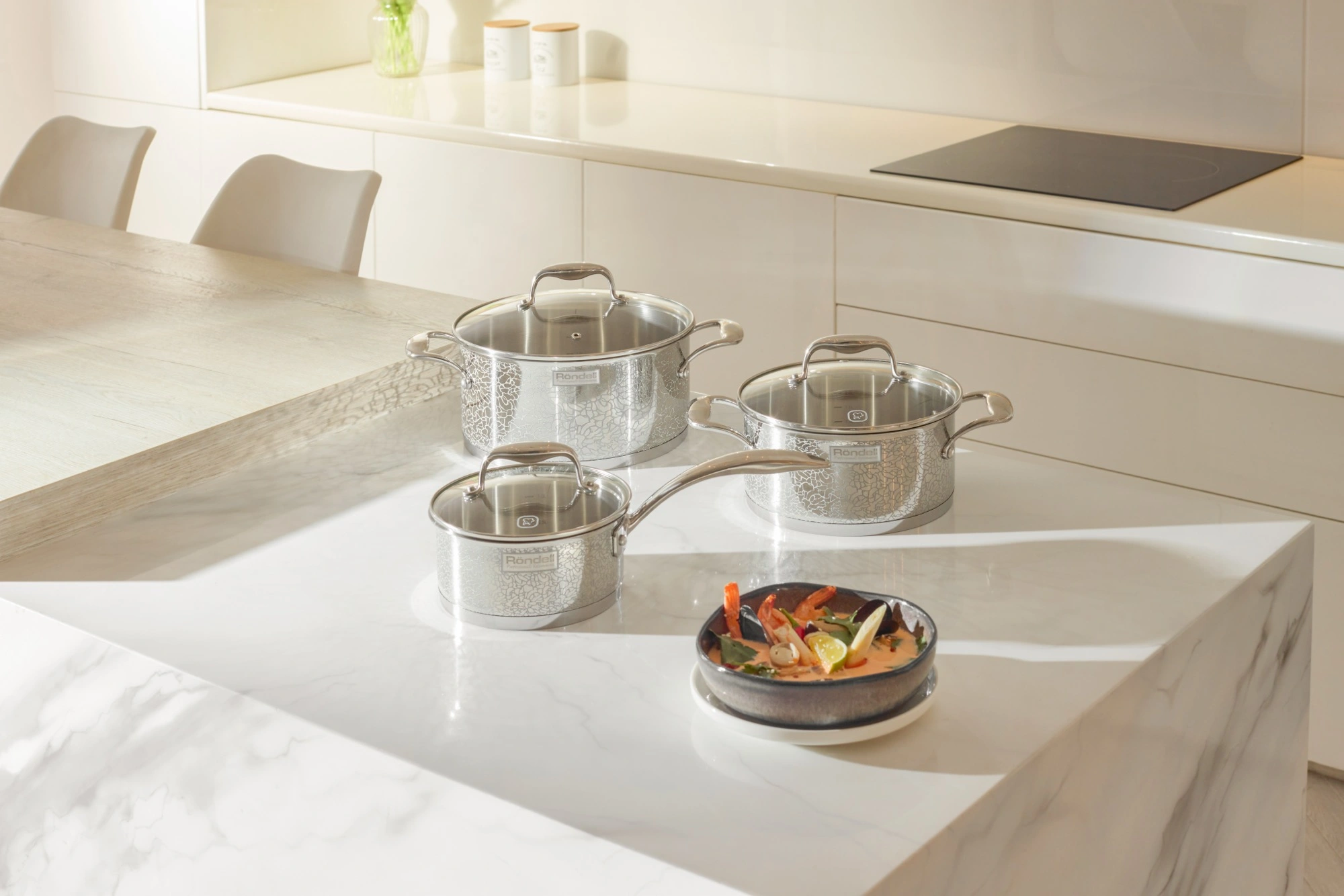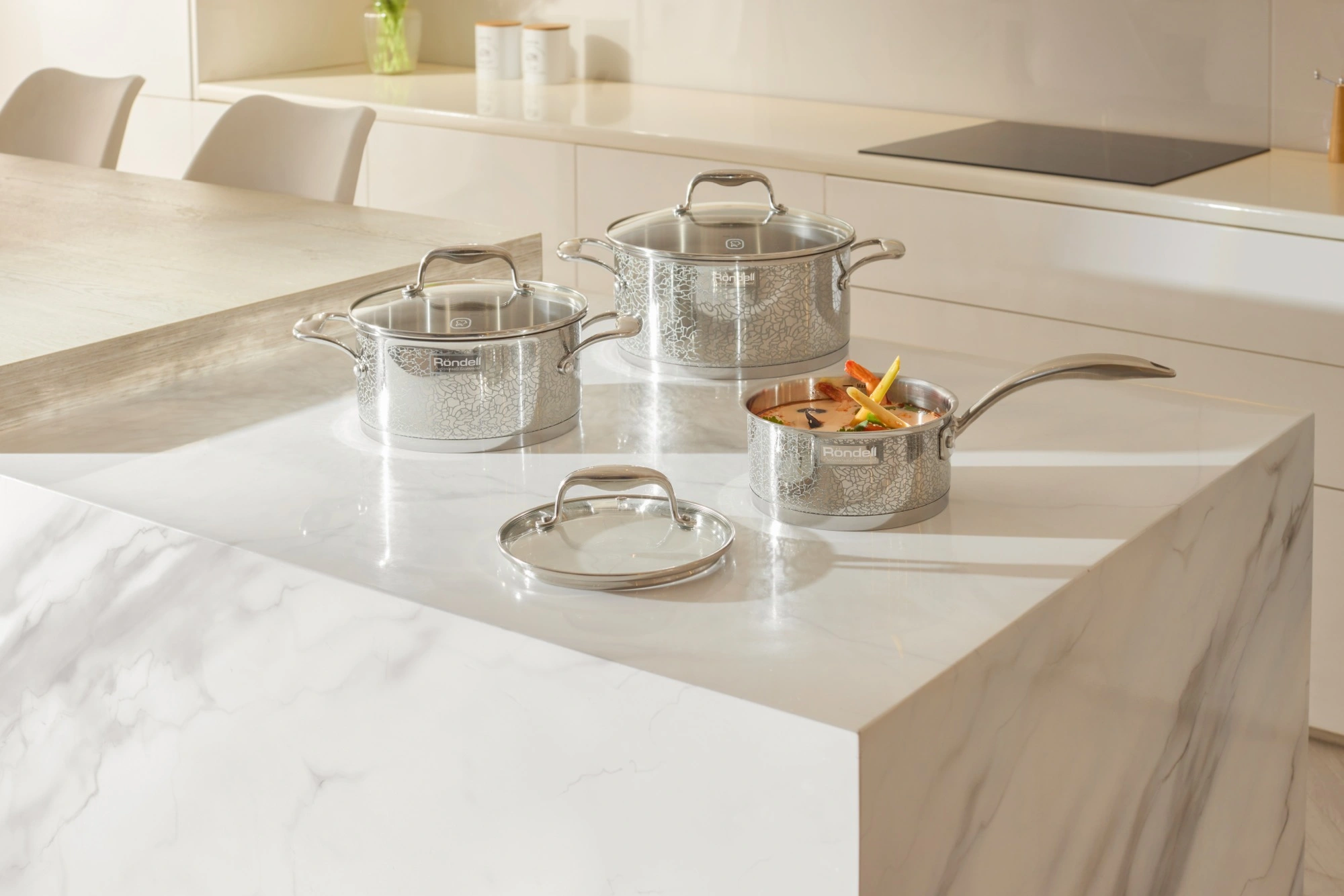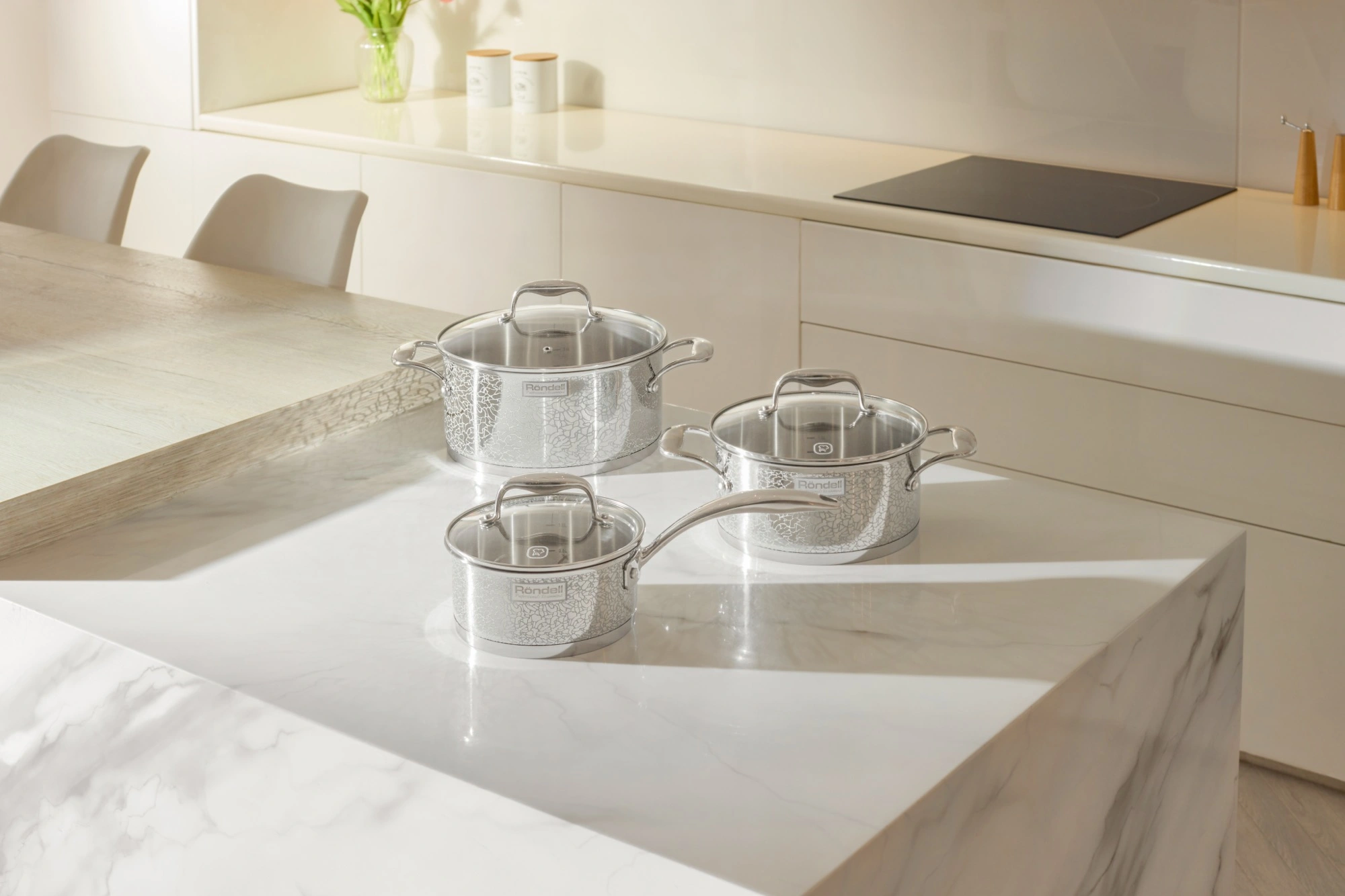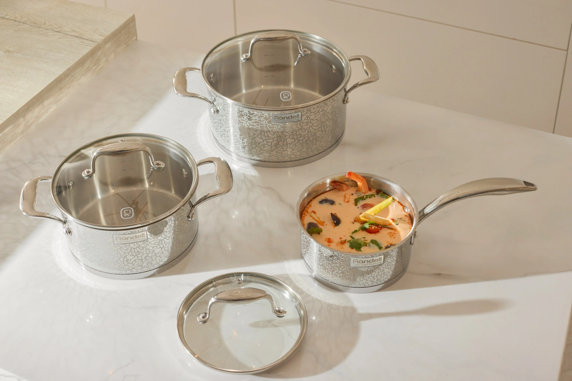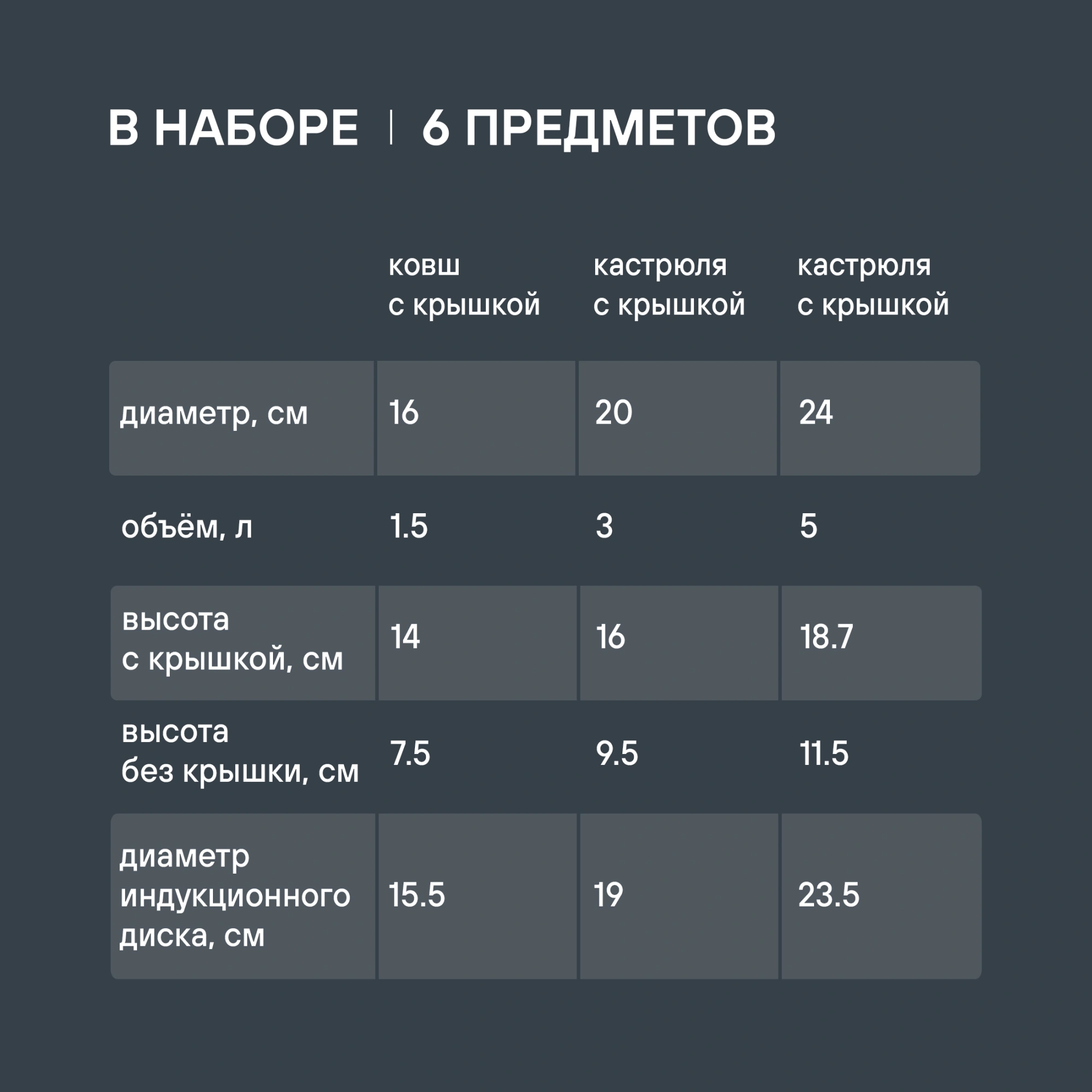 Ковш 16 см (1,5 л). Крышка 16 см. Кастрюля 20 см (3 л). Крышка 20 см. Кастрюля 24 см (5 л). Крышка 24 см