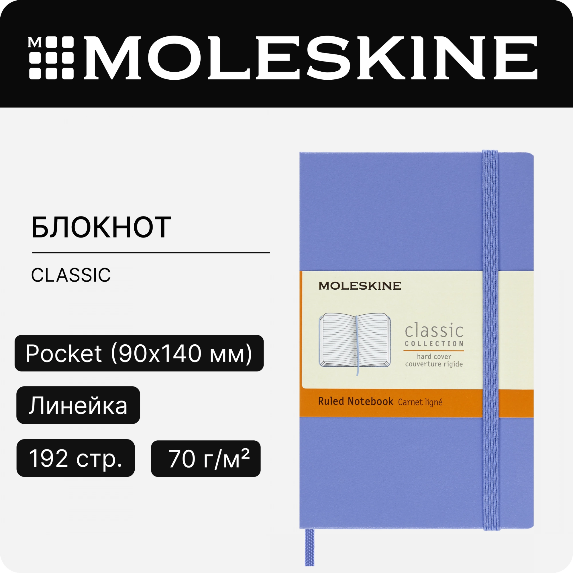 Блокнот Moleskine CLASSIC MM710B42 Pocket 90x140мм 192стр. линейка твердая обложка голубая гортензия