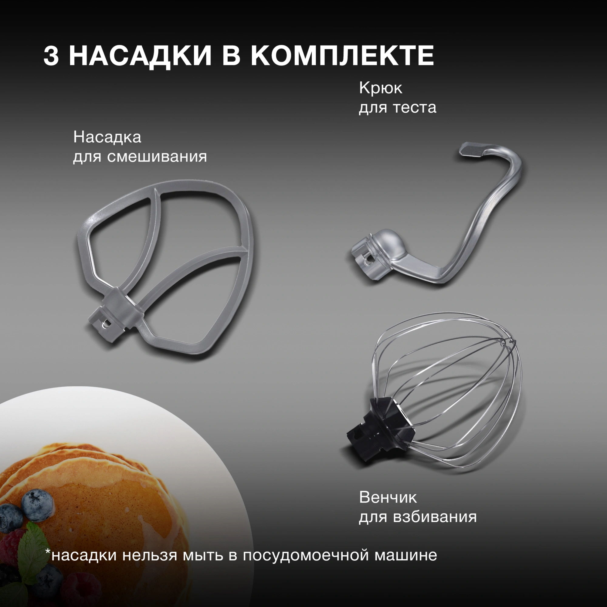 Миксер; чаша; защитная крышка для чаши; насадка-венчик; насадка-лопатка; насадка-крюк; инструкция с гарантийным талоном; книга рецептов