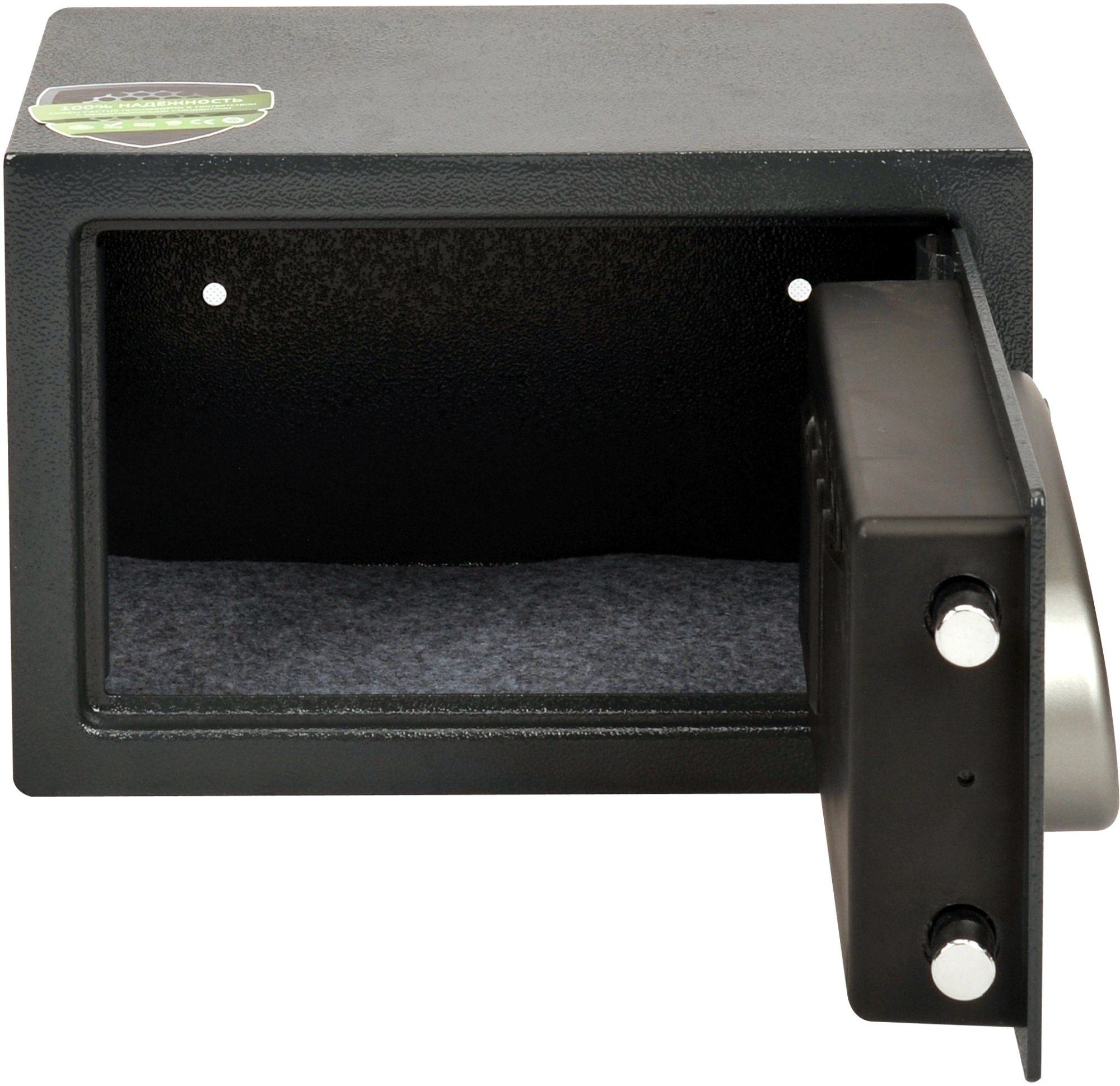 Электронный замок с индивидуальным кодом обеспечивает быстрый и удобный доступ только для владельца. В экстренных случаях предусмотрен аварийный ключ — вы всегда сможете открыть сейф, даже если разрядились батарейки или забыли код.