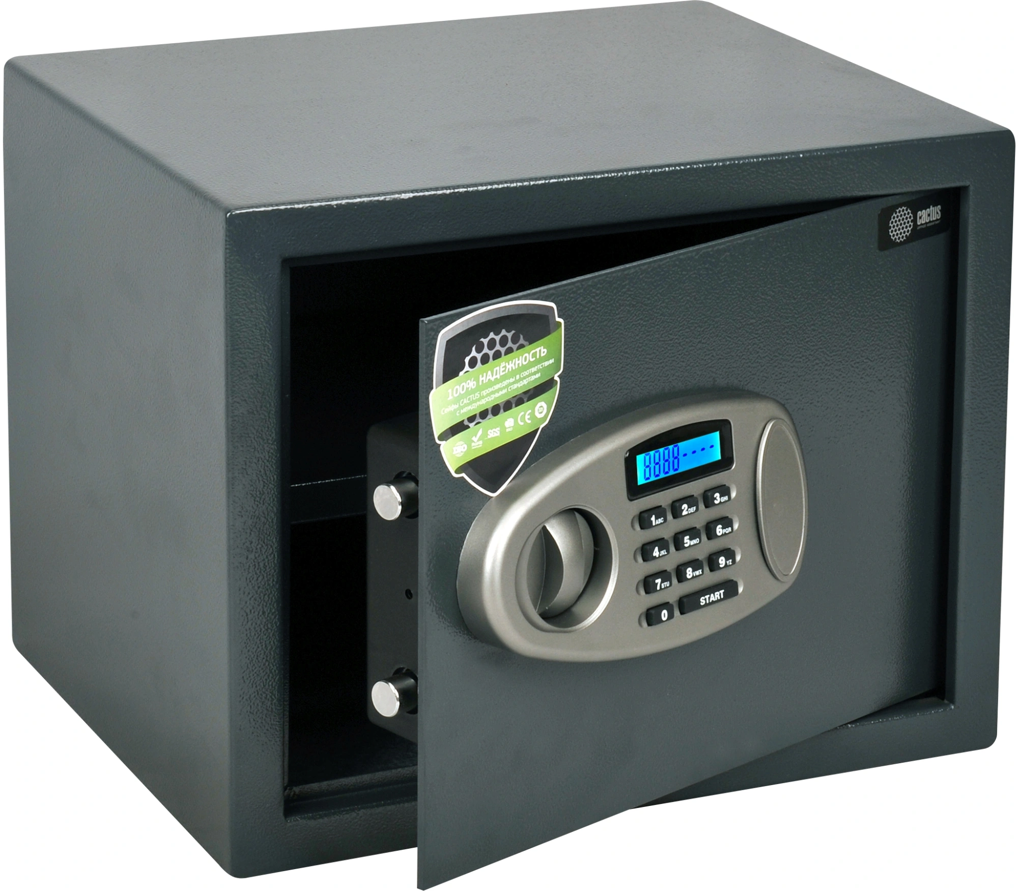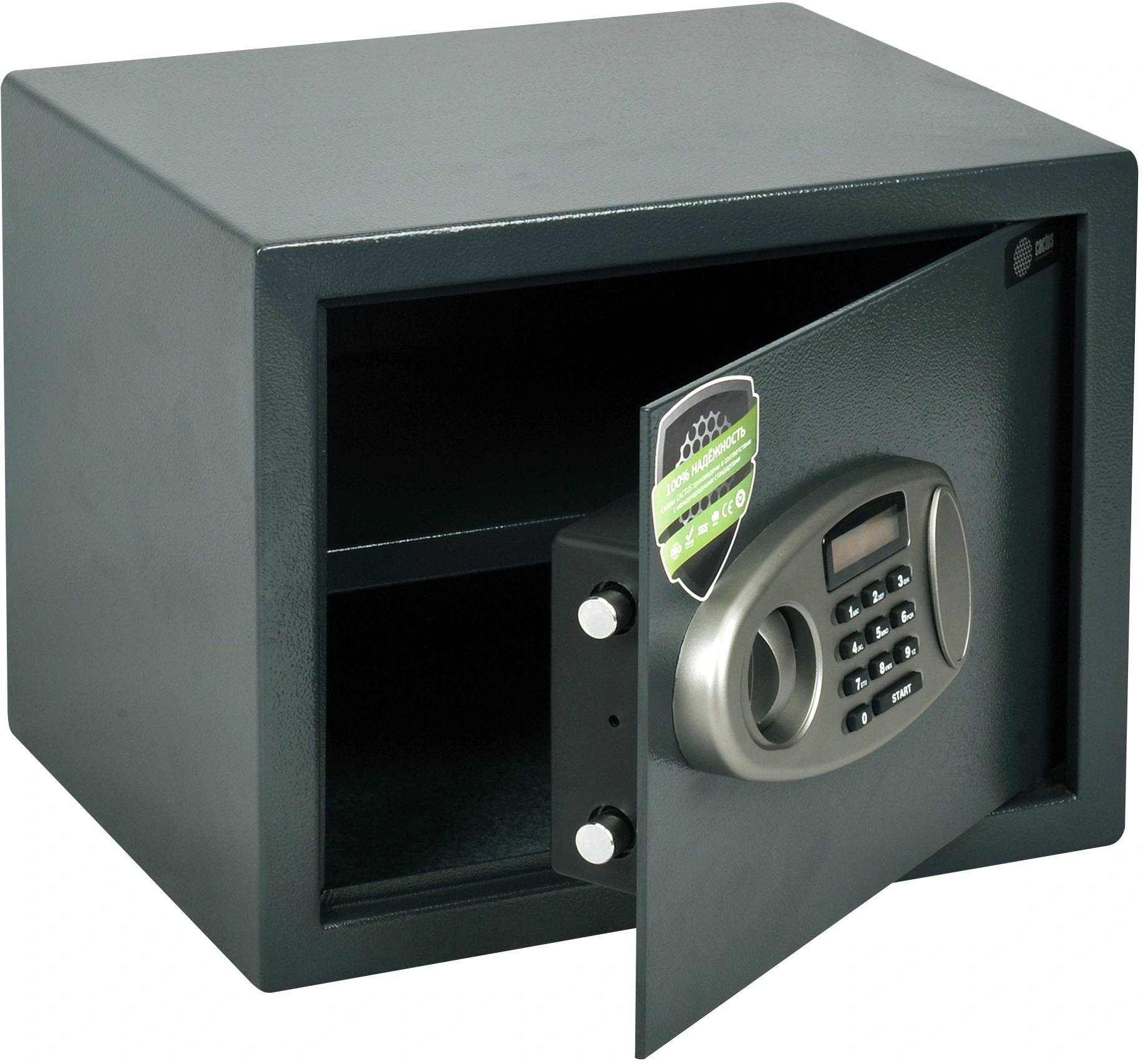 Электронный замок с индивидуальным кодом обеспечивает быстрый и удобный доступ только для владельца. В экстренных случаях предусмотрен аварийный ключ — сейф можно открыть даже при разряженных батарейках или забытом коде.