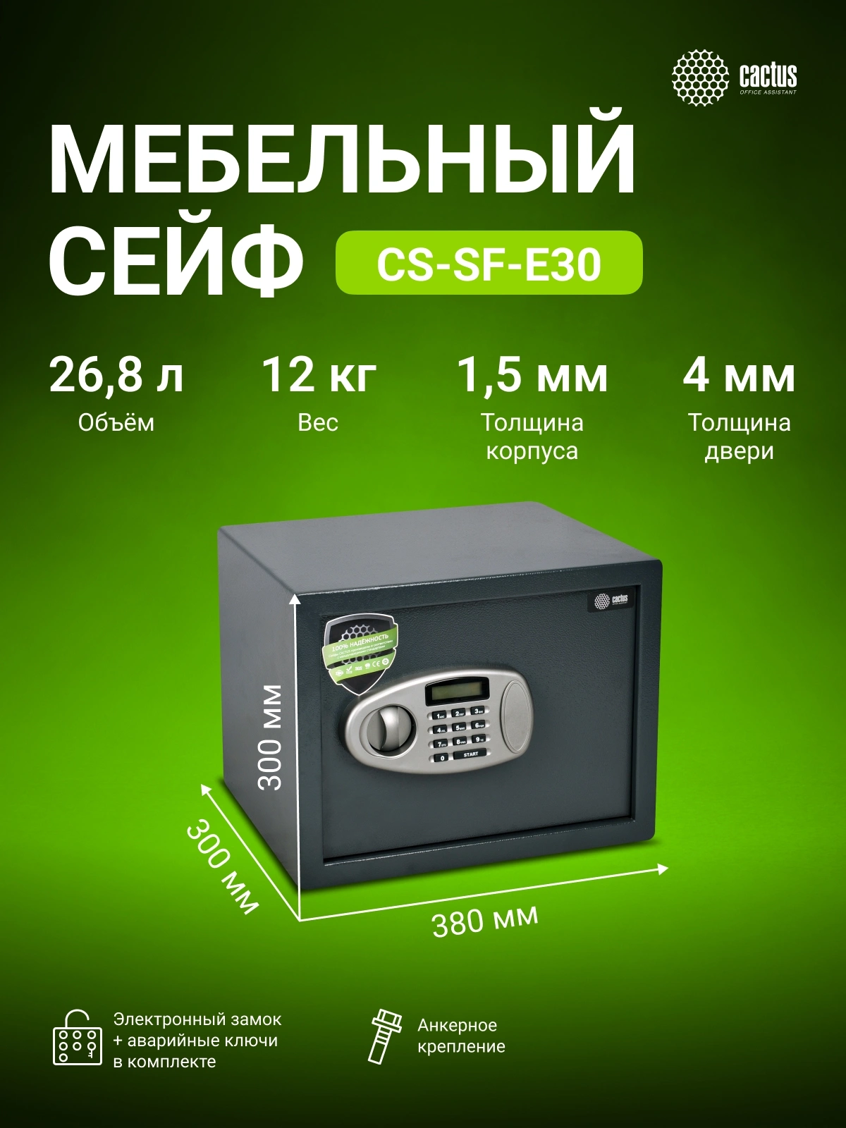 Cactus CS-SF-E30 — уверенность в сохранности ваших ценностей, современный дизайн и оптимальный выбор для тех, кто ищет вместительный, надёжный и доступный сейф.