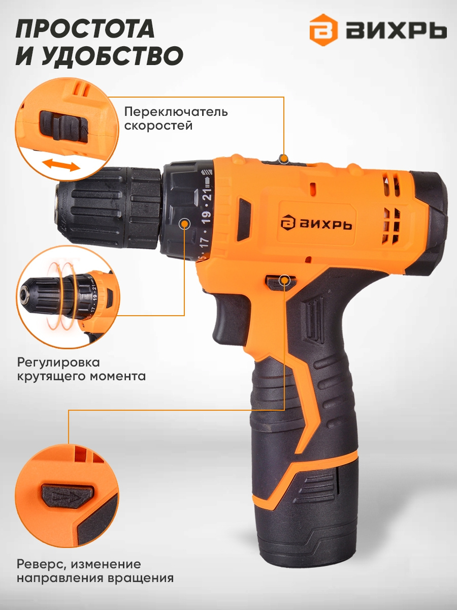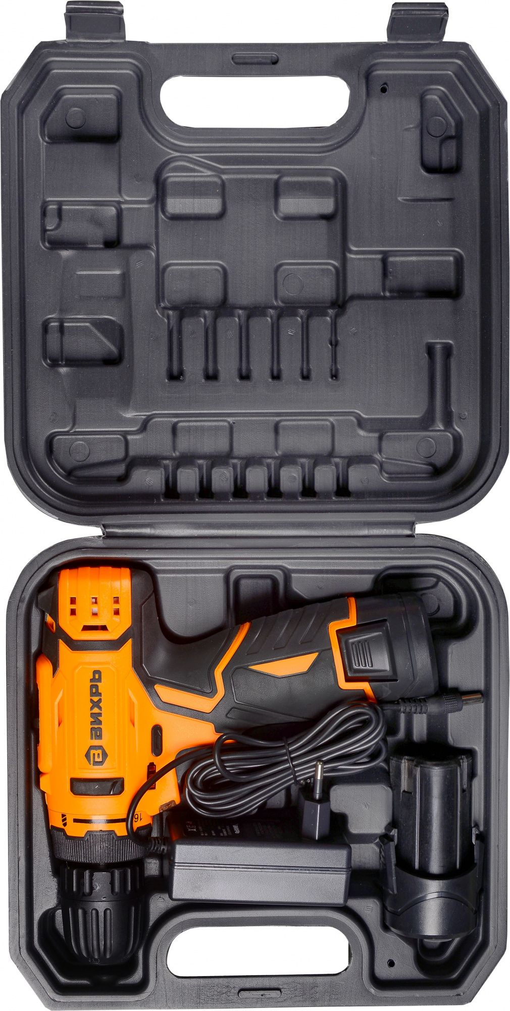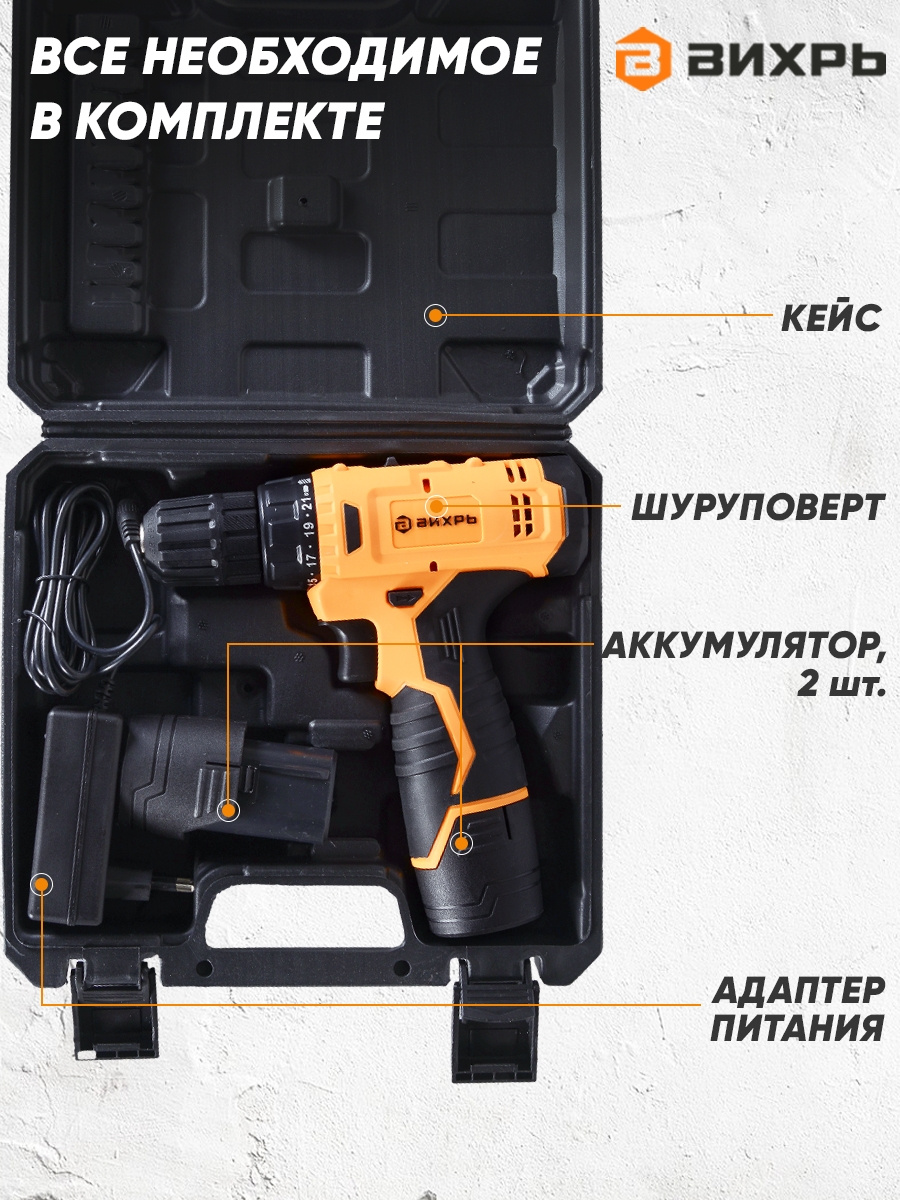 Дрель-шуруповерт, 2 аккумулятора, адаптер питания, инструкция, кейс.
