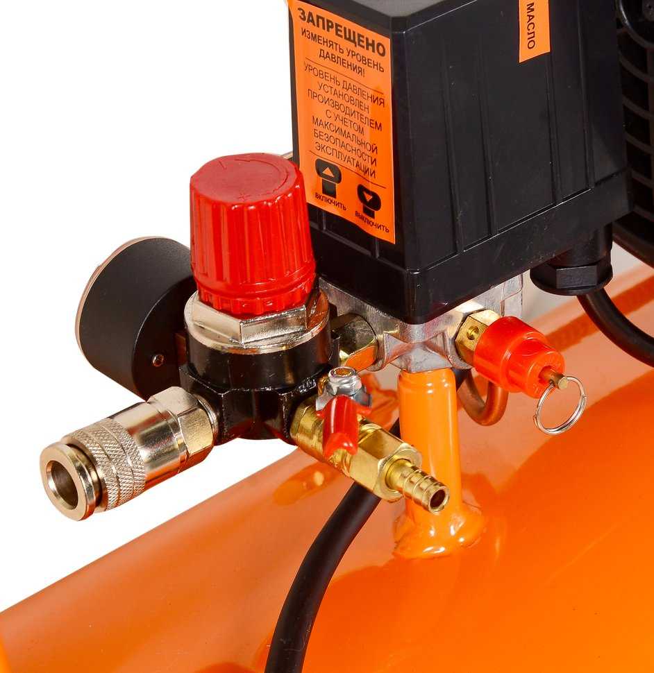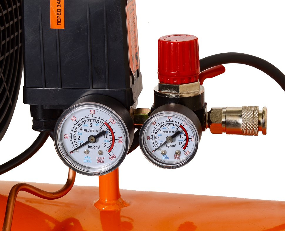 Оснащен регулятором давления, благодаря которому возможно изменять давление воздуха в диапазоне от 1 до 12,5 атм; Уровень масла в любой момент можно проверить через специальное окно; Имеется воздушный фильтр для очистки всасываемого воздуха и предохранения поршневой группы от пыли и грязи.