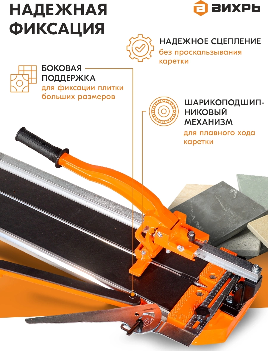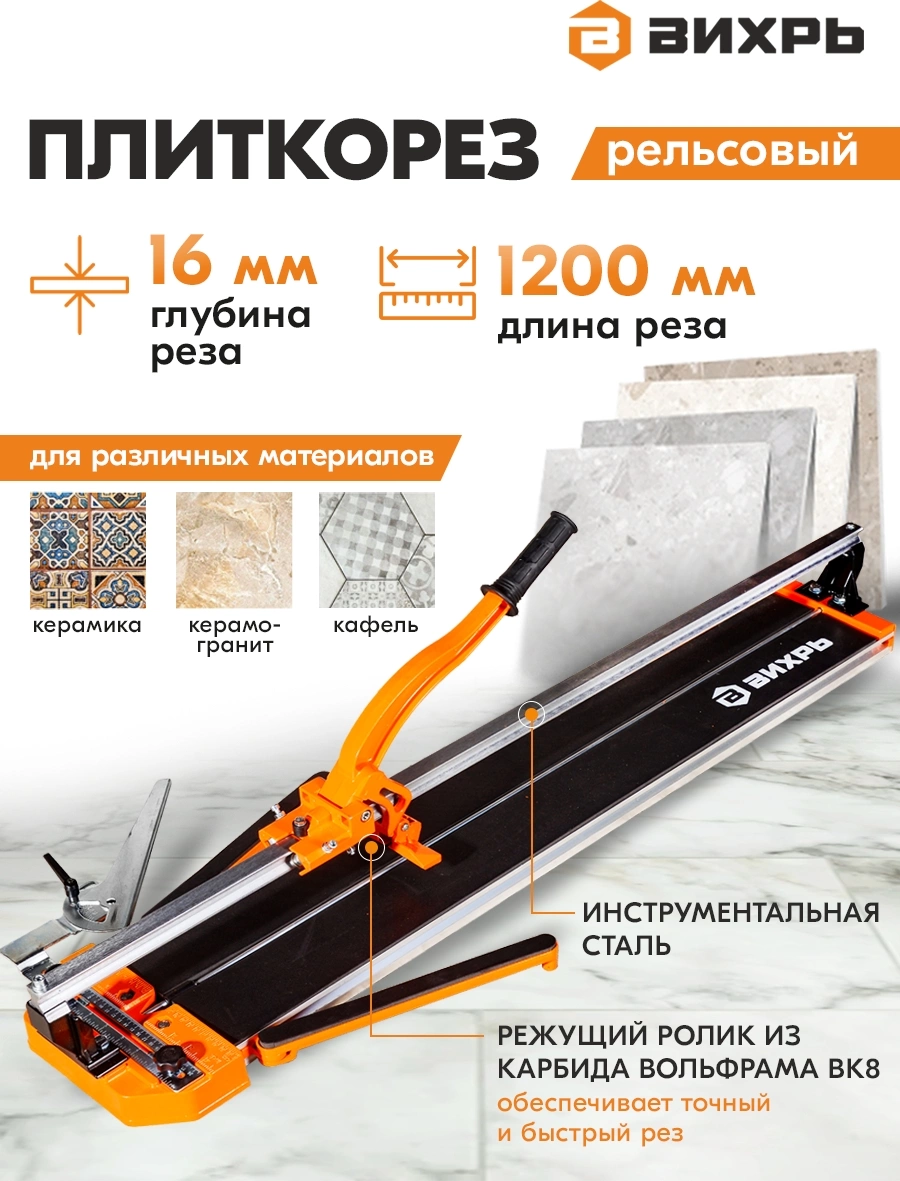 Плиткорез рельсовый 1200 мм Вихрь используется для резки керамической кафельной плитки длиной до 1200 мм.