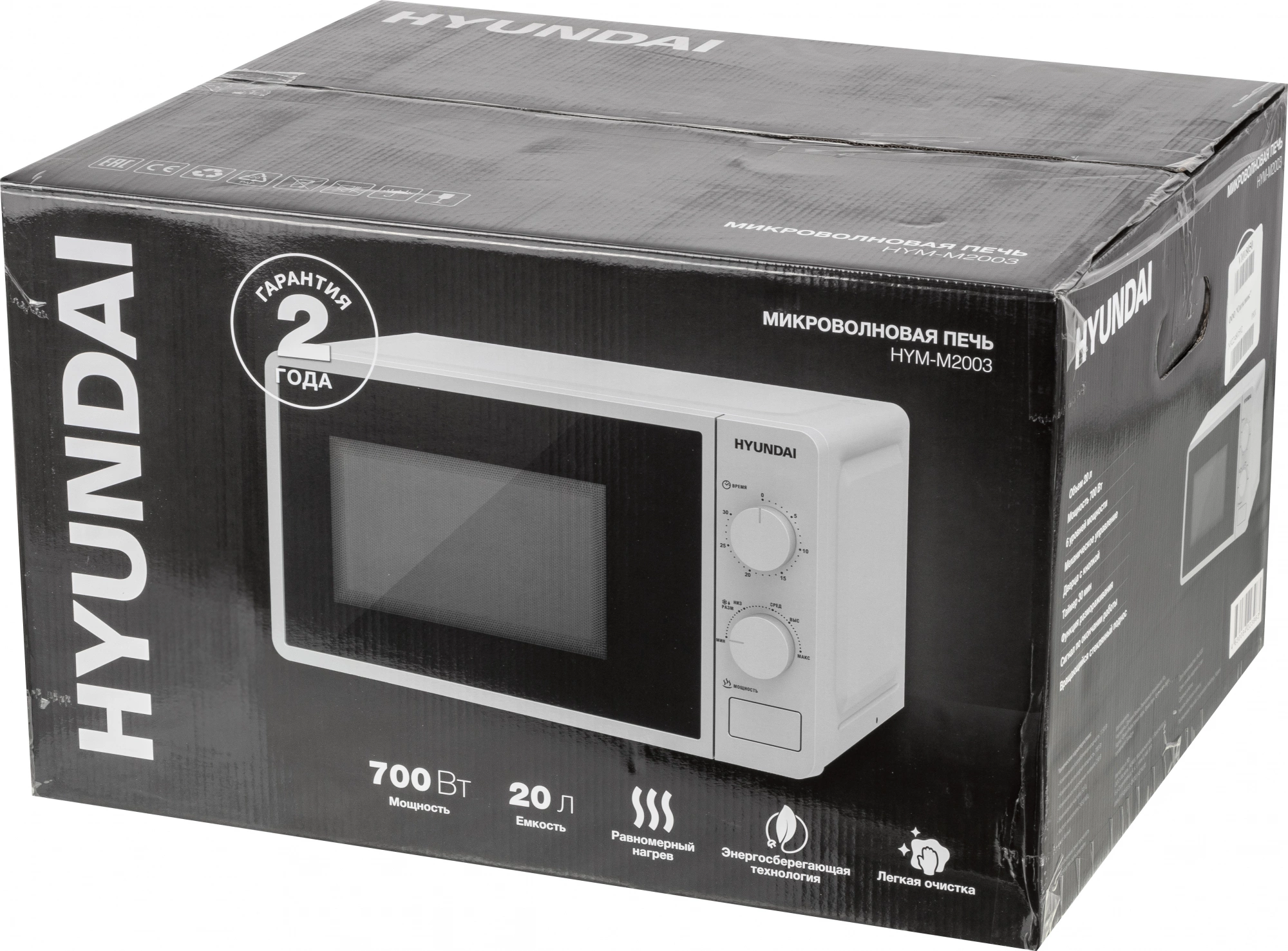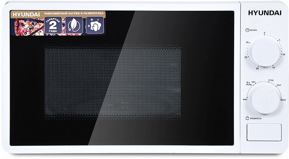 СВЧ Hyundai HYM-M2003 – модель, обладающая базовым набором таких функций, как разогрев уже готовой пищи и разморозка продуктов. Управление осуществляется с помощью двух механических поворотных ручек, с помощью которых можно задать нужную мощность и время приготовления. После завершения процесса прозвучит приятный звуковой сигнал. Набор опций простой и понятный, не содержит ничего лишнего. Внутренняя поверхность из специальной гладкой эмали очень хорошо моется, можно легко справиться с любыми загрязнениями. Компактные размеры устройства помогут разместить его на любой кухне. Внешний вид универсальный, металлический корпус окрашен в серебристый цвет, поэтому микроволновка лаконично впишется в любой интерьер. Дверка из затемненного полупрозрачного стекла станет удачным дополнением общего стиля.