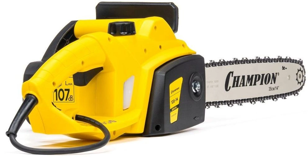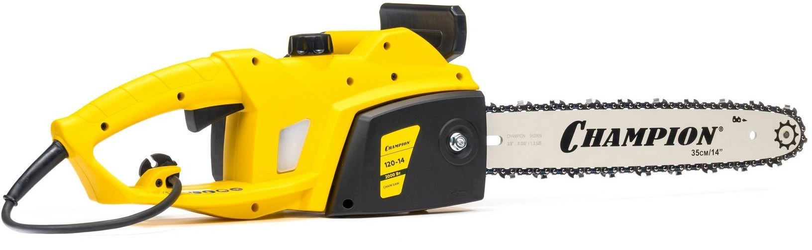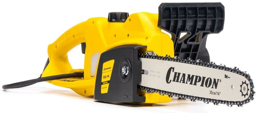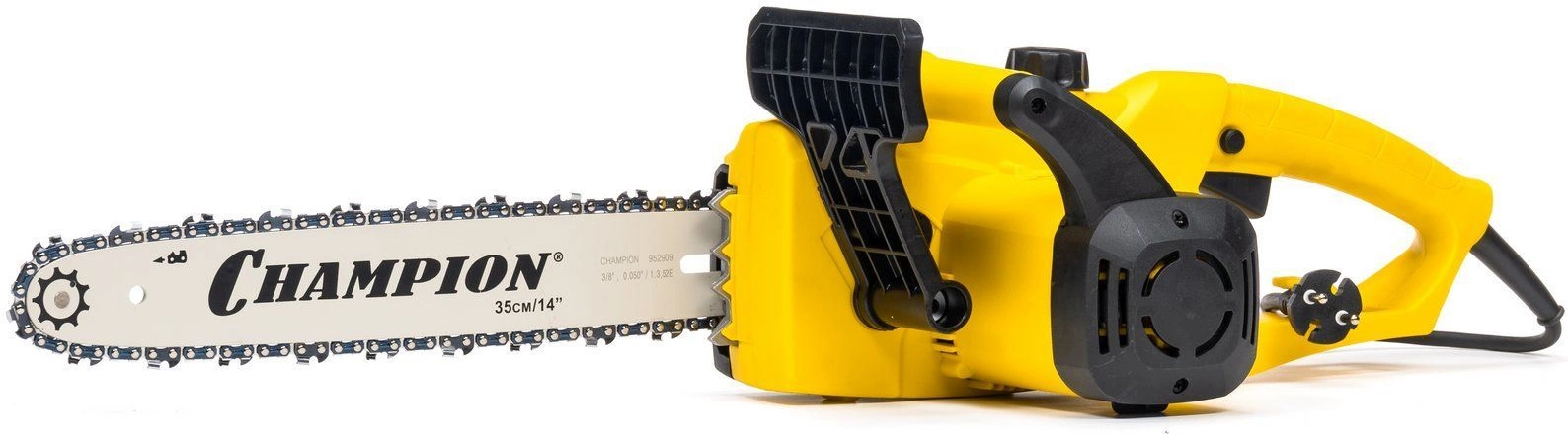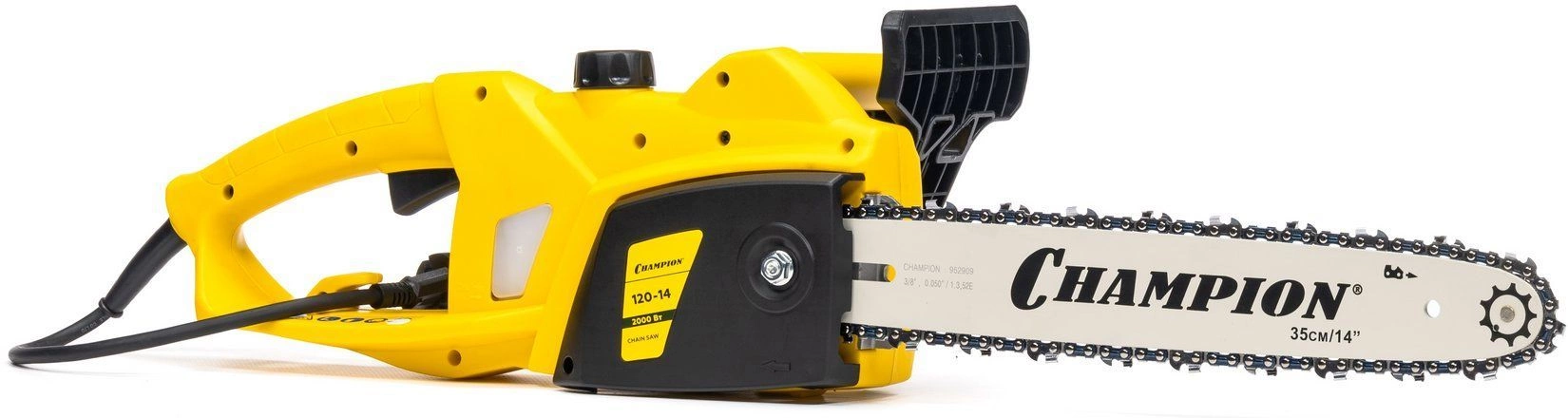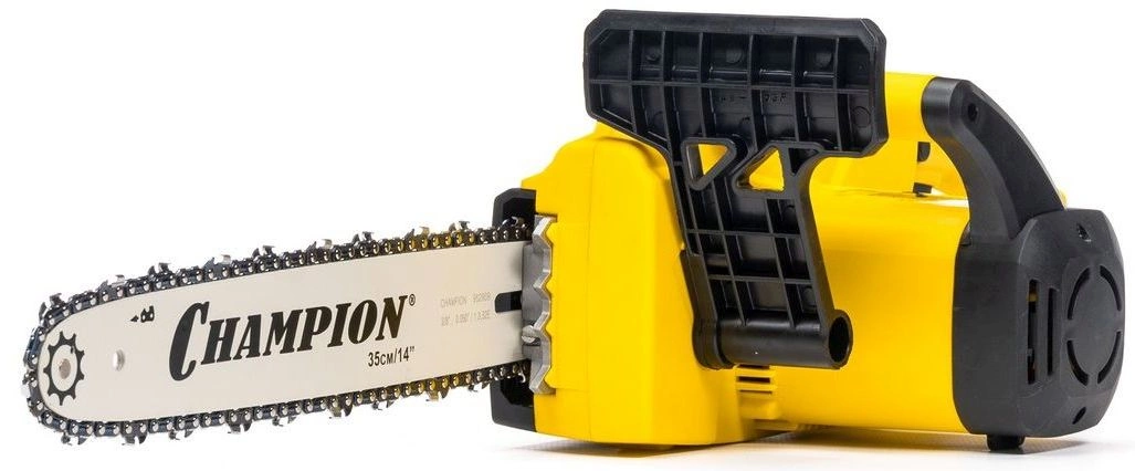 Пила цепная электрическая, шина Champion 14"-3/8-1.3-52, цепь Champion 3/8-1.3мм-52, чехол для шины Champion 14", ключ-отвертка для установки шины и цепи, руководство по эксплуатации, упаковка.