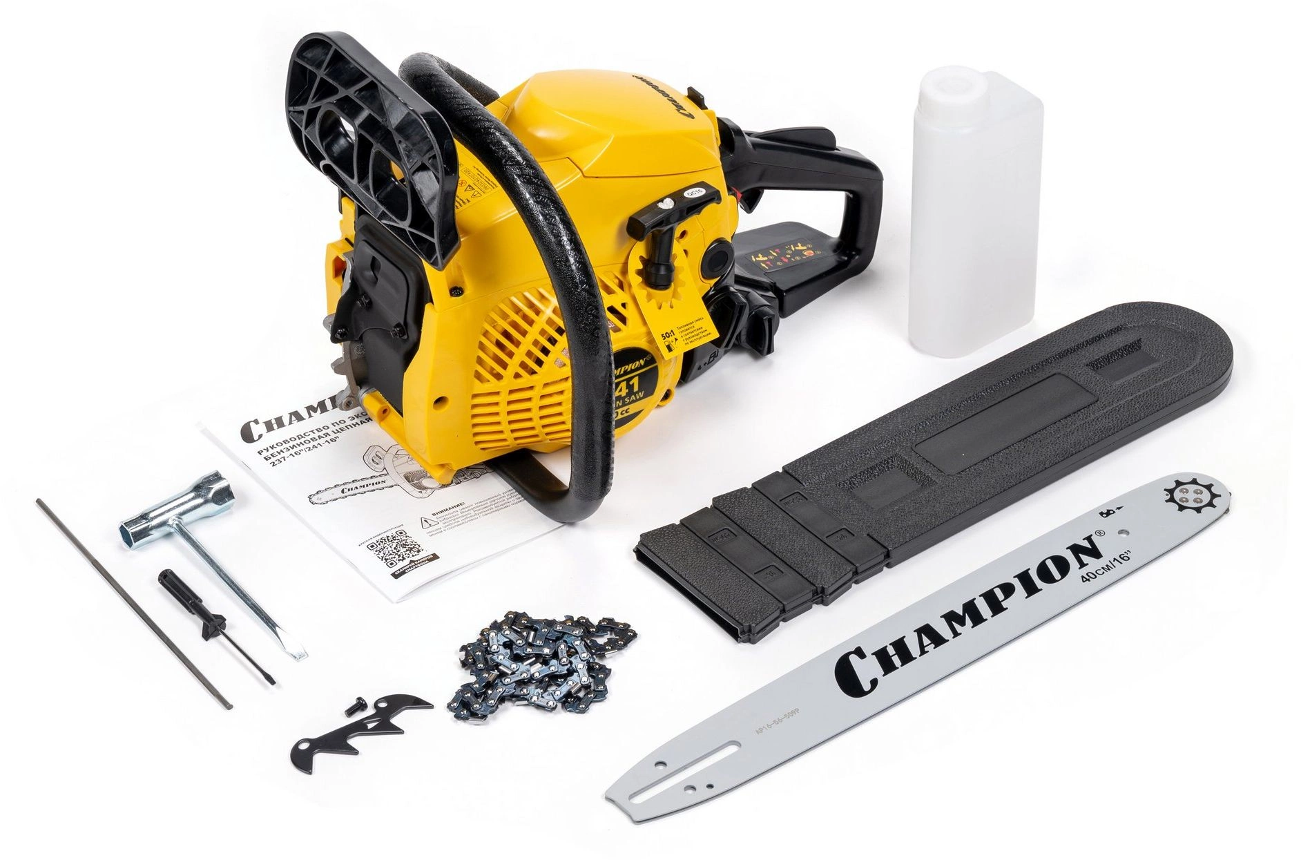 Бензопила, пильная шина, цепь, свечной ключ, емкость для приготовления топливной смеси, отвертка для настройки карбюратора, инструкция, упаковка.